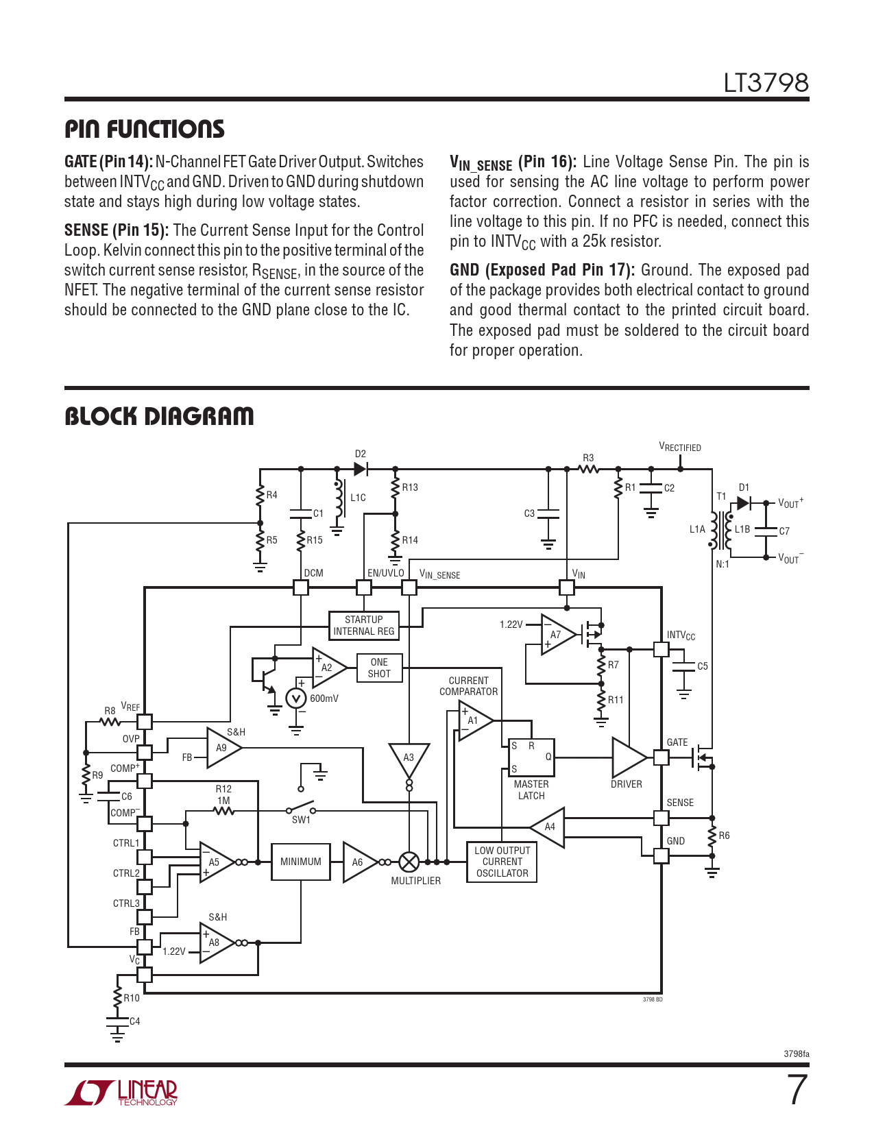 LT3798 PIN FUNCTIONS GATE (Pin 14): N-Channel FET Gate Driver Output. Switches VIN_SENSE (Pin 16): Line Voltage Sense Pin. The pin is between INTVCC and GND. Driven to GND during shutdown used for sensing the AC line voltage to perform power state and stays high during low voltage states. factor correction. Connect a resistor in series with the SENSE (Pin 15): The Current Sense Input for the Control line voltage to this pin. If no PFC is needed, connect this Loop. Kelvin connect this pin to the positive terminal of the pin to INTVCC with a 25k resistor. switch current sense resistor, RSENSE, in the source of the GND (Exposed Pad Pin 17): Ground. The exposed pad NFET. The negative terminal of the current sense resistor of the package provides both electrical contact to ground should be connected to the GND plane close to the IC. and good thermal contact to the printed circuit board. The exposed pad must be soldered to the circuit board for proper operation. BLOCK DIAGRAM VRECTIFIED D2 R3 • R13 R1 C2 D1 R4 L1C T1 V + OUT C1 C3 L1A L1B C7 R5 R15 R14 V – OUT N:1 DCM EN/UVLO VIN_SENSE VIN STARTUP 1.22V – INTERNAL REG INTVCC +A7 + ONE R7 C5 + SHOT –A2 CURRENT COMPARATOR 600mV V R11 REF R8 – + S&H –A1 OVP A9 S R GATE FB A3 Q COMP+ S R9 R12 MASTER DRIVER C6 1M LATCH SENSE COMP– SW1 A4 R6 CTRL1 GND LOW OUTPUT – MINIMUM CURRENT CTRL2 +A5 A6 OSCILLATOR MULTIPLIER CTRL3 S&H FB + 1.22V –A8 VC R10 3798 BD C4 3798fa 7 Document Outline Description Features Applications Typical Application Absolute Maximum Ratings Pin Configuration Order Information Electrical Characteristics Typical Performance Characteristics Pin Functions Block Diagram Operation Typical Applications Package Description Revision History Typical Application Related Parts