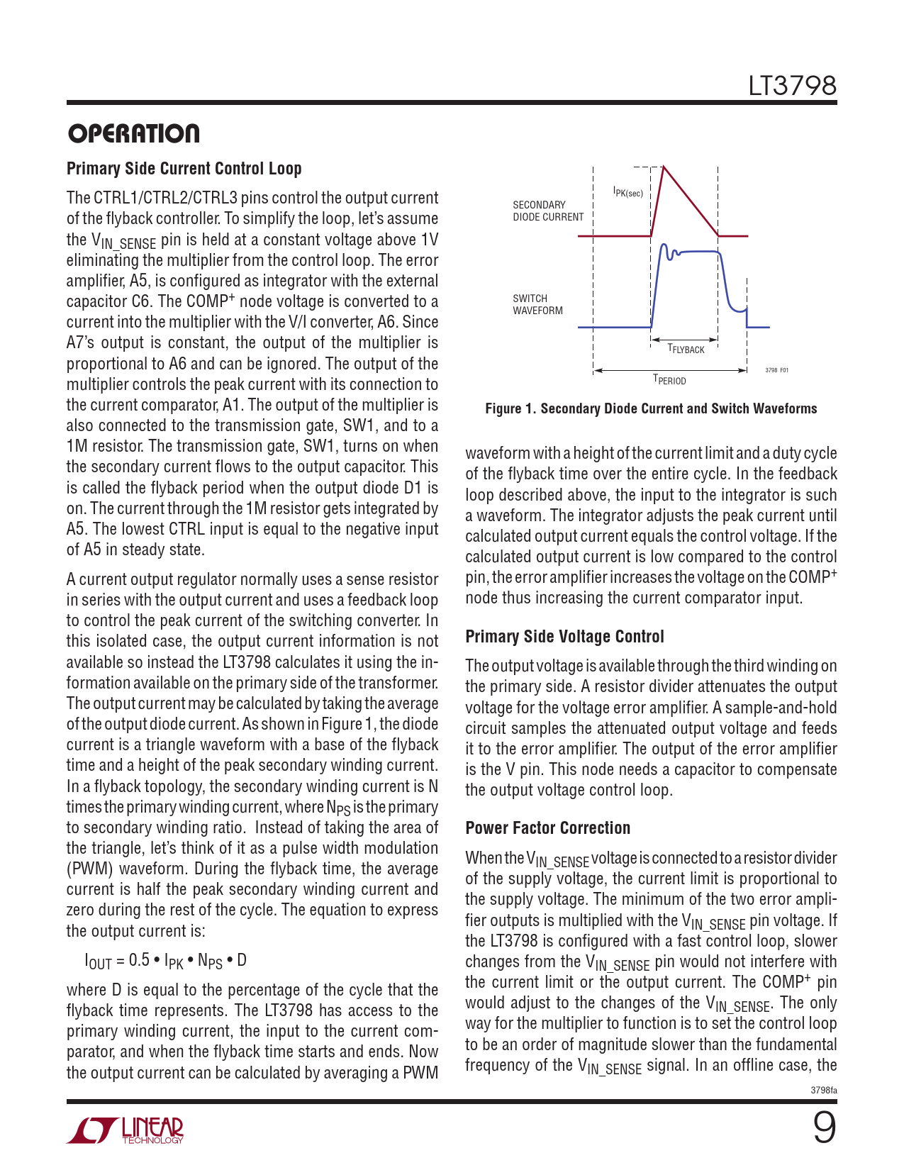 The CTRL1/CTRL2/CTRL3 pins control the output current IPK(sec) SECONDARY of the flyback controller. To simplify the loop, let’s assume DIODE CURRENT the VIN_SENSE pin is held at a constant voltage above 1V eliminating the multiplier from the control loop. The error amplifier, A5, is configured as integrator with the external capacitor C6. The COMP+ node voltage is converted to a SWITCH WAVEFORM current into the multiplier with the V/I converter, A6. Since A7’s output is constant, the output of the multiplier is TFLYBACK proportional to A6 and can be ignored. The output of the 3798 F01 multiplier controls the peak current with its connection to TPERIOD the current comparator, A1. The output of the multiplier is
