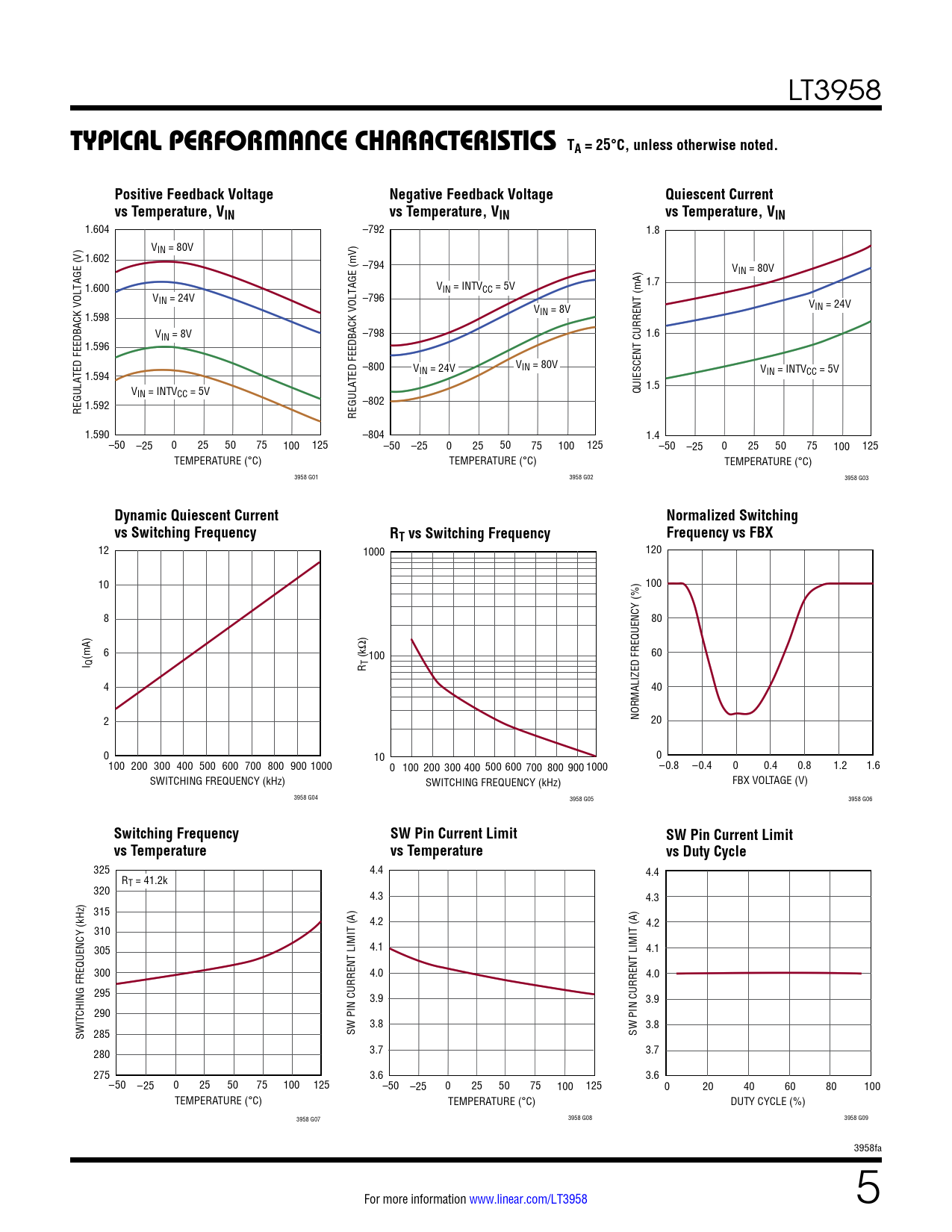 1.604 –792 1.8 VIN = 80V 1.602 –794 VIN = 80V 1.600 V 1.7 IN = INTVCC = 5V VIN = 24V –796 V VIN = 24V 1.598 IN = 8V VIN = 8V –798 1.6 1.596 –800 VIN = 80V V V 1.594 IN = 24V IN = INTVCC = 5V V 1.5 IN = INTVCC = 5V QUIESCENT CURRENT (mA) –802 REGULATED FEEDBACK VOLTAGE (V) 1.592 REGULATED FEEDBACK VOLTAGE (mV) 1.590 –804 1.4 –50 –25 0 25 50 75 100 125 –50 –25 0 25 50 75 100 125 –50 –25 0 25 50 75 100 125 TEMPERATURE (°C) TEMPERATURE (°C) TEMPERATURE (°C) 3958 G01 3958 G02 3958 G03