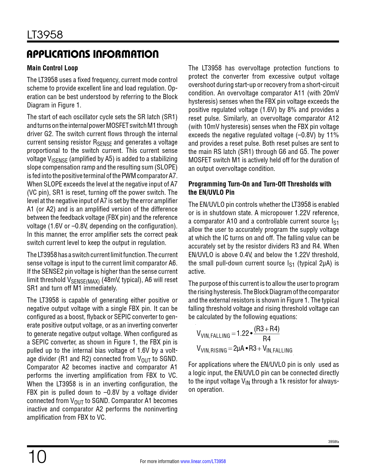 LT3958 applicaTions inForMaTionMain Control Loop The LT3958 has overvoltage protection functions to The LT3958 uses a fixed frequency, current mode control protect the converter from excessive output voltage scheme to provide excellent line and load regulation. Op- overshoot during start-up or recovery from a short-circuit eration can be best understood by referring to the Block condition. An overvoltage comparator A11 (with 20mV Diagram in Figure 1. hysteresis) senses when the FBX pin voltage exceeds the positive regulated voltage (1.6V) by 8% and provides a The start of each oscillator cycle sets the SR latch (SR1) reset pulse. Similarly, an overvoltage comparator A12 and turns on the internal power MOSFET switch M1 through (with 10mV hysteresis) senses when the FBX pin voltage driver G2. The switch current flows through the internal exceeds the negative regulated voltage (–0.8V) by 11% current sensing resistor RSENSE and generates a voltage and provides a reset pulse. Both reset pulses are sent to proportional to the switch current. This current sense the main RS latch (SR1) through G6 and G5. The power voltage VISENSE (amplified by A5) is added to a stabilizing MOSFET switch M1 is actively held off for the duration of slope compensation ramp and the resulting sum (SLOPE) an output overvoltage condition. is fed into the positive terminal of the PWM comparator A7. When SLOPE exceeds the level at the negative input of A7 Programming Turn-On and Turn-Off Thresholds with (VC pin), SR1 is reset, turning off the power switch. The the EN/UVLO Pin level at the negative input of A7 is set by the error amplifier The EN/UVLO pin controls whether the LT3958 is enabled A1 (or A2) and is an amplified version of the difference or is in shutdown state. A micropower 1.22V reference, between the feedback voltage (FBX pin) and the reference a comparator A10 and a controllable current source I voltage (1.6V or –0.8V, depending on the configuration). S1 allow the user to accurately program the supply voltage In this manner, the error amplifier sets the correct peak at which the IC turns on and off. The falling value can be switch current level to keep the output in regulation. accurately set by the resistor dividers R3 and R4. When The LT3958 has a switch current limit function. The current EN/UVLO is above 0.4V, and below the 1.22V threshold, sense voltage is input to the current limit comparator A6. the small pull-down current source IS1 (typical 2µA) is If the SENSE2 pin voltage is higher than the sense current active. limit threshold VSENSE(MAX) (48mV, typical), A6 will reset The purpose of this current is to allow the user to program SR1 and turn off M1 immediately. the rising hysteresis. The Block Diagram of the comparator The LT3958 is capable of generating either positive or and the external resistors is shown in Figure 1. The typical negative output voltage with a single FBX pin. It can be falling threshold voltage and rising threshold voltage can configured as a boost, flyback or SEPIC converter to gen- be calculated by the following equations: erate positive output voltage, or as an inverting converter (R3 +R4) to generate negative output voltage. When configured as VVIN,FALLING =1.22 • a SEPIC converter, as shown in Figure 1, the FBX pin is R4 pulled up to the internal bias voltage of 1.6V by a volt- VVIN,RISING = 2µA •R3+ VIN,FALLING age divider (R1 and R2) connected from VOUT to SGND. Comparator A2 becomes inactive and comparator A1 For applications where the EN/UVLO pin is only used as performs the inverting amplification from FBX to VC. a logic input, the EN/UVLO pin can be connected directly When the LT3958 is in an inverting configuration, the to the input voltage VIN through a 1k resistor for always- FBX pin is pulled down to –0.8V by a voltage divider on operation. connected from VOUT to SGND. Comparator A1 becomes inactive and comparator A2 performs the noninverting amplification from FBX to VC. 3958fa 10 For more information www.linear.com/LT3958 Document Outline Features Description Applications Typical Application Absolute Maximum Ratings Pin Configuration Order Information Electrical Characteristics Typical Performance Characteristics Pin Functions Block Diagram Applications Information Typical Applications Package Description Revision History Typical Applications Related Parts
