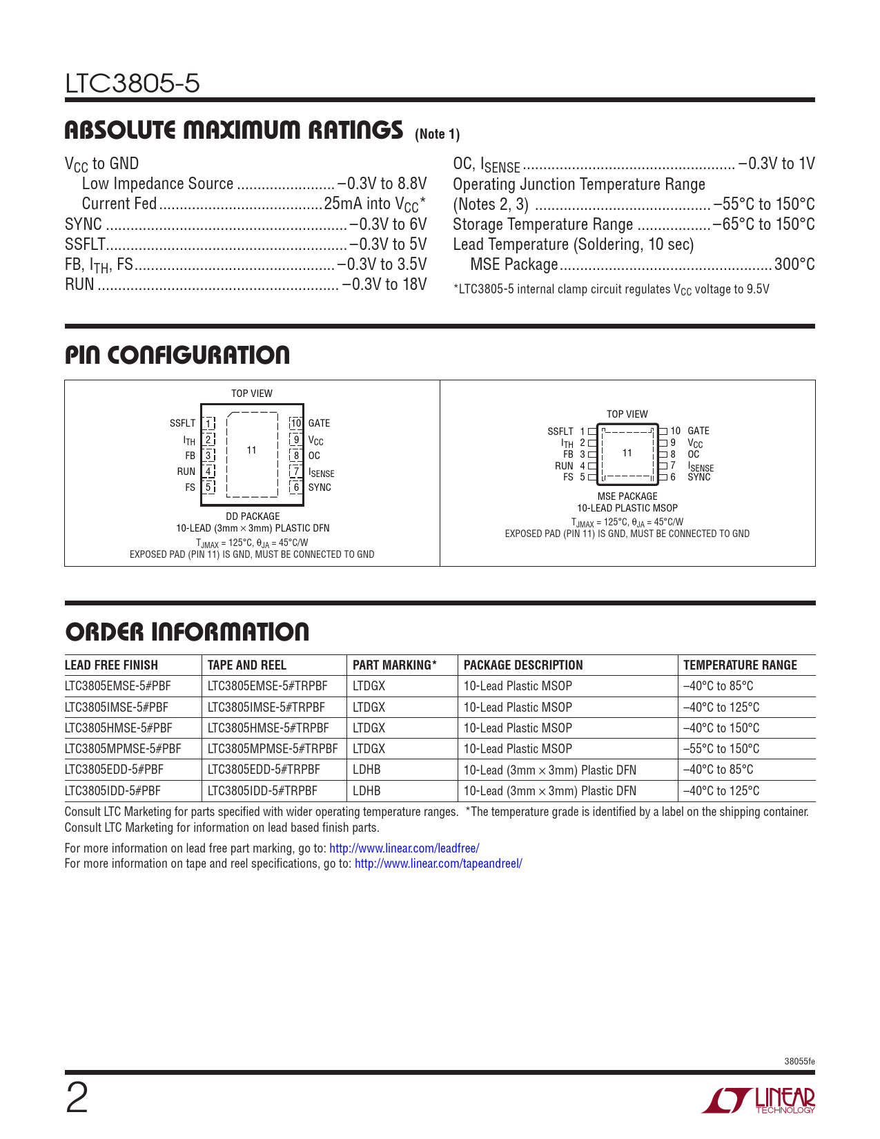LTC3805-5 ABSOLUTE MAXIMUM RATINGS (Note 1) VCC to GND OC, ISENSE .. –0.3V to 1V Low Impedance Source .. –0.3V to 8.8V Operating Junction Temperature Range Current Fed ..25mA into VCC* (Notes 2, 3) ... –55°C to 150°C SYNC ... –0.3V to 6V Storage Temperature Range ..–65°C to 150°C SSFLT... –0.3V to 5V Lead Temperature (Soldering, 10 sec) FB, ITH, FS ... –0.3V to 3.5V MSE Package ..300°C RUN ... –0.3V to 18V *LTC3805-5 internal clamp circuit regulates VCC voltage to 9.5V PIN CONFIGURATION TOP VIEW TOP VIEW SSFLT 1 10 GATE SSFLT 1 10 GATE ITH 2 9 VCC ITH 2 9 V 11 CC FB 3 8 OC FB 3 11 8 OC RUN 4 7 I RUN 4 7 ISENSE SENSE FS 5 6 SYNC FS 5 6 SYNC MSE PACKAGE 10-LEAD PLASTIC MSOP DD PACKAGE 10-LEAD (3mm × 3mm) PLASTIC DFN TJMAX = 125°C, θJA = 45°C/W EXPOSED PAD (PIN 11) IS GND, MUST BE CONNECTED TO GND TJMAX = 125°C, θJA = 45°C/W EXPOSED PAD (PIN 11) IS GND, MUST BE CONNECTED TO GND ORDER INFORMATIONLEAD FREE FINISHTAPE AND REELPART MARKING*PACKAGE DESCRIPTIONTEMPERATURE RANGE LTC3805EMSE-5#PBF LTC3805EMSE-5#TRPBF LTDGX 10-Lead Plastic MSOP –40°C to 85°C LTC3805IMSE-5#PBF LTC3805IMSE-5#TRPBF LTDGX 10-Lead Plastic MSOP –40°C to 125°C LTC3805HMSE-5#PBF LTC3805HMSE-5#TRPBF LTDGX 10-Lead Plastic MSOP –40°C to 150°C LTC3805MPMSE-5#PBF LTC3805MPMSE-5#TRPBF LTDGX 10-Lead Plastic MSOP –55°C to 150°C LTC3805EDD-5#PBF LTC3805EDD-5#TRPBF LDHB 10-Lead (3mm × 3mm) Plastic DFN –40°C to 85°C LTC3805IDD-5#PBF LTC3805IDD-5#TRPBF LDHB 10-Lead (3mm × 3mm) Plastic DFN –40°C to 125°C Consult LTC Marketing for parts specified with wider operating temperature ranges. *The temperature grade is identified by a label on the shipping container. Consult LTC Marketing for information on lead based finish parts. For more information on lead free part marking, go to: http://www.linear.com/leadfree/ For more information on tape and reel specifications, go to: http://www.linear.com/tapeandreel/ 38055fe 2 Document Outline Features Applications Description Typical Application Absolute Maximum Ratings Pin Configuration order information Electrical Characteristics Typical Performance Characteristics Pin Functions Block Diagram Operation Applications Information Typical Applications Package Description Revision History Typical Application Related Parts
