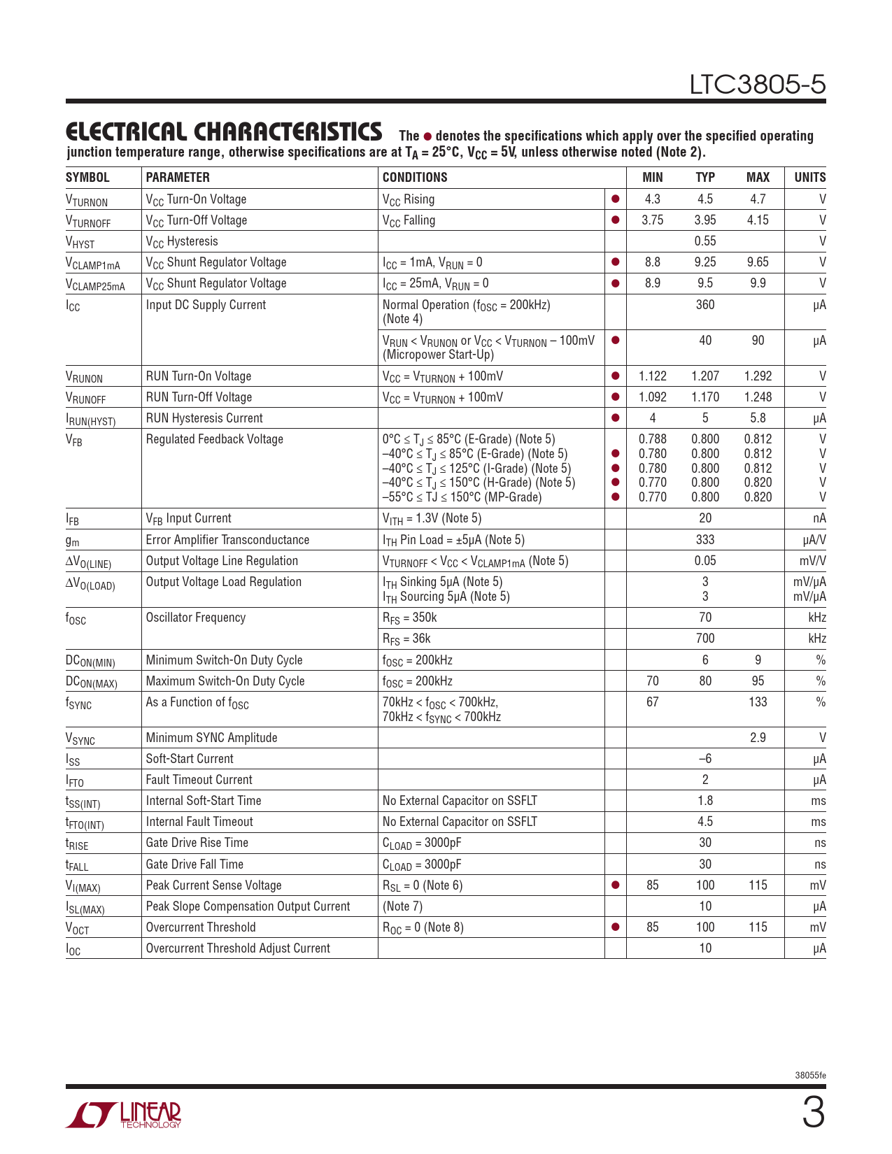 VTURNON VCC Turn-On Voltage VCC Rising l 4.3 4.5 4.7 V VTURNOFF VCC Turn-Off Voltage VCC Falling l 3.75 3.95 4.15 V VHYST VCC Hysteresis 0.55 V VCLAMP1mA VCC Shunt Regulator Voltage ICC = 1mA, VRUN = 0 l 8.8 9.25 9.65 V VCLAMP25mA VCC Shunt Regulator Voltage ICC = 25mA, VRUN = 0 l 8.9 9.5 9.9 V ICC Input DC Supply Current Normal Operation (fOSC = 200kHz) 360 µA (Note 4) VRUN < VRUNON or VCC < VTURNON – 100mV l 40 90 µA (Micropower Start-Up) VRUNON RUN Turn-On Voltage VCC = VTURNON + 100mV l 1.122 1.207 1.292 V VRUNOFF RUN Turn-Off Voltage VCC = VTURNON + 100mV l 1.092 1.170 1.248 V IRUN(HYST) RUN Hysteresis Current l 4 5 5.8 µA VFB Regulated Feedback Voltage 0°C ≤ TJ ≤ 85°C (E-Grade) (Note 5) 0.788 0.800 0.812 V –40°C ≤ TJ ≤ 85°C (E-Grade) (Note 5) l 0.780 0.800 0.812 V –40°C ≤ TJ ≤ 125°C (I-Grade) (Note 5) l 0.780 0.800 0.812 V –40°C ≤ TJ ≤ 150°C (H-Grade) (Note 5) l 0.770 0.800 0.820 V –55°C ≤ TJ ≤ 150°C (MP-Grade) l 0.770 0.800 0.820 V IFB VFB Input Current VITH = 1.3V (Note 5) 20 nA gm Error Amplifier Transconductance ITH Pin Load = ±5µA (Note 5) 333 µA/V DVO(LINE) Output Voltage Line Regulation VTURNOFF < VCC < VCLAMP1mA (Note 5) 0.05 mV/V DVO(LOAD) Output Voltage Load Regulation ITH Sinking 5µA (Note 5) 3 mV/µA ITH Sourcing 5µA (Note 5) 3 mV/µA fOSC Oscillator Frequency RFS = 350k 70 kHz RFS = 36k 700 kHz DCON(MIN) Minimum Switch-On Duty Cycle fOSC = 200kHz 6 9 % DCON(MAX) Maximum Switch-On Duty Cycle fOSC = 200kHz 70 80 95 % fSYNC As a Function of fOSC 70kHz < fOSC < 700kHz, 67 133 % 70kHz < fSYNC < 700kHz VSYNC Minimum SYNC Amplitude 2.9 V ISS Soft-Start Current –6 µA IFTO Fault Timeout Current 2 µA tSS(INT) Internal Soft-Start Time No External Capacitor on SSFLT 1.8 ms tFTO(INT) Internal Fault Timeout No External Capacitor on SSFLT 4.5 ms tRISE Gate Drive Rise Time CLOAD = 3000pF 30 ns tFALL Gate Drive Fall Time CLOAD = 3000pF 30 ns VI(MAX) Peak Current Sense Voltage RSL = 0 (Note 6) l 85 100 115 mV ISL(MAX) Peak Slope Compensation Output Current (Note 7) 10 µA VOCT Overcurrent Threshold ROC = 0 (Note 8) l 85 100 115 mV IOC Overcurrent Threshold Adjust Current 10 µA 38055fe 3 Document Outline Features Applications Description Typical Application Absolute Maximum Ratings Pin Configuration order information Electrical Characteristics Typical Performance Characteristics Pin Functions Block Diagram Operation Applications Information Typical Applications Package Description Revision History Typical Application Related Parts