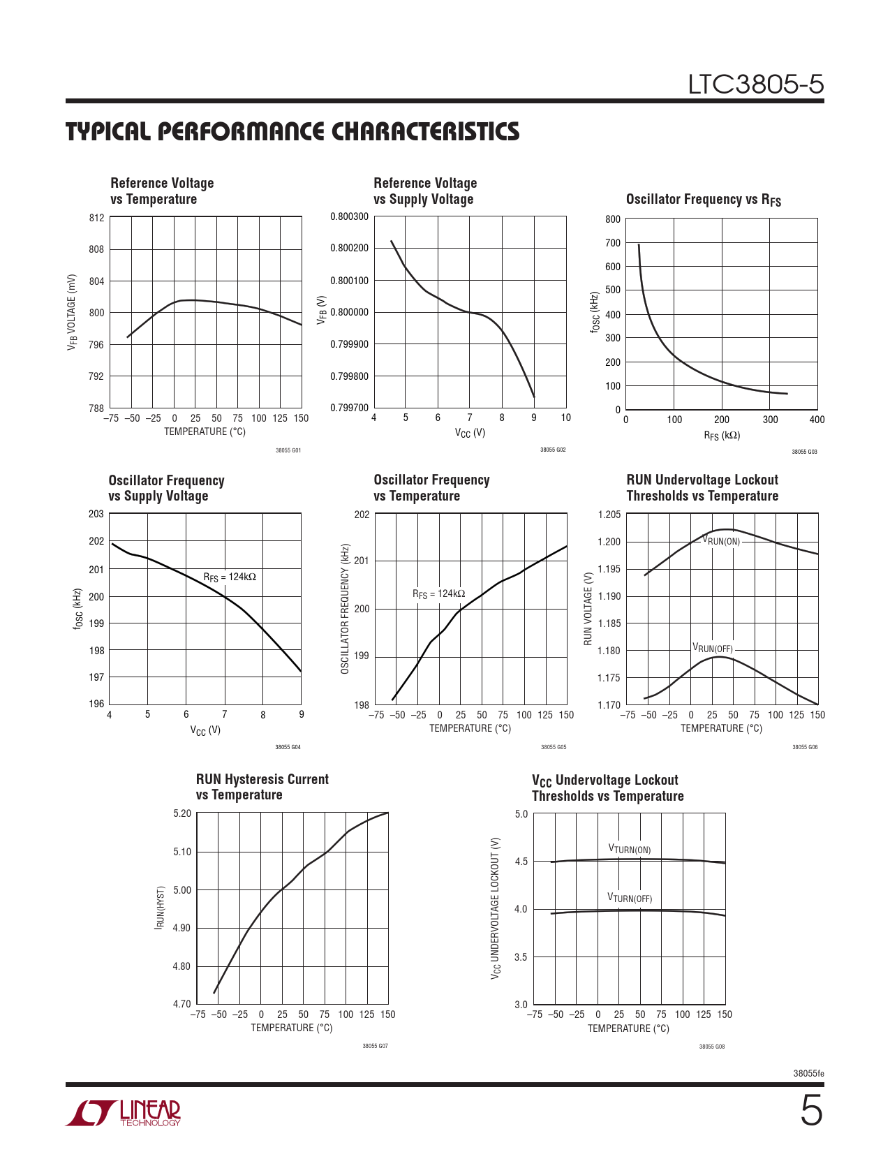 812 0.800300 800 700 808 0.800200 600 804 0.800100 500 (V) TAGE (mV) 800 0.800000 (kHz) 400 V FB VOL f OSC 300 V FB 796 0.799900 200 792 0.799800 100 788 0.799700 0 –75 –50 –25 0 25 50 75 100 125 150 4 5 6 7 8 9 10 0 100 200 300 400 TEMPERATURE (°C) VCC (V) RFS (kΩ) 38055 G01 38055 G02 38055 G03