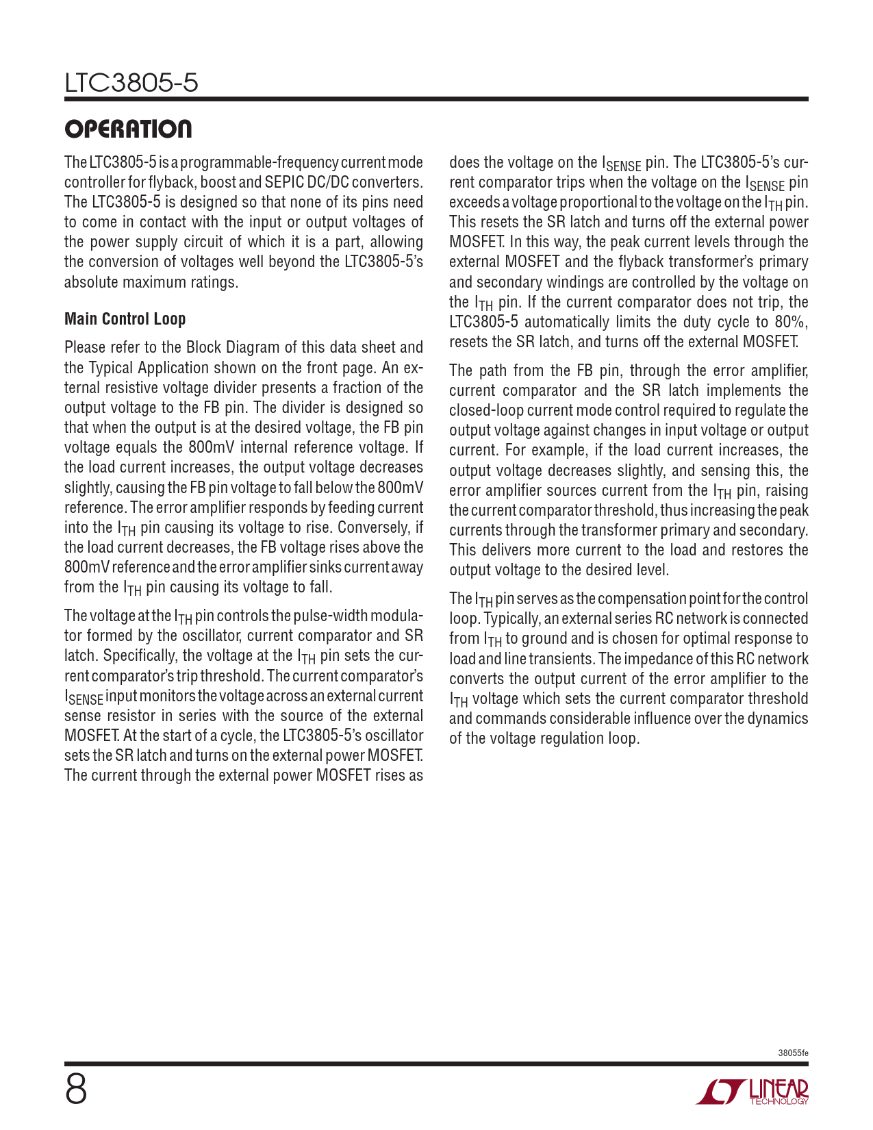 LTC3805-5 OPERATION The LTC3805-5 is a programmable-frequency current mode does the voltage on the ISENSE pin. The LTC3805-5’s cur- controller for flyback, boost and SEPIC DC/DC converters. rent comparator trips when the voltage on the ISENSE pin The LTC3805-5 is designed so that none of its pins need exceeds a voltage proportional to the voltage on the ITH pin. to come in contact with the input or output voltages of This resets the SR latch and turns off the external power the power supply circuit of which it is a part, allowing MOSFET. In this way, the peak current levels through the the conversion of voltages well beyond the LTC3805-5’s external MOSFET and the flyback transformer’s primary absolute maximum ratings. and secondary windings are controlled by the voltage on the ITH pin. If the current comparator does not trip, the Main Control Loop LTC3805-5 automatically limits the duty cycle to 80%, Please refer to the Block Diagram of this data sheet and resets the SR latch, and turns off the external MOSFET. the Typical Application shown on the front page. An ex- The path from the FB pin, through the error amplifier, ternal resistive voltage divider presents a fraction of the current comparator and the SR latch implements the output voltage to the FB pin. The divider is designed so closed-loop current mode control required to regulate the that when the output is at the desired voltage, the FB pin output voltage against changes in input voltage or output voltage equals the 800mV internal reference voltage. If current. For example, if the load current increases, the the load current increases, the output voltage decreases output voltage decreases slightly, and sensing this, the slightly, causing the FB pin voltage to fall below the 800mV error amplifier sources current from the ITH pin, raising reference. The error amplifier responds by feeding current the current comparator threshold, thus increasing the peak into the ITH pin causing its voltage to rise. Conversely, if currents through the transformer primary and secondary. the load current decreases, the FB voltage rises above the This delivers more current to the load and restores the 800mV reference and the error amplifier sinks current away output voltage to the desired level. from the ITH pin causing its voltage to fall. The ITH pin serves as the compensation point for the control The voltage at the ITH pin controls the pulse-width modula- loop. Typically, an external series RC network is connected tor formed by the oscillator, current comparator and SR from ITH to ground and is chosen for optimal response to latch. Specifically, the voltage at the ITH pin sets the cur- load and line transients. The impedance of this RC network rent comparator’s trip threshold. The current comparator’s converts the output current of the error amplifier to the ISENSE input monitors the voltage across an external current ITH voltage which sets the current comparator threshold sense resistor in series with the source of the external and commands considerable influence over the dynamics MOSFET. At the start of a cycle, the LTC3805-5’s oscillator of the voltage regulation loop. sets the SR latch and turns on the external power MOSFET. The current through the external power MOSFET rises as 38055fe 8 Document Outline Features Applications Description Typical Application Absolute Maximum Ratings Pin Configuration order information Electrical Characteristics Typical Performance Characteristics Pin Functions Block Diagram Operation Applications Information Typical Applications Package Description Revision History Typical Application Related Parts