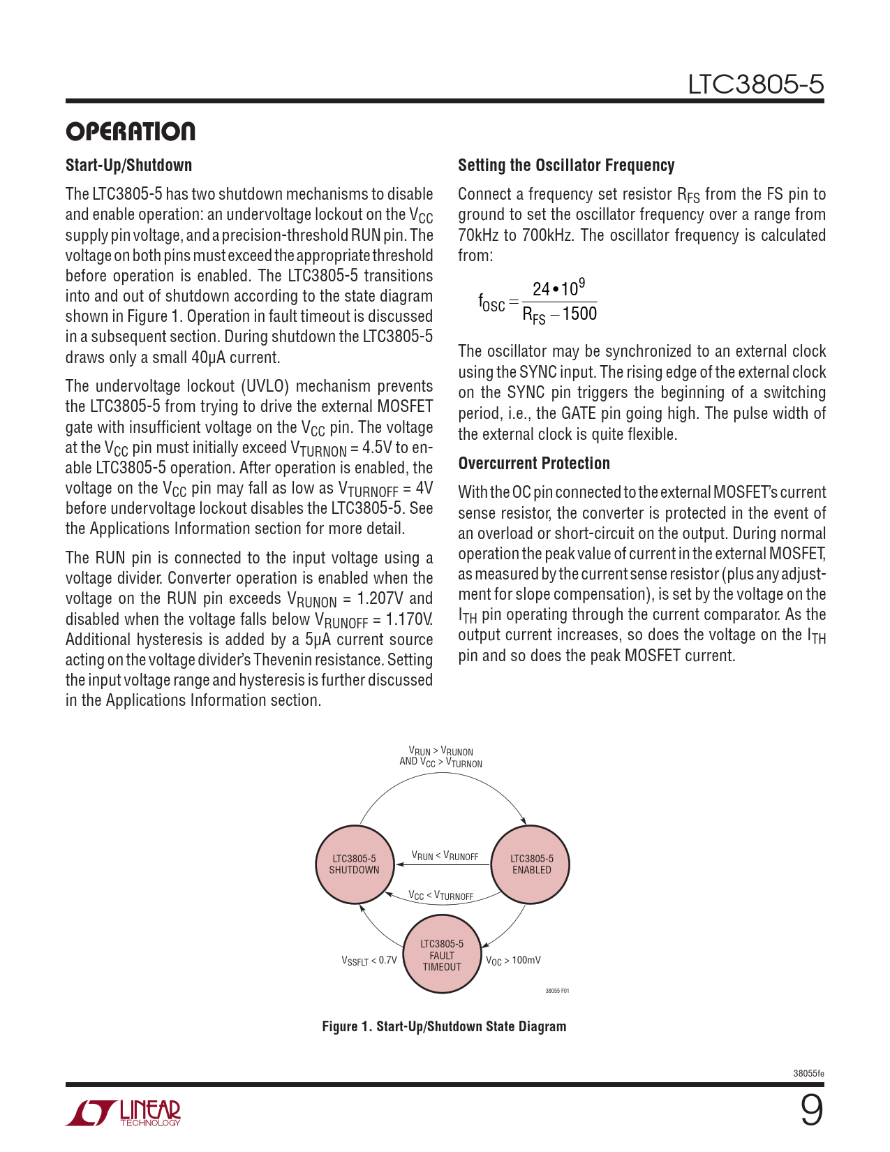 LTC3805-5 OPERATION Start-Up/ShutdownSetting the Oscillator Frequency The LTC3805-5 has two shutdown mechanisms to disable Connect a frequency set resistor RFS from the FS pin to and enable operation: an undervoltage lockout on the VCC ground to set the oscillator frequency over a range from supply pin voltage, and a precision-threshold RUN pin. The 70kHz to 700kHz. The oscillator frequency is calculated voltage on both pins must exceed the appropriate threshold from: before operation is enabled. The LTC3805-5 transitions into and out of shutdown according to the state diagram 24 • 109 f shown in Figure 1. Operation in fault timeout is discussed OSC = RFS −1500 in a subsequent section. During shutdown the LTC3805-5 draws only a small 40µA current. The oscillator may be synchronized to an external clock using the SYNC input. The rising edge of the external clock The undervoltage lockout (UVLO) mechanism prevents on the SYNC pin triggers the beginning of a switching the LTC3805-5 from trying to drive the external MOSFET period, i.e., the GATE pin going high. The pulse width of gate with insufficient voltage on the VCC pin. The voltage the external clock is quite flexible. at the VCC pin must initially exceed VTURNON = 4.5V to en- able LTC3805-5 operation. After operation is enabled, the Overcurrent Protection voltage on the VCC pin may fall as low as VTURNOFF = 4V With the OC pin connected to the external MOSFET’s current before undervoltage lockout disables the LTC3805-5. See sense resistor, the converter is protected in the event of the Applications Information section for more detail. an overload or short-circuit on the output. During normal The RUN pin is connected to the input voltage using a operation the peak value of current in the external MOSFET, voltage divider. Converter operation is enabled when the as measured by the current sense resistor (plus any adjust- voltage on the RUN pin exceeds V ment for slope compensation), is set by the voltage on the RUNON = 1.207V and disabled when the voltage falls below V I RUNOFF = 1.170V. TH pin operating through the current comparator. As the Additional hysteresis is added by a 5µA current source output current increases, so does the voltage on the ITH acting on the voltage divider’s Thevenin resistance. Setting pin and so does the peak MOSFET current. the input voltage range and hysteresis is further discussed in the Applications Information section. VRUN > VRUNON AND VCC > VTURNON LTC3805-5 VRUN < VRUNOFF LTC3805-5 SHUTDOWN ENABLED VCC < VTURNOFF LTC3805-5 FAULT VSSFLT < 0.7V V TIMEOUT OC > 100mV 38055 F01 Figure 1. Start-Up/Shutdown State Diagram 38055fe 9 Document Outline Features Applications Description Typical Application Absolute Maximum Ratings Pin Configuration order information Electrical Characteristics Typical Performance Characteristics Pin Functions Block Diagram Operation Applications Information Typical Applications Package Description Revision History Typical Application Related Parts