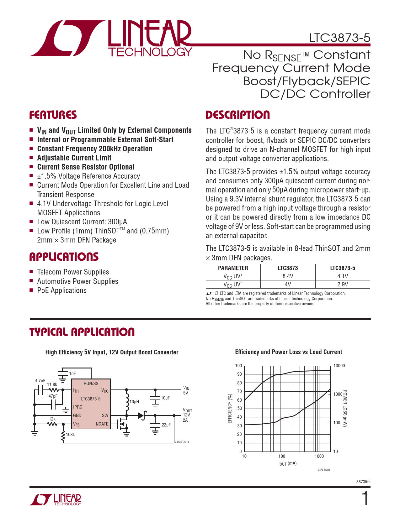 LTC3873-5 No RSENSETM Constant Frequency Current Mode Boost/Flyback/SEPIC DC/DC Controller FEATURESDESCRIPTION n VIN and VOUT Limited Only by External Components The LTC®3873-5 is a constant frequency current mode n Internal or Programmable External Soft-Start controller for boost, fl yback or SEPIC DC/DC converters n Constant Frequency 200kHz Operation designed to drive an N-channel MOSFET for high input n Adjustable Current Limit and output voltage converter applications. n Current Sense Resistor Optional The LTC3873-5 provides ±1.5% output voltage accuracy n ±1.5% Voltage Reference Accuracy and consumes only 300μA quiescent current during nor- n Current Mode Operation for Excellent Line and Load mal operation and only 50μA during micropower start-up. Transient Response Using a 9.3V internal shunt regulator, the LTC3873-5 can n 4.1V Undervoltage Threshold for Logic Level be powered from a high input voltage through a resistor MOSFET Applications or it can be powered directly from a low impedance DC n Low Quiescent Current: 300μA voltage of 9V or less. Soft-start can be programmed using n Low Profi le (1mm) ThinSOTTM and (0.75mm) an external capacitor. 2mm × 3mm DFN Package The LTC3873-5 is available in 8-lead ThinSOT and 2mm APPLICATIONS × 3mm DFN packages. n PARAMETERLTC3873LTC3873-5 Telecom Power Supplies V n Automotive Power Supplies CC UV+ 8.4V 4.1V VCC UV– 4V 2.9V n PoE Applications L, LT, LTC and LTM are registered trademarks of Linear Technology Corporation. No RSENSE and ThinSOT are trademarks of Linear Technology Corporation. All other trademarks are the property of their respective owners. TYPICAL APPLICATIONHigh Effi ciency 5V Input, 12V Output Boost ConverterEffi ciency and Power Loss vs Load Current 100 10000 1nF 90 4.7nF RUN/SS 11.8k 80 V I IN POWER LOSS (mW) TH VCC 5V 70 47pF 1000 LTC3873-5 10μF 10μH 60 IPRG V 50 OUT GND SW 12V 12k 40 2A EFFICIENCY (%) V 100 FB NGATE 22μF 30 108k 20 38735 TA01a 10 0 10 10 100 1000 IOUT (mA) 3873 TA01b 38735fb 1