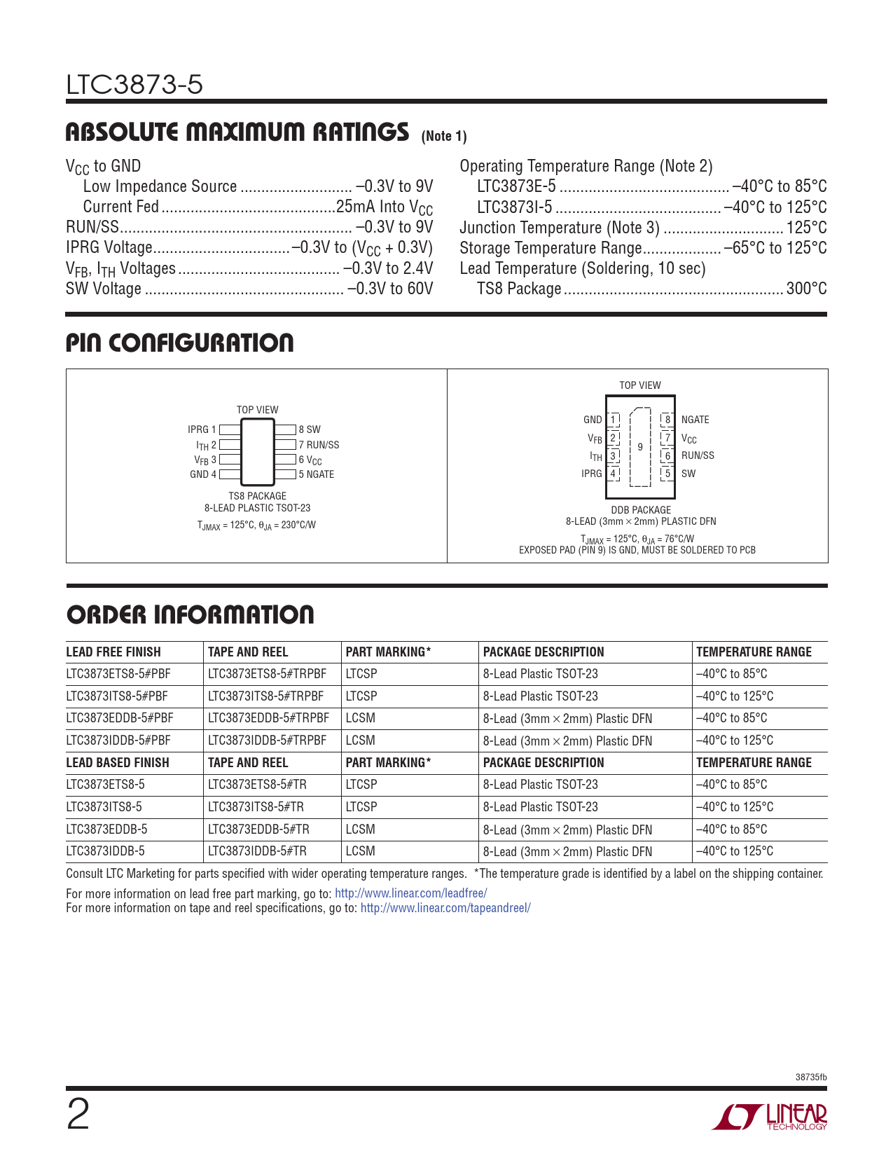 LTC3873-5 ABSOLUTE MAXIMUM RATINGS (Note 1) VCC to GND Operating Temperature Range (Note 2) Low Impedance Source ... –0.3V to 9V LTC3873E-5 ... –40°C to 85°C Current Fed ..25mA Into VCC LTC3873I-5 .. –40°C to 125°C RUN/SS .. –0.3V to 9V Junction Temperature (Note 3) ... 125°C IPRG Voltage ... –0.3V to (VCC + 0.3V) Storage Temperature Range ... –65°C to 125°C VFB, ITH Voltages ... –0.3V to 2.4V Lead Temperature (Soldering, 10 sec) SW Voltage .. –0.3V to 60V TS8 Package ... 300°C PIN CONFIGURATION TOP VIEW TOP VIEW GND 1 8 NGATE IPRG 1 8 SW V 2 7 V I FB CC TH 2 7 RUN/SS 9 V ITH 3 6 RUN/SS FB 3 6 VCC GND 4 5 NGATE IPRG 4 5 SW TS8 PACKAGE 8-LEAD PLASTIC TSOT-23 DDB PACKAGE T 8-LEAD (3mm s 2mm) PLASTIC DFN JMAX = 125°C, θJA = 230°C/W TJMAX = 125°C, θJA = 76°C/W EXPOSED PAD (PIN 9) IS GND, MUST BE SOLDERED TO PCB ORDER INFORMATIONLEAD FREE FINISHTAPE AND REELPART MARKING*PACKAGE DESCRIPTIONTEMPERATURE RANGE LTC3873ETS8-5#PBF LTC3873ETS8-5#TRPBF LTCSP 8-Lead Plastic TSOT-23 –40°C to 85°C LTC3873ITS8-5#PBF LTC3873ITS8-5#TRPBF LTCSP 8-Lead Plastic TSOT-23 –40°C to 125°C LTC3873EDDB-5#PBF LTC3873EDDB-5#TRPBF LCSM 8-Lead (3mm × 2mm) Plastic DFN –40°C to 85°C LTC3873IDDB-5#PBF LTC3873IDDB-5#TRPBF LCSM 8-Lead (3mm × 2mm) Plastic DFN –40°C to 125°C LEAD BASED FINISHTAPE AND REELPART MARKING*PACKAGE DESCRIPTIONTEMPERATURE RANGE LTC3873ETS8-5 LTC3873ETS8-5#TR LTCSP 8-Lead Plastic TSOT-23 –40°C to 85°C LTC3873ITS8-5 LTC3873ITS8-5#TR LTCSP 8-Lead Plastic TSOT-23 –40°C to 125°C LTC3873EDDB-5 LTC3873EDDB-5#TR LCSM 8-Lead (3mm × 2mm) Plastic DFN –40°C to 85°C LTC3873IDDB-5 LTC3873IDDB-5#TR LCSM 8-Lead (3mm × 2mm) Plastic DFN –40°C to 125°C Consult LTC Marketing for parts specifi ed with wider operating temperature ranges. *The temperature grade is identifi ed by a label on the shipping container. For more information on lead free part marking, go to: http://www.linear.com/leadfree/ For more information on tape and reel specifi cations, go to: http://www.linear.com/tapeandreel/ 38735fb 2