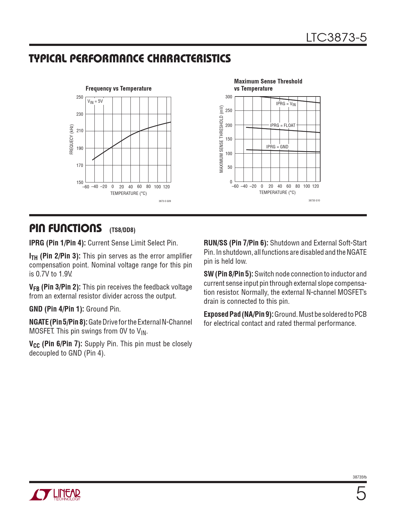 LTC3873-5 TYPICAL PERFORMANCE CHARACTERISTICSMaximum Sense ThresholdFrequency vs Temperaturevs Temperature 250 300 VIN = 5V IPRG = VIN 250 230 200 IPRG = FLOAT 210 150 IPRG = GND 190 FREQUECY (kHz) 100 170 50 MAXIMUM SENSE THRESHOLD (mV) 150 0 –60 –40 –20 0 20 40 60 80 100 120 –60 –40 –20 0 20 40 60 80 100 120 TEMPERATURE (°C) TEMPERATURE (°C) 38735 G10 3873-5 G09 PIN FUNCTIONS (TS8/DD8)IPRG (Pin 1/Pin 4): Current Sense Limit Select Pin. RUN/SS (Pin 7/Pin 6): Shutdown and External Soft-Start Pin. In shutdown, all functions are disabled and the NGATE ITH (Pin 2/Pin 3): This pin serves as the error amplifi er pin is held low. compensation point. Nominal voltage range for this pin is 0.7V to 1.9V. SW (Pin 8/Pin 5): Switch node connection to inductor and current sense input pin through external slope compensa- VFB (Pin 3/Pin 2): This pin receives the feedback voltage tion resistor. Normally, the external N-channel MOSFET’s from an external resistor divider across the output. drain is connected to this pin. GND (Pin 4/Pin 1): Ground Pin. Exposed Pad (NA/Pin 9): Ground. Must be soldered to PCB NGATE (Pin 5/Pin 8): Gate Drive for the External N-Channel for electrical contact and rated thermal performance. MOSFET. This pin swings from 0V to VIN. VCC (Pin 6/Pin 7): Supply Pin. This pin must be closely decoupled to GND (Pin 4). 38735fb 5
