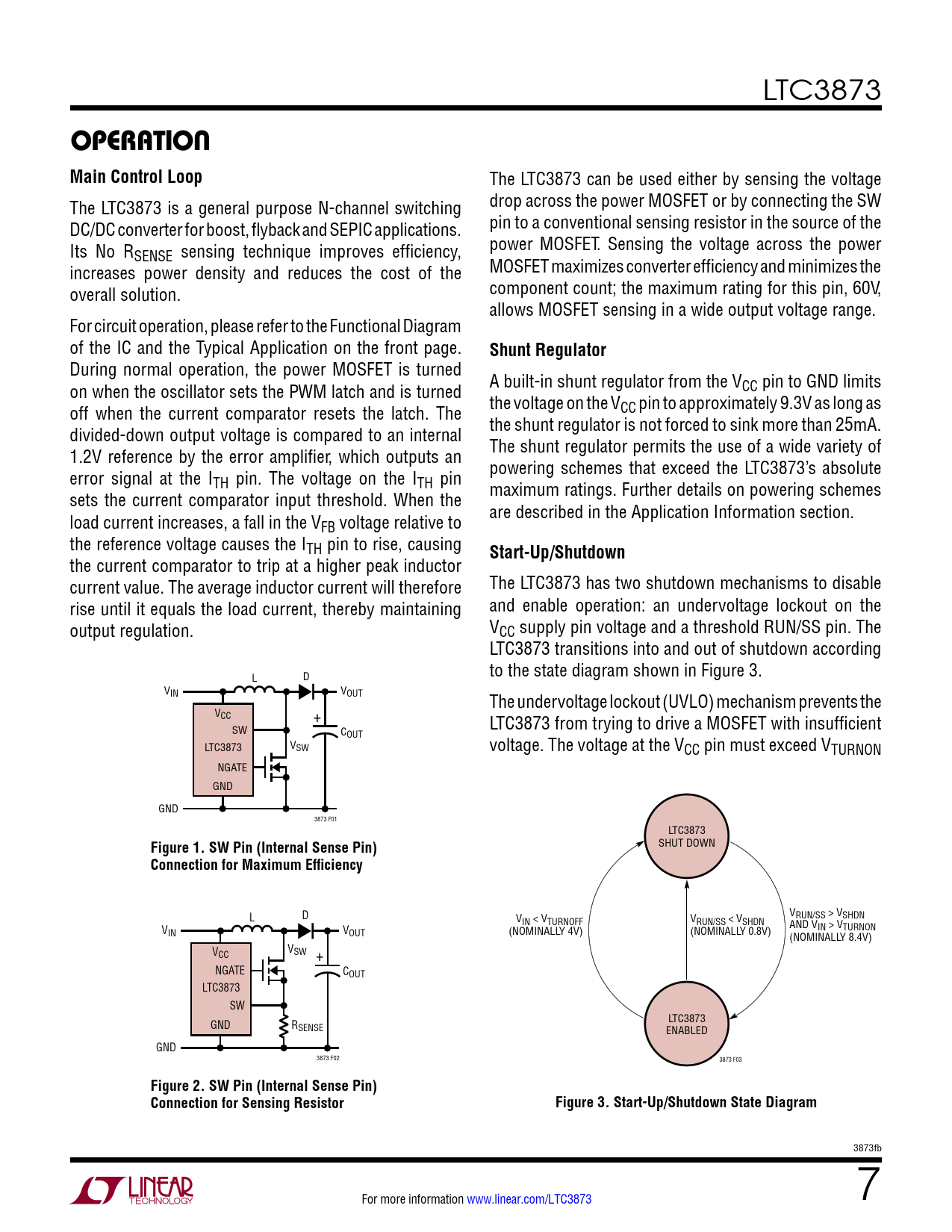 L D V VRUN/SS > VSHDN IN < VTURNOFF VRUN/SS < VSHDN V AND V IN VOUT (NOMINALLY 4V) (NOMINALLY 0.8V) IN > VTURNON (NOMINALLY 8.4V) V V SW CC + NGATE COUT LTC3873 SW LTC3873 GND RSENSE ENABLED GND 3873 F02 3873 F03