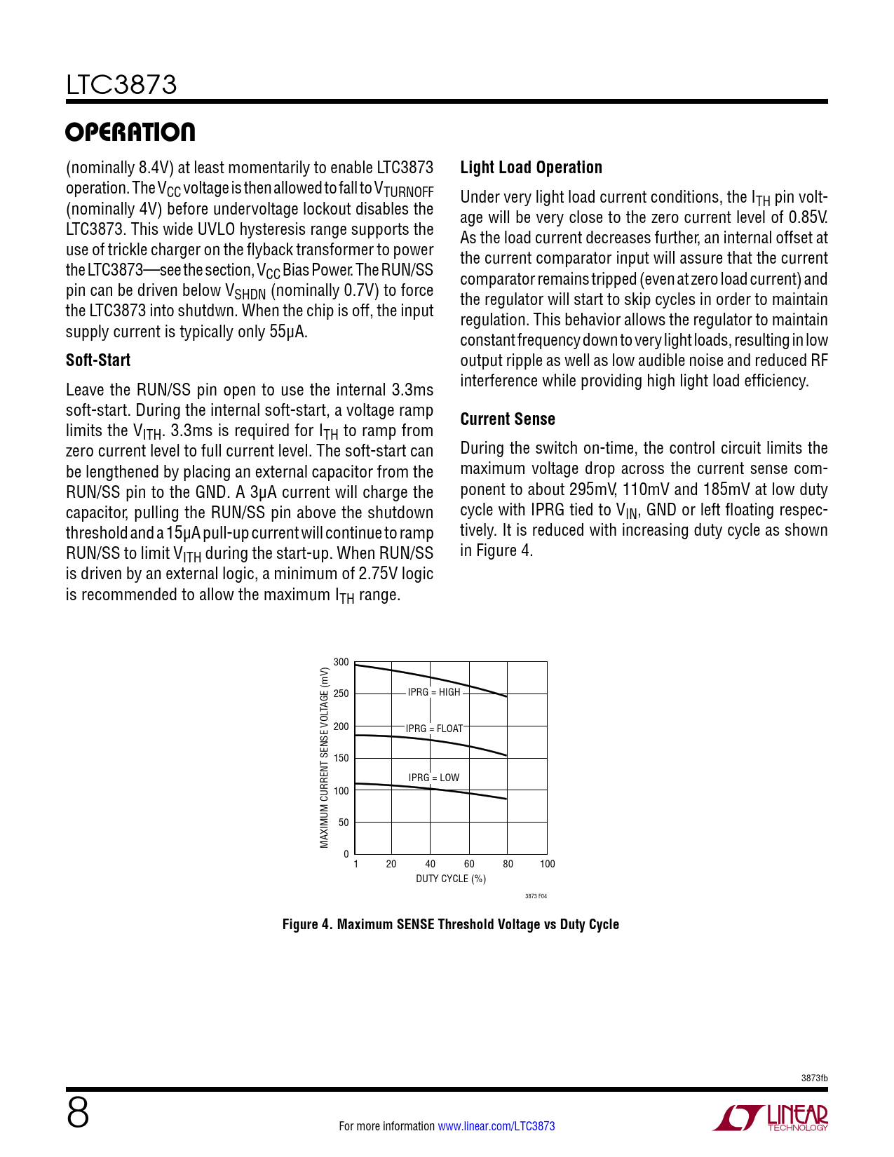 LTC3873 OPERATION (nominally 8.4V) at least momentarily to enable LTC3873 Light Load Operation operation. The VCC voltage is then allowed to fall to VTURNOFF Under very light load current conditions, the I (nominally 4V) before undervoltage lockout disables the TH pin volt- age will be very close to the zero current level of 0.85V. LTC3873. This wide UVLO hysteresis range supports the As the load current decreases further, an internal offset at use of trickle charger on the flyback transformer to power the current comparator input will assure that the current the LTC3873—see the section, VCC Bias Power. The RUN/SS comparator remains tripped (even at zero load current) and pin can be driven below VSHDN (nominally 0.7V) to force the regulator will start to skip cycles in order to maintain the LTC3873 into shutdwn. When the chip is off, the input regulation. This behavior allows the regulator to maintain supply current is typically only 55μA. constant frequency down to very light loads, resulting in low Soft-Start output ripple as well as low audible noise and reduced RF Leave the RUN/SS pin open to use the internal 3.3ms interference while providing high light load efficiency. soft-start. During the internal soft-start, a voltage ramp Current Sense limits the VITH. 3.3ms is required for ITH to ramp from zero current level to full current level. The soft-start can During the switch on-time, the control circuit limits the be lengthened by placing an external capacitor from the maximum voltage drop across the current sense com- RUN/SS pin to the GND. A 3μA current will charge the ponent to about 295mV, 110mV and 185mV at low duty capacitor, pulling the RUN/SS pin above the shutdown cycle with IPRG tied to VIN, GND or left floating respec- threshold and a 15µA pull-up current will continue to ramp tively. It is reduced with increasing duty cycle as shown RUN/SS to limit VITH during the start-up. When RUN/SS in Figure 4. is driven by an external logic, a minimum of 2.75V logic is recommended to allow the maximum ITH range. 300 250 IPRG = HIGH TAGE (mV) 200 IPRG = FLOAT 150 IPRG = LOW 100 50 MAXIMUM CURRENT SENSE VOL 0 1 20 40 60 80 100 DUTY CYCLE (%) 3873 F04 Figure 4. Maximum SENSE Threshold Voltage vs Duty Cycle 3873fb 8 For more information www.linear.com/LTC3873