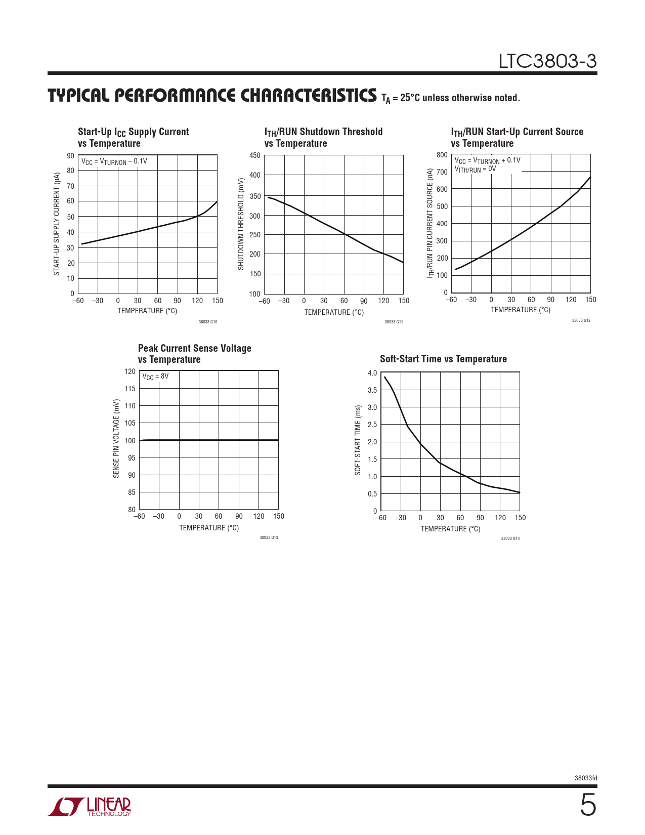 90 450 800 VCC = VTURNON – 0.1V VCC = VTURNON + 0.1V 80 VITH/RUN = 0V 400 700 70 600 350 60 500 50 300 400 40 250 300 30 200 200 20 SHUTDOWN THRESHOLD (mV) /RUN PIN CURRENT SOURCE (nA) START-UP SUPPLY CURRENT (μA) 150 10 I TH 100 0 100 0 –60 –30 0 30 60 90 120 150 –60 –30 0 30 60 90 120 150 –60 –30 0 30 60 90 120 150 TEMPERATURE (°C) TEMPERATURE (°C) TEMPERATURE (°C) 38033 G10 38033 G11 38033 G12