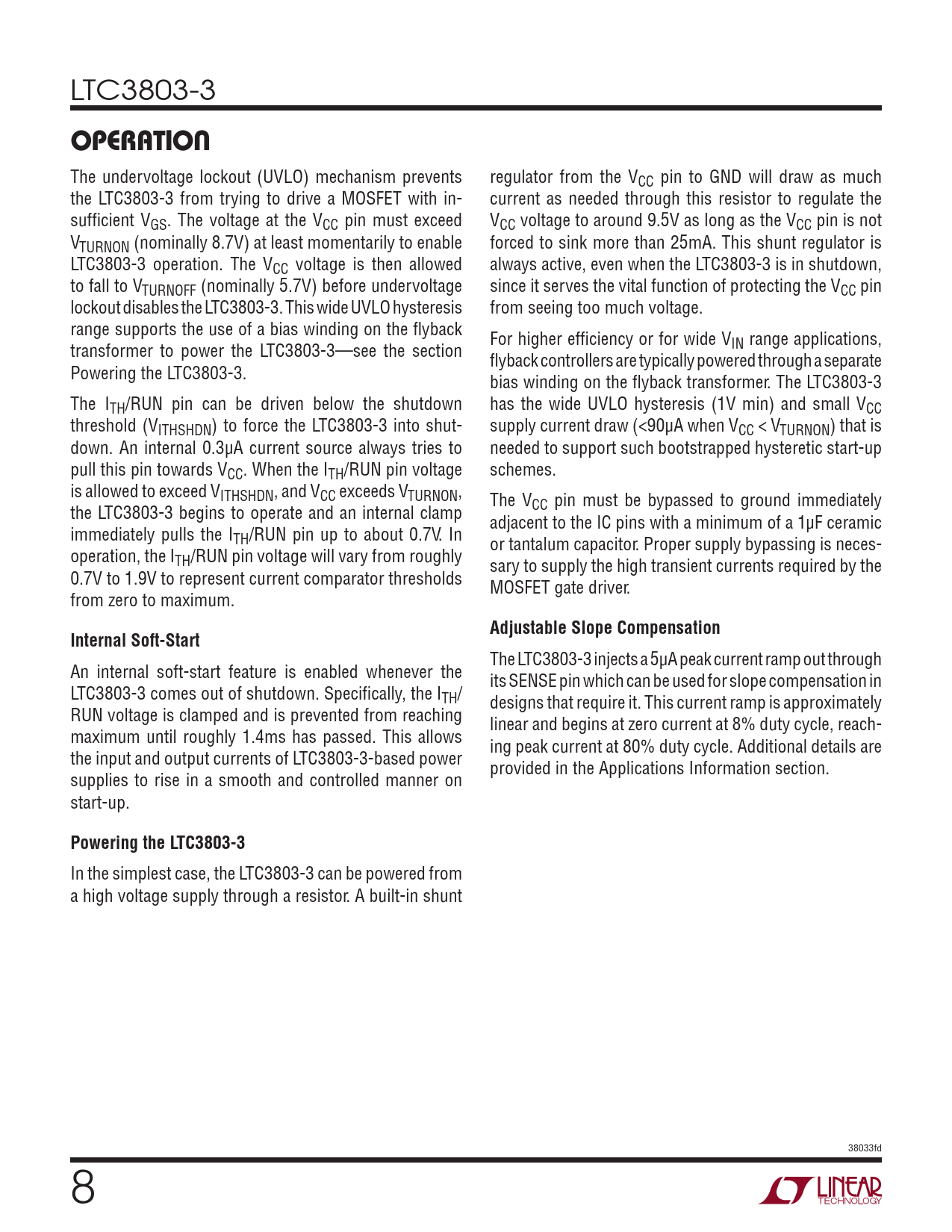 LTC3803-3 OPERATION The undervoltage lockout (UVLO) mechanism prevents regulator from the VCC pin to GND will draw as much the LTC3803-3 from trying to drive a MOSFET with in- current as needed through this resistor to regulate the suffi cient VGS. The voltage at the VCC pin must exceed VCC voltage to around 9.5V as long as the VCC pin is not VTURNON (nominally 8.7V) at least momentarily to enable forced to sink more than 25mA. This shunt regulator is LTC3803-3 operation. The VCC voltage is then allowed always active, even when the LTC3803-3 is in shutdown, to fall to VTURNOFF (nominally 5.7V) before undervoltage since it serves the vital function of protecting the VCC pin lockout disables the LTC3803-3. This wide UVLO hysteresis from seeing too much voltage. range supports the use of a bias winding on the fl yback For higher effi ciency or for wide V transformer to power the LTC3803-3—see the section IN range applications, fl yback controllers are typically powered through a separate Powering the LTC3803-3. bias winding on the fl yback transformer. The LTC3803-3 The ITH/RUN pin can be driven below the shutdown has the wide UVLO hysteresis (1V min) and small VCC threshold (VITHSHDN) to force the LTC3803-3 into shut- supply current draw (<90μA when VCC < VTURNON) that is down. An internal 0.3μA current source always tries to needed to support such bootstrapped hysteretic start-up pull this pin towards VCC. When the ITH/RUN pin voltage schemes. is allowed to exceed VITHSHDN, and VCC exceeds VTURNON, The V the LTC3803-3 begins to operate and an internal clamp CC pin must be bypassed to ground immediately adjacent to the IC pins with a minimum of a 1μF ceramic immediately pulls the ITH/RUN pin up to about 0.7V. In or tantalum capacitor. Proper supply bypassing is neces- operation, the ITH/RUN pin voltage will vary from roughly sary to supply the high transient currents required by the 0.7V to 1.9V to represent current comparator thresholds MOSFET gate driver. from zero to maximum. Adjustable Slope CompensationInternal Soft-Start The LTC3803-3 injects a 5μA peak current ramp out through An internal soft-start feature is enabled whenever the its SENSE pin which can be used for slope compensation in LTC3803-3 comes out of shutdown. Specifi cally, the ITH/ designs that require it. This current ramp is approximately RUN voltage is clamped and is prevented from reaching linear and begins at zero current at 8% duty cycle, reach- maximum until roughly 1.4ms has passed. This allows ing peak current at 80% duty cycle. Additional details are the input and output currents of LTC3803-3-based power provided in the Applications Information section. supplies to rise in a smooth and controlled manner on start-up. Powering the LTC3803-3 In the simplest case, the LTC3803-3 can be powered from a high voltage supply through a resistor. A built-in shunt 38033fd 8 Document Outline FEATURES DESCRIPTION APPLICATIONS TYPICAL APPLICATION ABSOLUTE MAXIMUM RATINGS PACKAGE/ORDER INFORMATION ORDER INFORMATION ELECTRICAL CHARACTERISTICS TYPICAL PERFORMANCE CHARACTERISTICS PIN FUNCTIONS BLOCK DIAGRAM OPERATION APPLICATIONS INFORMATION TYPICAL APPLICATIONS PACKAGE DESCRIPTION REVISION HISTORY TYPICAL APPLICATION RELATED PARTS