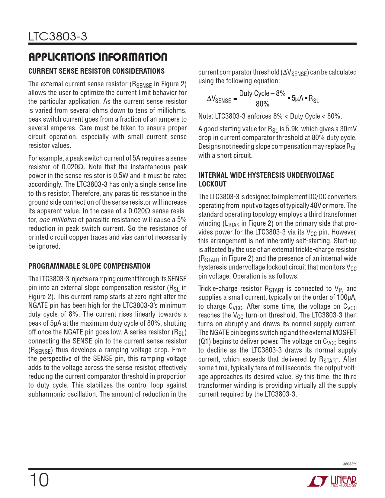 LTC3803-3 APPLICATIONS INFORMATIONCURRENT SENSE RESISTOR CONSIDERATIONS current comparator threshold (ΔVSENSE) can be calculated The external current sense resistor (R using the following equation: SENSE in Figure 2) allows the user to optimize the current limit behavior for Duty Cycle – 8% • 5 the particular application. As the current sense resistor ΔV μA • R SENSE = SL 80% is varied from several ohms down to tens of milliohms, peak switch current goes from a fraction of an ampere to Note: LTC3803-3 enforces 8% < Duty Cycle < 80%. several amperes. Care must be taken to ensure proper A good starting value for RSL is 5.9k, which gives a 30mV circuit operation, especially with small current sense drop in current comparator threshold at 80% duty cycle. resistor values. Designs not needing slope compensation may replace RSL For example, a peak switch current of 5A requires a sense with a short circuit. resistor of 0.020Ω. Note that the instantaneous peak power in the sense resistor is 0.5W and it must be rated INTERNAL WIDE HYSTERESIS UNDERVOLTAGE accordingly. The LTC3803-3 has only a single sense line LOCKOUT to this resistor. Therefore, any parasitic resistance in the The LTC3803-3 is designed to implement DC/DC converters ground side connection of the sense resistor will increase operating from input voltages of typically 48V or more. The its apparent value. In the case of a 0.020Ω sense resis- standard operating topology employs a third transformer tor, one milliohm of parasitic resistance will cause a 5% winding (L reduction in peak switch current. So the resistance of BIAS in Figure 2) on the primary side that pro- vides power for the LTC3803-3 via its V printed circuit copper traces and vias cannot necessarily CC pin. However, this arrangement is not inherently self-starting. Start-up be ignored. is affected by the use of an external trickle-charge resistor (RSTART in Figure 2) and the presence of an internal wide PROGRAMMABLE SLOPE COMPENSATION hysteresis undervoltage lockout circuit that monitors VCC The LTC3803-3 injects a ramping current through its SENSE pin voltage. Operation is as follows: pin into an external slope compensation resistor (RSL in Trickle-charge resistor RSTART is connected to VIN and Figure 2). This current ramp starts at zero right after the supplies a small current, typically on the order of 100μA, NGATE pin has been high for the LTC3803-3’s minimum to charge CVCC. After some time, the voltage on CVCC duty cycle of 8%. The current rises linearly towards a reaches the VCC turn-on threshold. The LTC3803-3 then peak of 5μA at the maximum duty cycle of 80%, shutting turns on abruptly and draws its normal supply current. off once the NGATE pin goes low. A series resistor (RSL) The NGATE pin begins switching and the external MOSFET connecting the SENSE pin to the current sense resistor (Q1) begins to deliver power. The voltage on CVCC begins (RSENSE) thus develops a ramping voltage drop. From to decline as the LTC3803-3 draws its normal supply the perspective of the SENSE pin, this ramping voltage current, which exceeds that delivered by RSTART . After adds to the voltage across the sense resistor, effectively some time, typically tens of milliseconds, the output volt- reducing the current comparator threshold in proportion age approaches its desired value. By this time, the third to duty cycle. This stabilizes the control loop against transformer winding is providing virtually all the supply subharmonic oscillation. The amount of reduction in the current required by the LTC3803-3. 38033fd 10 Document Outline FEATURES DESCRIPTION APPLICATIONS TYPICAL APPLICATION ABSOLUTE MAXIMUM RATINGS PACKAGE/ORDER INFORMATION ORDER INFORMATION ELECTRICAL CHARACTERISTICS TYPICAL PERFORMANCE CHARACTERISTICS PIN FUNCTIONS BLOCK DIAGRAM OPERATION APPLICATIONS INFORMATION TYPICAL APPLICATIONS PACKAGE DESCRIPTION REVISION HISTORY TYPICAL APPLICATION RELATED PARTS