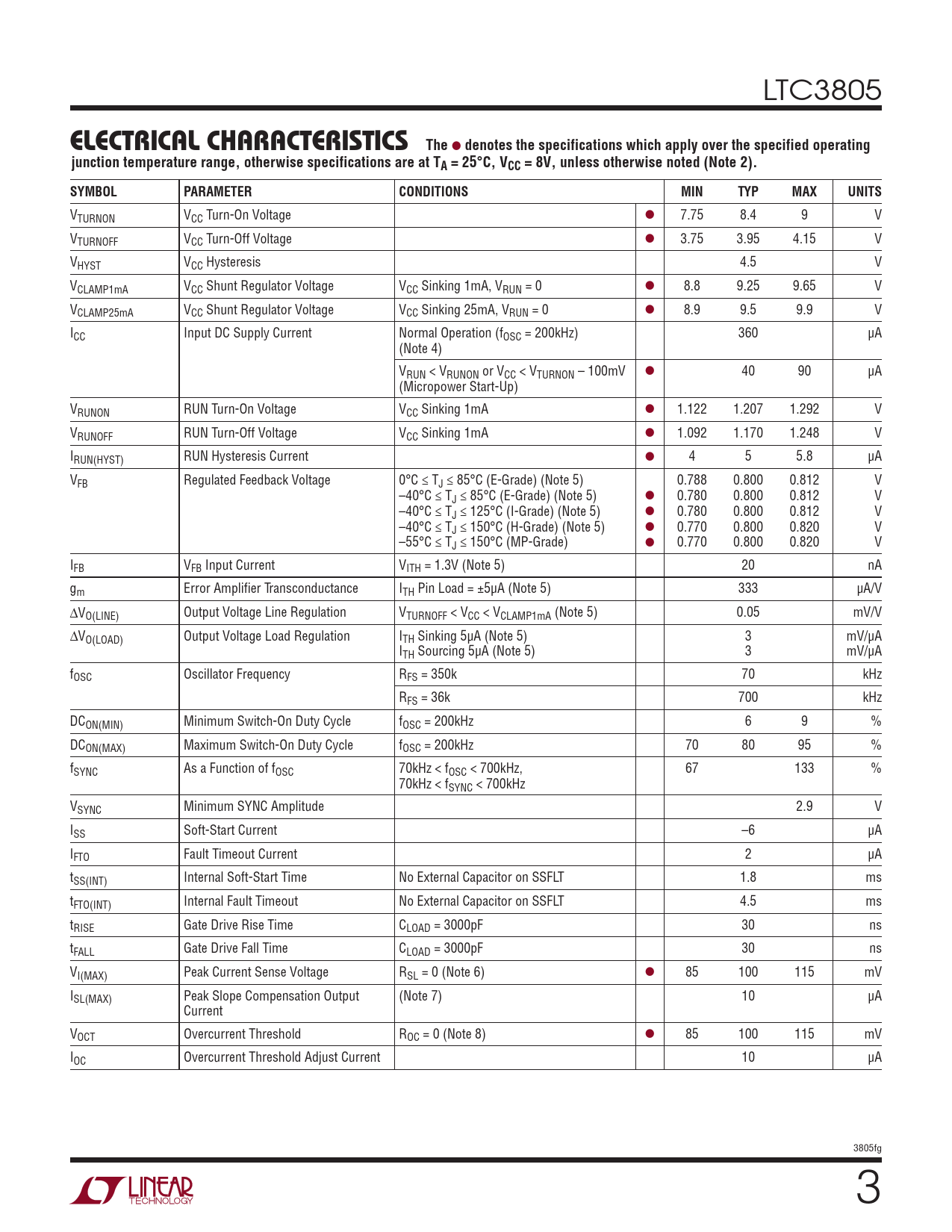 VTURNON VCC Turn-On Voltage l 7.75 8.4 9 V VTURNOFF VCC Turn-Off Voltage l 3.75 3.95 4.15 V VHYST VCC Hysteresis 4.5 V VCLAMP1mA VCC Shunt Regulator Voltage VCC Sinking 1mA, VRUN = 0 l 8.8 9.25 9.65 V VCLAMP25mA VCC Shunt Regulator Voltage VCC Sinking 25mA, VRUN = 0 l 8.9 9.5 9.9 V ICC Input DC Supply Current Normal Operation (fOSC = 200kHz) 360 µA (Note 4) VRUN < VRUNON or VCC < VTURNON – 100mV l 40 90 µA (Micropower Start-Up) VRUNON RUN Turn-On Voltage VCC Sinking 1mA l 1.122 1.207 1.292 V VRUNOFF RUN Turn-Off Voltage VCC Sinking 1mA l 1.092 1.170 1.248 V IRUN(HYST) RUN Hysteresis Current l 4 5 5.8 µA VFB Regulated Feedback Voltage 0°C ≤ TJ ≤ 85°C (E-Grade) (Note 5) 0.788 0.800 0.812 V –40°C ≤ TJ ≤ 85°C (E-Grade) (Note 5) l 0.780 0.800 0.812 V –40°C ≤ TJ ≤ 125°C (I-Grade) (Note 5) l 0.780 0.800 0.812 V –40°C ≤ TJ ≤ 150°C (H-Grade) (Note 5) l 0.770 0.800 0.820 V –55°C ≤ TJ ≤ 150°C (MP-Grade) l 0.770 0.800 0.820 V IFB VFB Input Current VITH = 1.3V (Note 5) 20 nA gm Error Amplifier Transconductance ITH Pin Load = ±5µA (Note 5) 333 µA/V ∆VO(LINE) Output Voltage Line Regulation VTURNOFF < VCC < VCLAMP1mA (Note 5) 0.05 mV/V ∆VO(LOAD) Output Voltage Load Regulation ITH Sinking 5µA (Note 5) 3 mV/µA ITH Sourcing 5µA (Note 5) 3 mV/µA fOSC Oscillator Frequency RFS = 350k 70 kHz RFS = 36k 700 kHz DCON(MIN) Minimum Switch-On Duty Cycle fOSC = 200kHz 6 9 % DCON(MAX) Maximum Switch-On Duty Cycle fOSC = 200kHz 70 80 95 % fSYNC As a Function of fOSC 70kHz < fOSC < 700kHz, 67 133 % 70kHz < fSYNC < 700kHz VSYNC Minimum SYNC Amplitude 2.9 V ISS Soft-Start Current –6 µA IFTO Fault Timeout Current 2 µA tSS(INT) Internal Soft-Start Time No External Capacitor on SSFLT 1.8 ms tFTO(INT) Internal Fault Timeout No External Capacitor on SSFLT 4.5 ms tRISE Gate Drive Rise Time CLOAD = 3000pF 30 ns tFALL Gate Drive Fall Time CLOAD = 3000pF 30 ns VI(MAX) Peak Current Sense Voltage RSL = 0 (Note 6) l 85 100 115 mV ISL(MAX) Peak Slope Compensation Output (Note 7) 10 µA Current VOCT Overcurrent Threshold ROC = 0 (Note 8) l 85 100 115 mV IOC Overcurrent Threshold Adjust Current 10 µA 3805fg 3 Document Outline Features Applications Description Typical Application Absolute Maximum Ratings Pin Configuration 0rder Information Electrical Characteristics Typical Performance Characteristics Pin Functions Block Diagram Operation Applications Information Typical Application Package Description Revision History Typical Application Related Parts