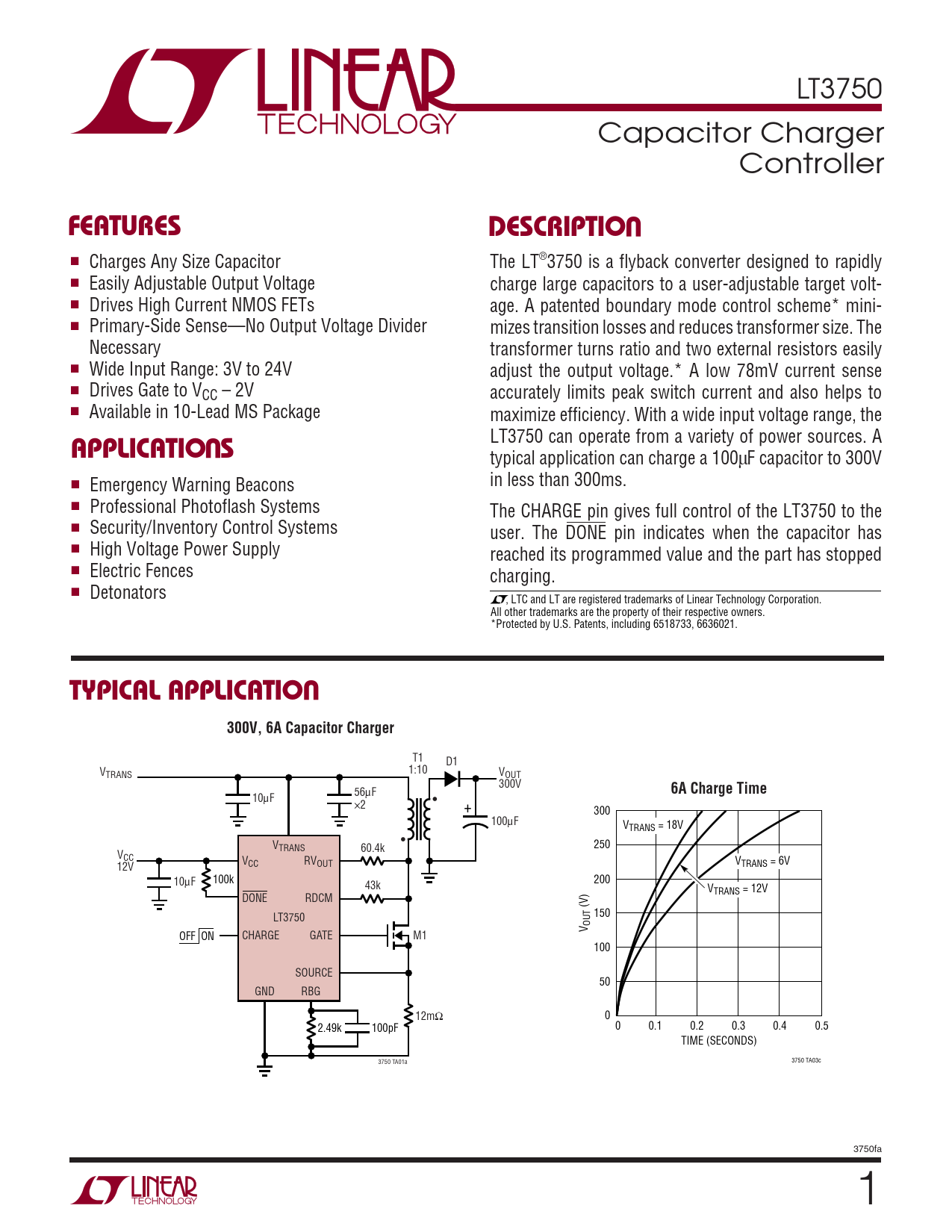 FEATURES. DESCRIPTIO. APPLICATIO S. TYPICAL APPLICATIO. 300V, 6A Capacitor Charger. 6A Charge Time