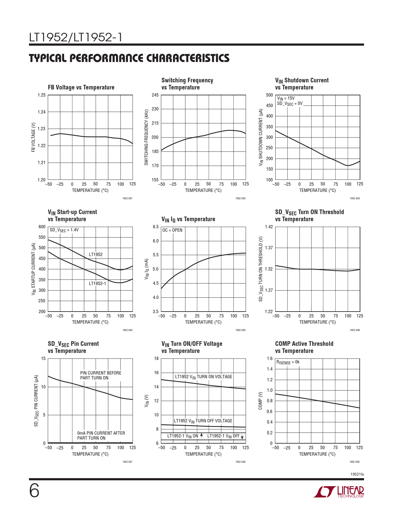 600 6.5 1.42 SD_VSEC = 1.4V OC = OPEN 550 6.0 500 1.37 LT1952 5.5 450 400 (mA) 5.0 1.32 I Q 350 V IN LT1952-1 4.5 TURN ON THRESHOLD (V) STARTUP CURRENT (µA) 300 SEC 1.27 V IN 4.0 250 SD_V 200 3.5 1.22 –50 –25 0 25 50 75 100 125 –50 –25 0 25 50 75 100 125 –50 –25 0 25 50 75 100 125 TEMPERATURE (°C) TEMPERATURE (°C) TEMPERATURE (°C) 1952 G04 1952 G05 1952 G06