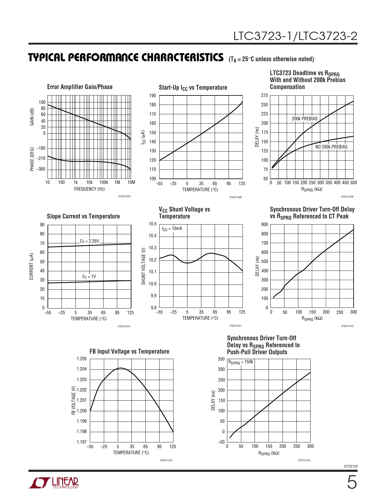 C unless otherwise noted) LTC3723 Deadtime vs RDPRG With and Without 200k Prebias Error Amplifier Gain/Phase Start-Up ICC vs Temperature Compensation