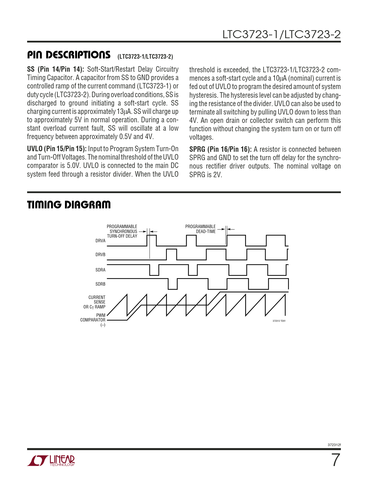 LTC3723-1/LTC3723-2 UUPI DESCRIPTIO S (LTC3723-1/LTC3723-2)SS (Pin 14/Pin 14): Soft-Start/Restart Delay Circuitry threshold is exceeded, the LTC3723-1/LTC3723-2 com- Timing Capacitor. A capacitor from SS to GND provides a mences a soft-start cycle and a 10µA (nominal) current is controlled ramp of the current command (LTC3723-1) or fed out of UVLO to program the desired amount of system duty cycle (LTC3723-2). During overload conditions, SS is hysteresis. The hysteresis level can be adjusted by chang- discharged to ground initiating a soft-start cycle. SS ing the resistance of the divider. UVLO can also be used to charging current is approximately 13µA. SS will charge up terminate all switching by pulling UVLO down to less than to approximately 5V in normal operation. During a con- 4V. An open drain or collector switch can perform this stant overload current fault, SS will oscillate at a low function without changing the system turn on or turn off frequency between approximately 0.5V and 4V. voltages. UVLO (Pin 15/Pin 15): Input to Program System Turn-On SPRG (Pin 16/Pin 16): A resistor is connected between and Turn-Off Voltages. The nominal threshold of the UVLO SPRG and GND to set the turn off delay for the synchro- comparator is 5.0V. UVLO is connected to the main DC nous rectifier driver outputs. The nominal voltage on system feed through a resistor divider. When the UVLO SPRG is 2V. WUWTI I G DIAGRA PROGRAMMABLE PROGRAMMABLE SYNCHRONOUS DEAD-TIME TURN-OFF DELAY DRVA DRVB SDRA SDRB CURRENT SENSE OR CT RAMP PWM COMPARATOR 372312 TD01 (–) 372312f 7