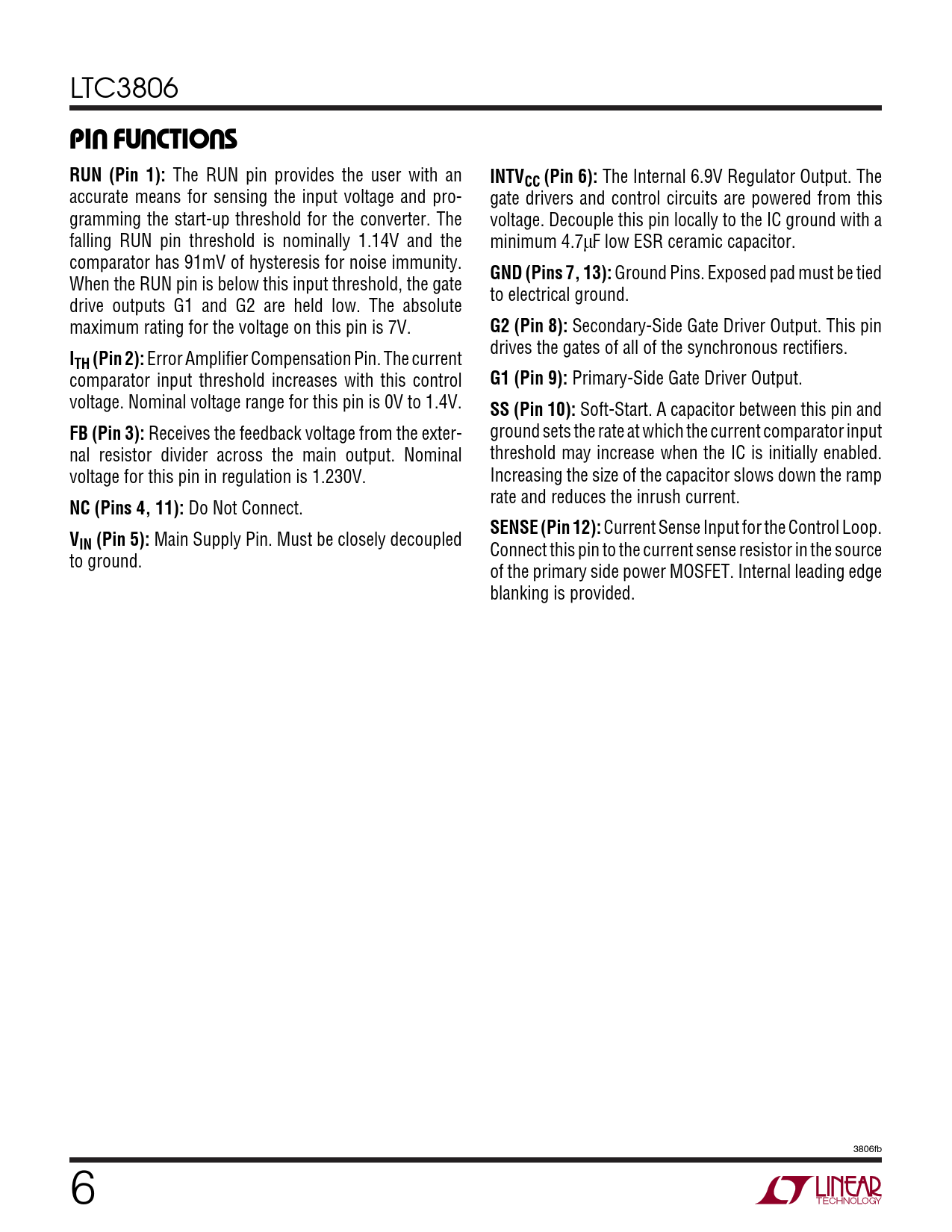 PI FU CTIO S. RUN (Pin 1):. INTVCC. (Pin 6):. GND (Pins 7, 13):. G2 (Pin 8):. ITH (Pin 2):. G1 (Pin 9):. SS (Pin 10):. FB (Pin 3):