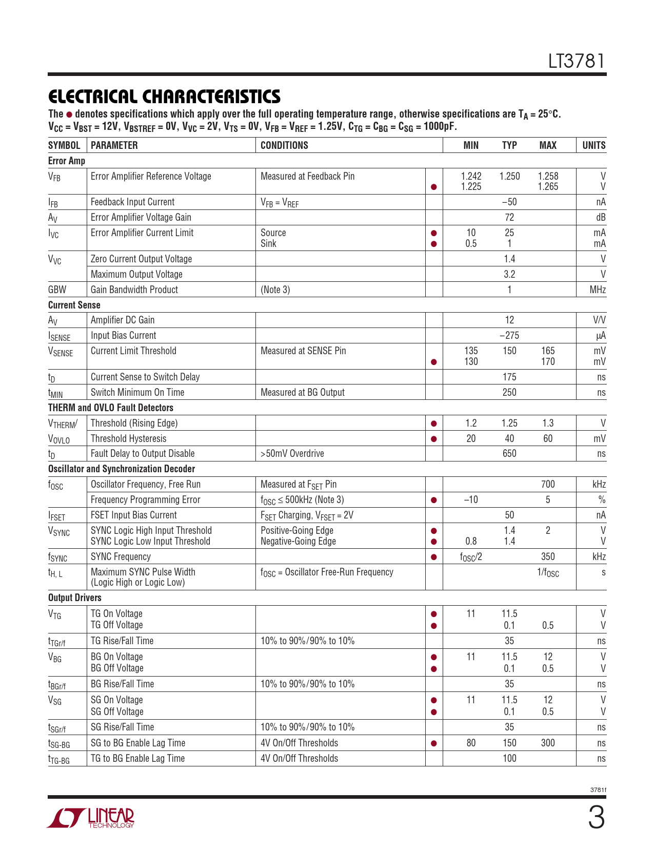 VTG TG On Voltage ● 11 11.5 V TG Off Voltage ● 0.1 0.5 V tTGr/f TG Rise/Fall Time 10% to 90%/90% to 10% 35 ns VBG BG On Voltage ● 11 11.5 12 V BG Off Voltage ● 0.1 0.5 V tBGr/f BG Rise/Fall Time 10% to 90%/90% to 10% 35 ns VSG SG On Voltage ● 11 11.5 12 V SG Off Voltage ● 0.1 0.5 V tSGr/f SG Rise/Fall Time 10% to 90%/90% to 10% 35 ns tSG-BG SG to BG Enable Lag Time 4V On/Off Thresholds ● 80 150 300 ns tTG-BG TG to BG Enable Lag Time 4V On/Off Thresholds 100 ns 3781f 3