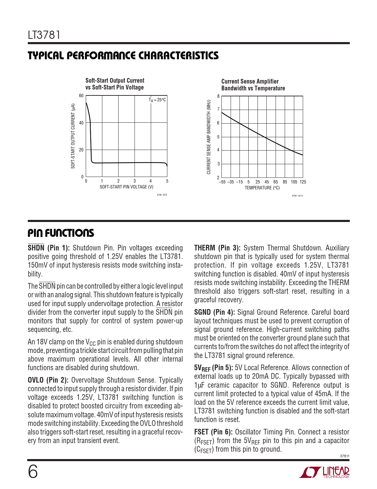 60 8 TA = 25°C µA) 7 40 6 5 20 4 3 SOFT-START OUTPUT CURRENT ( CURRENT SENSE AMP BANDWIDTH (MHz) 0 2 0 1 2 3 4 5 –55 –35 –15 5 25 45 65 85 105 125 SOFT-START PIN VOLTAGE (V) TEMPERATURE (°C) 3781 G13 3781 G14