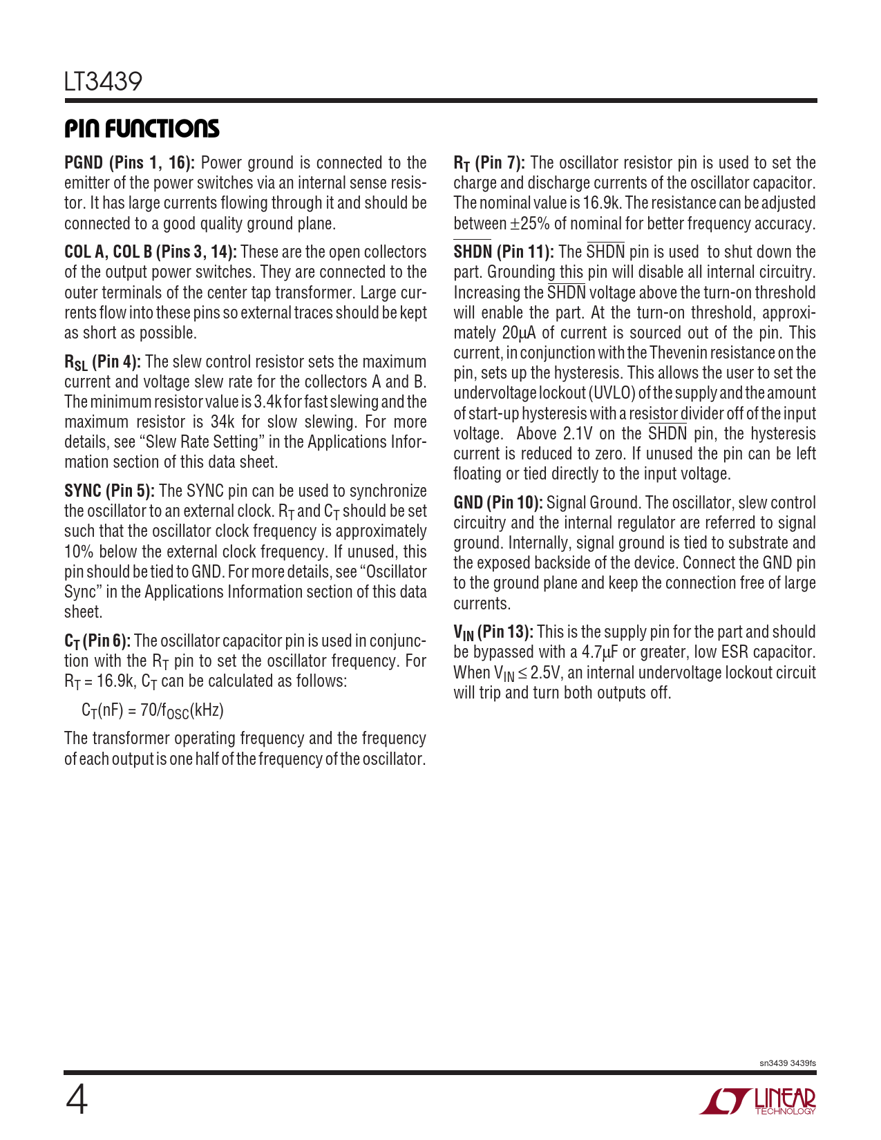The oscillator capacitor pin is used in conjunc- be bypassed with a 4.7µF or greater, low ESR capacitor. tion with the RT pin to set the oscillator frequency. For When V R IN ≤ 2.5V, an internal undervoltage lockout circuit T = 16.9k, CT can be calculated as follows: will trip and turn both outputs off. CT(nF) = 70/fOSC(kHz) The transformer operating frequency and the frequency of each output is one half of the frequency of the oscillator. sn3439 3439fs 4