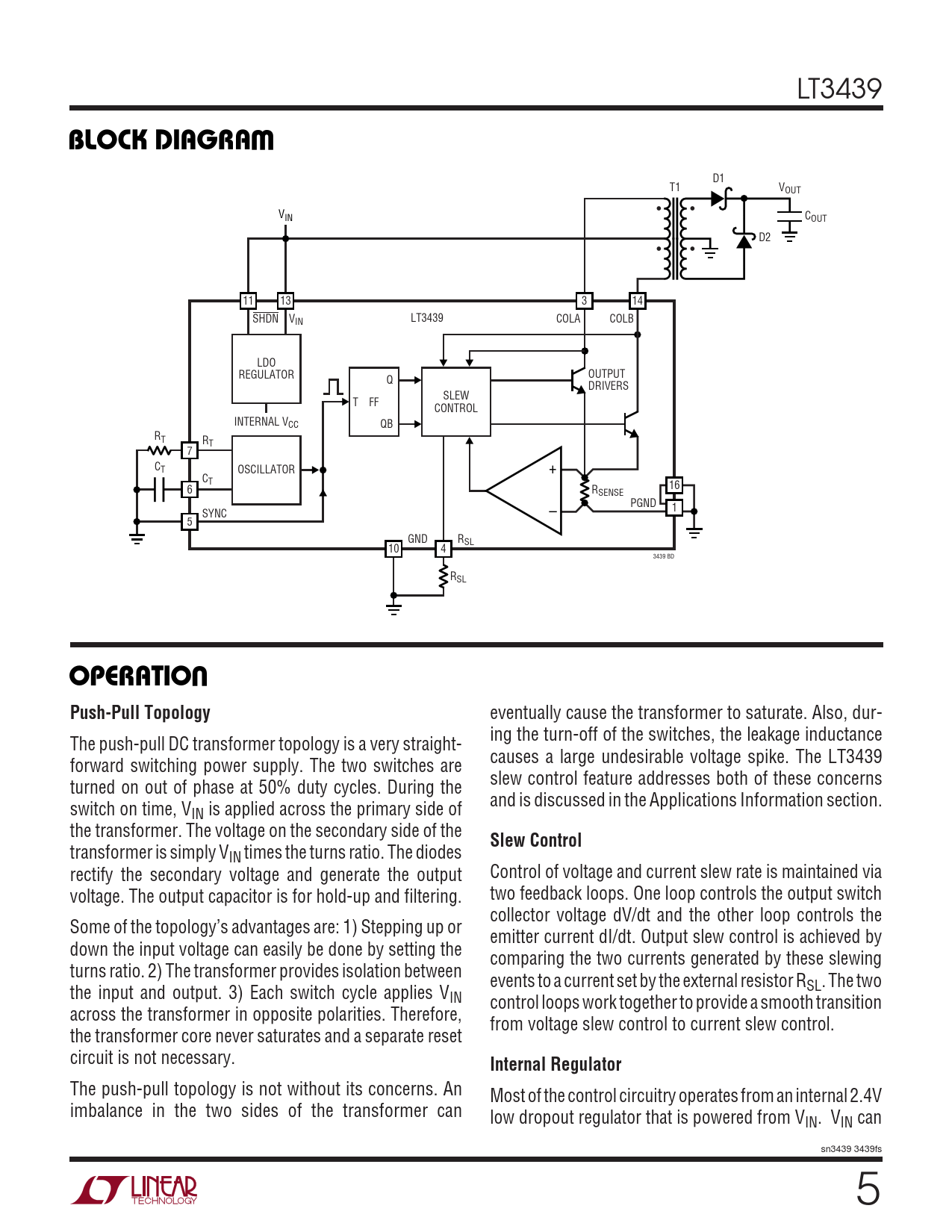 D1 T1 VOUT • • VIN COUT D2 • • 11 13 3 14 SHDN V LT3439 COLA COLB IN LDO REGULATOR OUTPUT Q DRIVERS SLEW T FF CONTROL INTERNAL VCC QB RT RT 7 CT OSCILLATOR + CT 6 R 16 SENSE PGND 1 SYNC – 5 GND RSL 10 4 3439 BD RSL