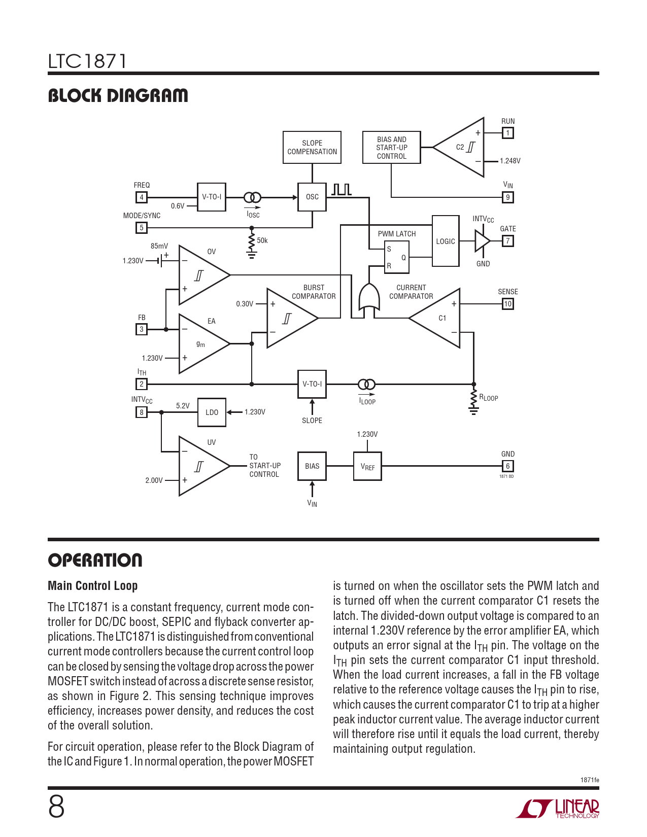 RUN + 1 BIAS AND SLOPE START-UP C2 COMPENSATION CONTROL – 1.248V FREQ VIN 4 V-TO-I OSC 9 0.6V MODE/SYNC IOSC INTVCC 5 GATE PWM LATCH 50k LOGIC 7 85mV S + – OV 1.230V Q R GND + BURST CURRENT SENSE COMPARATOR COMPARATOR + 0.30V + 10 FB – EA C1 – 3 – gm + 1.230V ITH 2 V-TO-I INTV R CC I LOOP LOOP 5.2V 8 LDO 1.230V SLOPE 1.230V UV – TO GND START-UP BIAS VREF 6 + CONTROL 1871 BD 2.00V VIN