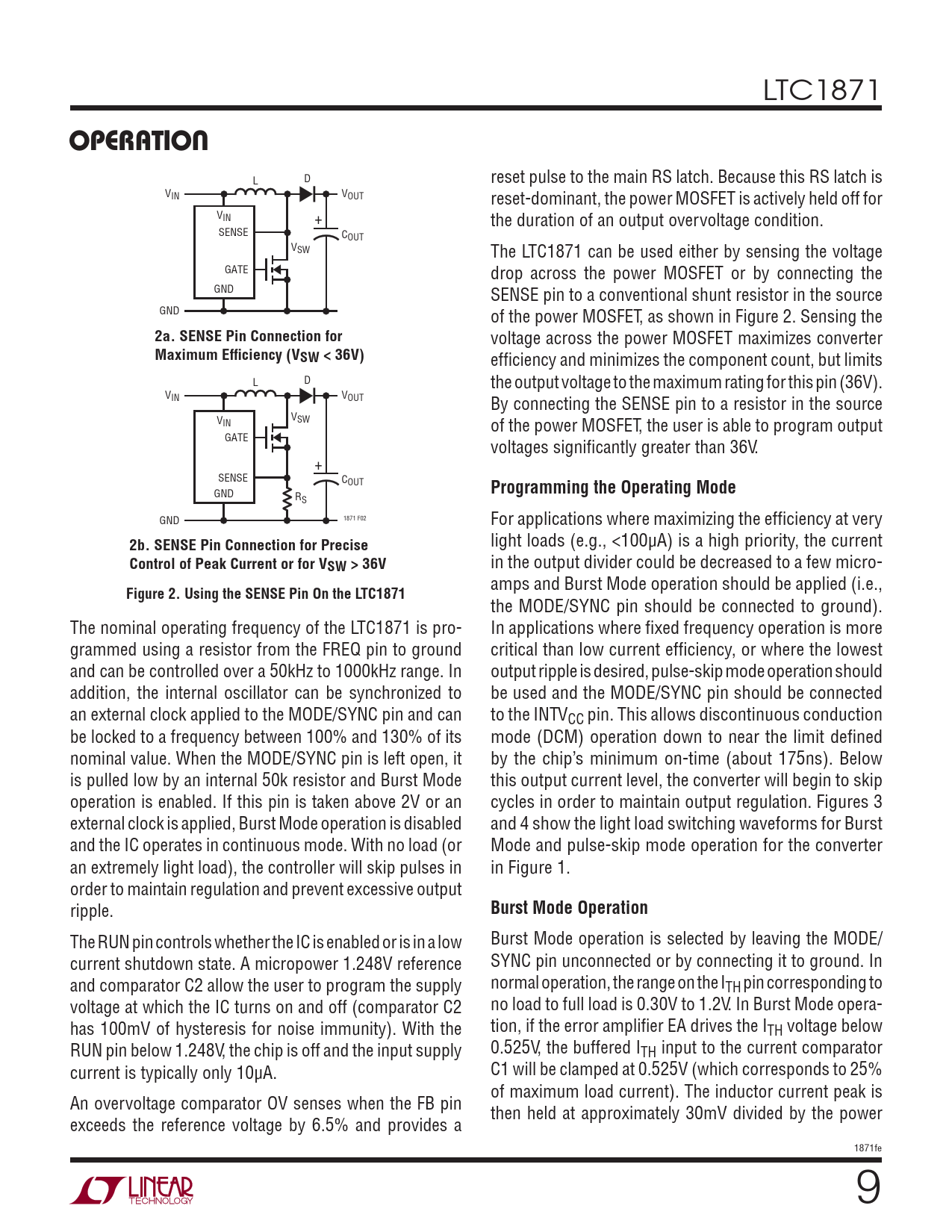 LTC1871 OPERATION L D reset pulse to the main RS latch. Because this RS latch is V V IN OUT reset-dominant, the power MOSFET is actively held off for VIN + the duration of an output overvoltage condition. SENSE COUT VSW The LTC1871 can be used either by sensing the voltage GATE drop across the power MOSFET or by connecting the GND SENSE pin to a conventional shunt resistor in the source GND of the power MOSFET, as shown in Figure 2. Sensing the 2a. SENSE Pin Connection for voltage across the power MOSFET maximizes converter Maximum Efficiency (VSW < 36V) effi ciency and minimizes the component count, but limits L D the output voltage to the maximum rating for this pin (36V). V V IN OUT By connecting the SENSE pin to a resistor in the source V V SW IN of the power MOSFET, the user is able to program output GATE voltages signifi cantly greater than 36V. + SENSE COUT GND Programming the Operating Mode RS 1871 F02 GND For applications where maximizing the effi ciency at very light loads (e.g., <100μA) is a high priority, the current 2b. SENSE Pin Connection for Precise Control of Peak Current or for VSW > 36V in the output divider could be decreased to a few micro- amps and Burst Mode operation should be applied (i.e., Figure 2. Using the SENSE Pin On the LTC1871 the MODE/SYNC pin should be connected to ground). The nominal operating frequency of the LTC1871 is pro- In applications where fi xed frequency operation is more grammed using a resistor from the FREQ pin to ground critical than low current effi ciency, or where the lowest and can be controlled over a 50kHz to 1000kHz range. In output ripple is desired, pulse-skip mode operation should addition, the internal oscillator can be synchronized to be used and the MODE/SYNC pin should be connected an external clock applied to the MODE/SYNC pin and can to the INTVCC pin. This allows discontinuous conduction be locked to a frequency between 100% and 130% of its mode (DCM) operation down to near the limit defi ned nominal value. When the MODE/SYNC pin is left open, it by the chip’s minimum on-time (about 175ns). Below is pulled low by an internal 50k resistor and Burst Mode this output current level, the converter will begin to skip operation is enabled. If this pin is taken above 2V or an cycles in order to maintain output regulation. Figures 3 external clock is applied, Burst Mode operation is disabled and 4 show the light load switching waveforms for Burst and the IC operates in continuous mode. With no load (or Mode and pulse-skip mode operation for the converter an extremely light load), the controller will skip pulses in in Figure 1. order to maintain regulation and prevent excessive output ripple. Burst Mode Operation The RUN pin controls whether the IC is enabled or is in a low Burst Mode operation is selected by leaving the MODE/ current shutdown state. A micropower 1.248V reference SYNC pin unconnected or by connecting it to ground. In and comparator C2 allow the user to program the supply normal operation, the range on the ITH pin corresponding to voltage at which the IC turns on and off (comparator C2 no load to full load is 0.30V to 1.2V. In Burst Mode opera- has 100mV of hysteresis for noise immunity). With the tion, if the error amplifi er EA drives the ITH voltage below RUN pin below 1.248V, the chip is off and the input supply 0.525V, the buffered ITH input to the current comparator current is typically only 10μA. C1 will be clamped at 0.525V (which corresponds to 25% of maximum load current). The inductor current peak is An overvoltage comparator OV senses when the FB pin then held at approximately 30mV divided by the power exceeds the reference voltage by 6.5% and provides a 1871fe 9