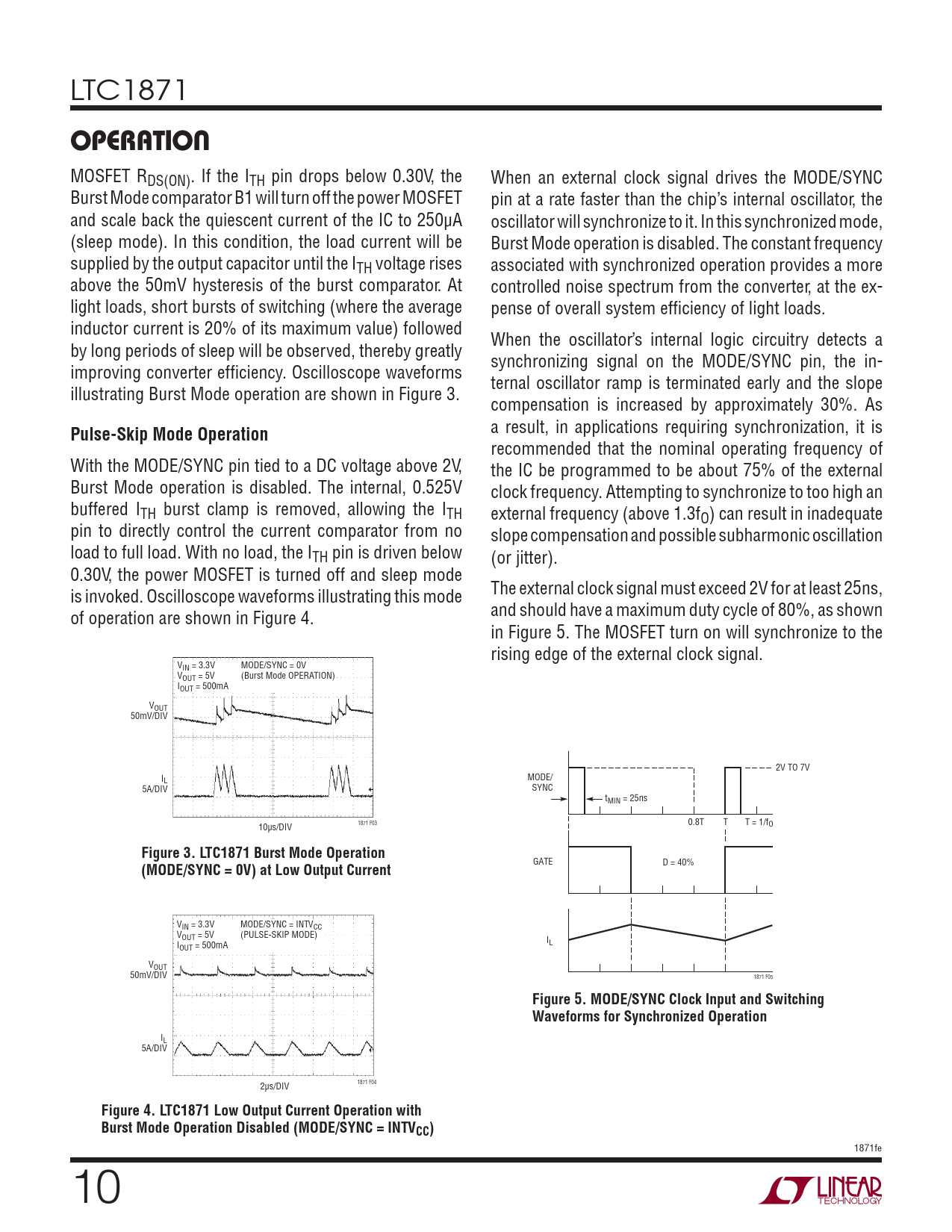 LTC1871 OPERATION MOSFET RDS(ON). If the ITH pin drops below 0.30V, the When an external clock signal drives the MODE/SYNC Burst Mode comparator B1 will turn off the power MOSFET pin at a rate faster than the chip’s internal oscillator, the and scale back the quiescent current of the IC to 250μA oscillator will synchronize to it. In this synchronized mode, (sleep mode). In this condition, the load current will be Burst Mode operation is disabled. The constant frequency supplied by the output capacitor until the ITH voltage rises associated with synchronized operation provides a more above the 50mV hysteresis of the burst comparator. At controlled noise spectrum from the converter, at the ex- light loads, short bursts of switching (where the average pense of overall system effi ciency of light loads. inductor current is 20% of its maximum value) followed When the oscillator’s internal logic circuitry detects a by long periods of sleep will be observed, thereby greatly synchronizing signal on the MODE/SYNC pin, the in- improving converter effi ciency. Oscilloscope waveforms ternal oscillator ramp is terminated early and the slope illustrating Burst Mode operation are shown in Figure 3. compensation is increased by approximately 30%. As Pulse-Skip Mode Operation a result, in applications requiring synchronization, it is recommended that the nominal operating frequency of With the MODE/SYNC pin tied to a DC voltage above 2V, the IC be programmed to be about 75% of the external Burst Mode operation is disabled. The internal, 0.525V clock frequency. Attempting to synchronize to too high an buffered ITH burst clamp is removed, allowing the ITH external frequency (above 1.3fO) can result in inadequate pin to directly control the current comparator from no slope compensation and possible subharmonic oscillation load to full load. With no load, the ITH pin is driven below (or jitter). 0.30V, the power MOSFET is turned off and sleep mode is invoked. Oscilloscope waveforms illustrating this mode The external clock signal must exceed 2V for at least 25ns, of operation are shown in Figure 4. and should have a maximum duty cycle of 80%, as shown in Figure 5. The MOSFET turn on will synchronize to the rising edge of the external clock signal. VIN = 3.3V MODE/SYNC = 0V VOUT = 5V (Burst Mode OPERATION) IOUT = 500mA VOUT 50mV/DIV 2V TO 7V IL MODE/ 5A/DIV SYNC tMIN = 25ns 0.8T T T = 1/f 10μs/DIV 1871 F03 O Figure 3. LTC1871 Burst Mode Operation GATE D = 40% (MODE/SYNC = 0V) at Low Output Current VIN = 3.3V MODE/SYNC = INTVCC VOUT = 5V (PULSE-SKIP MODE) I I L OUT = 500mA VOUT 50mV/DIV 1871 F05 Figure 5. MODE/SYNC Clock Input and Switching Waveforms for Synchronized Operation IL 5A/DIV 2μs/DIV 1871 F04 Figure 4. LTC1871 Low Output Current Operation with Burst Mode Operation Disabled (MODE/SYNC = INTVCC) 1871fe 10