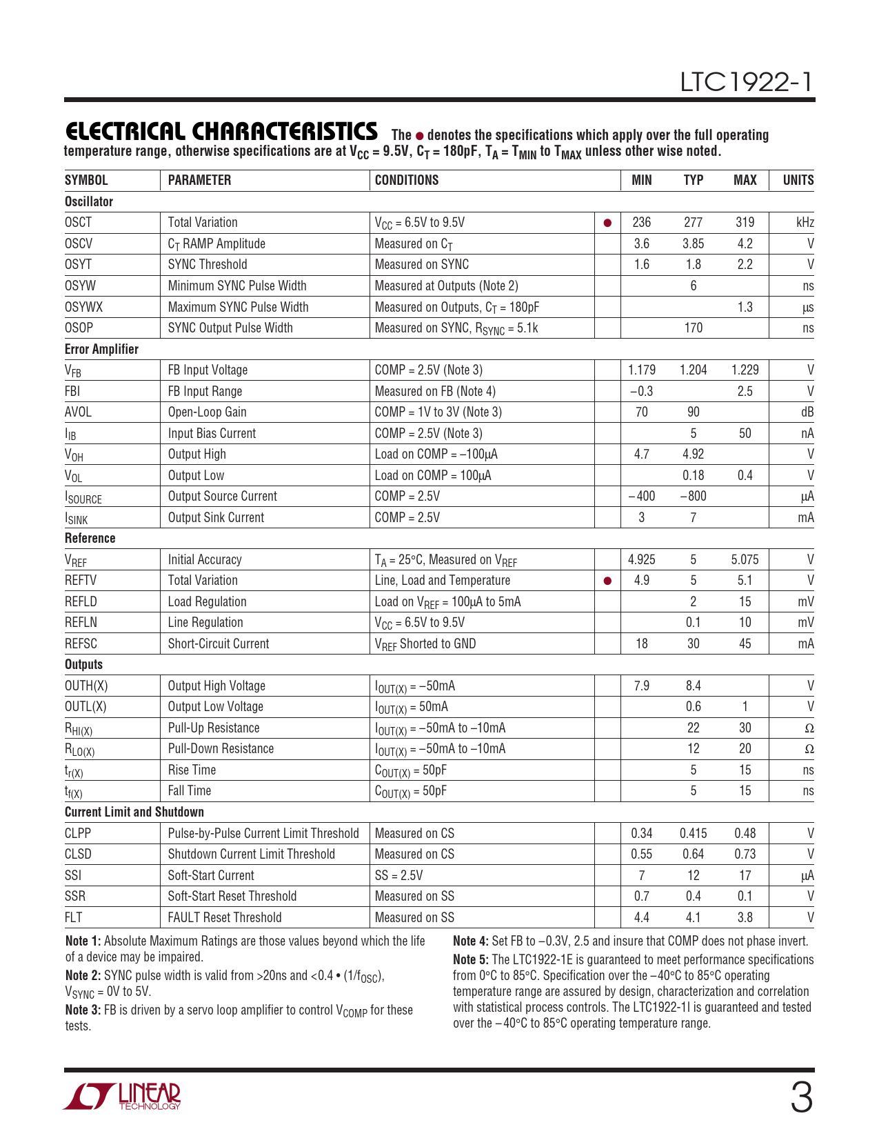 OSCT Total Variation VCC = 6.5V to 9.5V ● 236 277 319 kHz OSCV CT RAMP Amplitude Measured on CT 3.6 3.85 4.2 V OSYT SYNC Threshold Measured on SYNC 1.6 1.8 2.2 V OSYW Minimum SYNC Pulse Width Measured at Outputs (Note 2) 6 ns OSYWX Maximum SYNC Pulse Width Measured on Outputs, CT = 180pF 1.3 µs OSOP SYNC Output Pulse Width Measured on SYNC, RSYNC = 5.1k 170 ns
