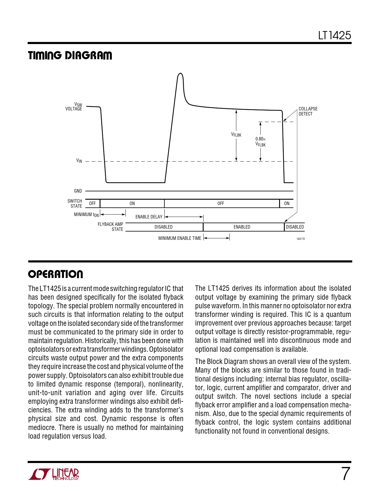 LT1425 W UWTI I G DIAGRA VSW VOLTAGE COLLAPSE DETECT VFLBK 0.80× VFLBK VIN GND SWITCH OFF ON OFF ON STATE MINIMUM tON ENABLE DELAY FLYBACK AMP DISABLED ENABLED DISABLED STATE MINIMUM ENABLE TIME 1425 TD UOPERATION The LT1425 is a current mode switching regulator IC that The LT1425 derives its information about the isolated has been designed specifically for the isolated flyback output voltage by examining the primary side flyback topology. The special problem normally encountered in pulse waveform. In this manner no optoisolator nor extra such circuits is that information relating to the output transformer winding is required. This IC is a quantum voltage on the isolated secondary side of the transformer improvement over previous approaches because: target must be communicated to the primary side in order to output voltage is directly resistor-programmable, regu- maintain regulation. Historically, this has been done with lation is maintained well into discontinuous mode and optoisolators or extra transformer windings. Optoisolator optional load compensation is available. circuits waste output power and the extra components The Block Diagram shows an overall view of the system. they require increase the cost and physical volume of the Many of the blocks are similar to those found in tradi- power supply. Optoisolators can also exhibit trouble due tional designs including: internal bias regulator, oscilla- to limited dynamic response (temporal), nonlinearity, tor, logic, current amplifier and comparator, driver and unit-to-unit variation and aging over life. Circuits output switch. The novel sections include a special employing extra transformer windings also exhibit defi- flyback error amplifier and a load compensation mecha- ciencies. The extra winding adds to the transformer’s nism. Also, due to the special dynamic requirements of physical size and cost. Dynamic response is often flyback control, the logic system contains additional mediocre. There is usually no method for maintaining functionality not found in conventional designs. load regulation versus load. 7