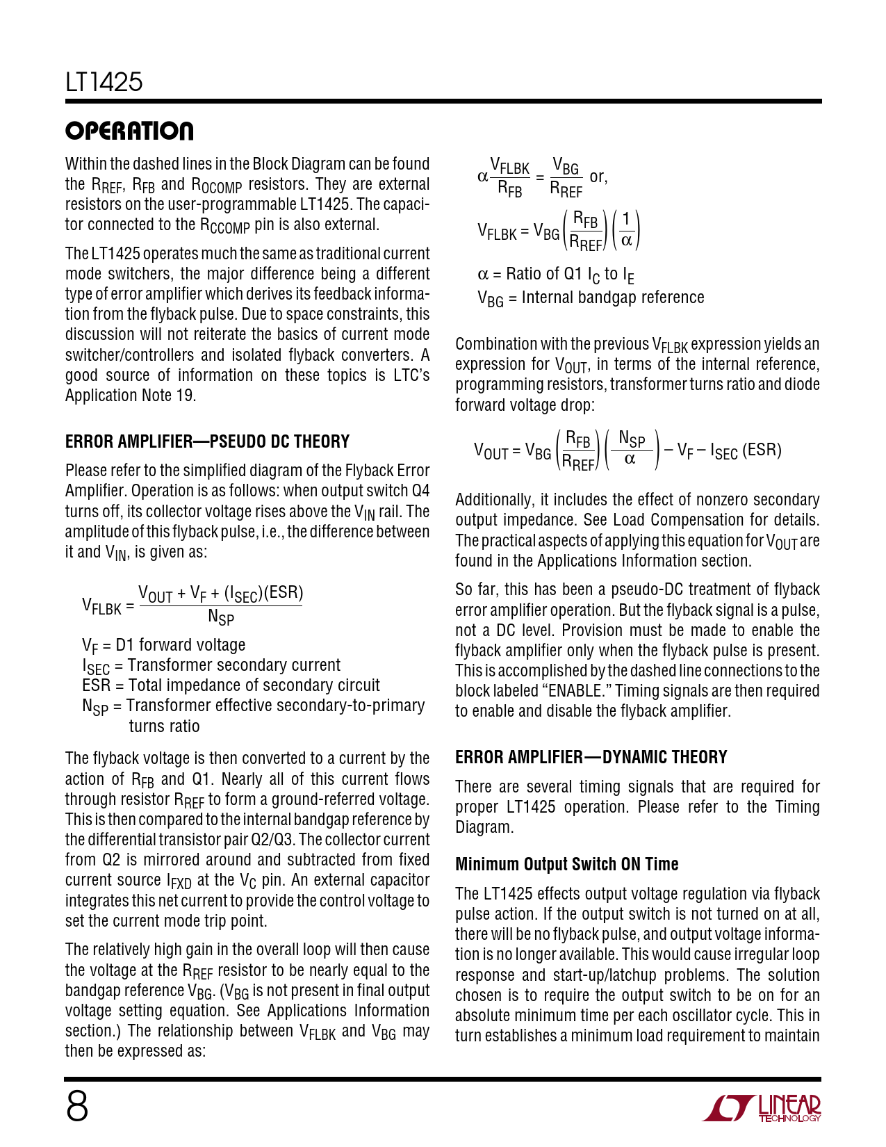 LT1425 UOPERATION Within the dashed lines in the Block Diagram can be found VFLBK α VBG the R = or, REF, RFB and ROCOMP resistors. They are external RFB RREF resistors on the user-programmable LT1425. The capaci- tor connected to the R R 1 CCOMP pin is also external. V FB ) FLBK = VBG R α The LT1425 operates much the same as traditional current REF mode switchers, the major difference being a different α = Ratio of Q1 IC to IE type of error amplifier which derives its feedback informa- VBG = Internal bandgap reference tion from the flyback pulse. Due to space constraints, this discussion will not reiterate the basics of current mode Combination with the previous V switcher/controllers and isolated flyback converters. A FLBK expression yields an expression for V good source of information on these topics is LTC’s OUT, in terms of the internal reference, programming resistors, transformer turns ratio and diode Application Note 19. forward voltage drop: ERROR AMPLIFIER—PSEUDO DC THEORY R N V FB ) SP ) OUT = VBG – VF – ISEC (ESR) R α Please refer to the simplified diagram of the Flyback Error REF Amplifier. Operation is as follows: when output switch Q4 Additionally, it includes the effect of nonzero secondary turns off, its collector voltage rises above the VIN rail. The output impedance. See Load Compensation for details. amplitude of this flyback pulse, i.e., the difference between The practical aspects of applying this equation for V it and V OUT are IN, is given as: found in the Applications Information section. V So far, this has been a pseudo-DC treatment of flyback V OUT + VF + (ISEC)(ESR) FLBK = N error amplifier operation. But the flyback signal is a pulse, SP not a DC level. Provision must be made to enable the VF = D1 forward voltage flyback amplifier only when the flyback pulse is present. I SEC = Transformer secondary current This is accomplished by the dashed line connections to the ESR = Total impedance of secondary circuit block labeled “ENABLE.” Timing signals are then required NSP = Transformer effective secondary-to-primary to enable and disable the flyback amplifier. turns ratio The flyback voltage is then converted to a current by the ERROR AMPLIFIER—DYNAMIC THEORY action of RFB and Q1. Nearly all of this current flows There are several timing signals that are required for through resistor RREF to form a ground-referred voltage. proper LT1425 operation. Please refer to the Timing This is then compared to the internal bandgap reference by Diagram. the differential transistor pair Q2/Q3. The collector current from Q2 is mirrored around and subtracted from fixed Minimum Output Switch ON Time current source IFXD at the VC pin. An external capacitor integrates this net current to provide the control voltage to The LT1425 effects output voltage regulation via flyback set the current mode trip point. pulse action. If the output switch is not turned on at all, there will be no flyback pulse, and output voltage informa- The relatively high gain in the overall loop will then cause tion is no longer available. This would cause irregular loop the voltage at the RREF resistor to be nearly equal to the response and start-up/latchup problems. The solution bandgap reference VBG. (VBG is not present in final output chosen is to require the output switch to be on for an voltage setting equation. See Applications Information absolute minimum time per each oscillator cycle. This in section.) The relationship between VFLBK and VBG may turn establishes a minimum load requirement to maintain then be expressed as: 8