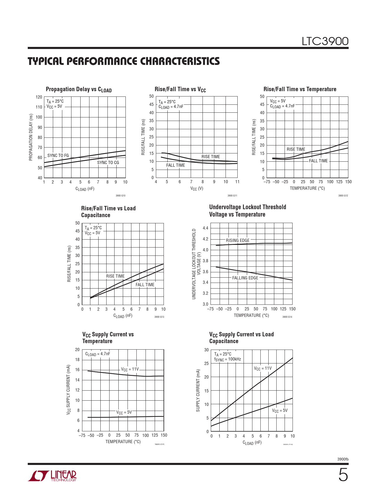 50 T 4.4 45 A = 25°C VCC = 5V 40 4.2 RISING EDGE 35 4.0 30 3.8 25 20 3.6 RISE TIME VOLTAGE (V) RISE/FALL TIME (ns) 15 FALLING EDGE FALL TIME 3.4 10 3.2 5 UNDERVOLTAGE LOCKOUT THRESHOLD 0 3.0 0 1 2 3 4 5 6 7 8 9 10 –75 –50 –25 0 25 50 75 100 125 150 CLOAD (nF) TEMPERATURE (°C) 3900 G13 3900 G14