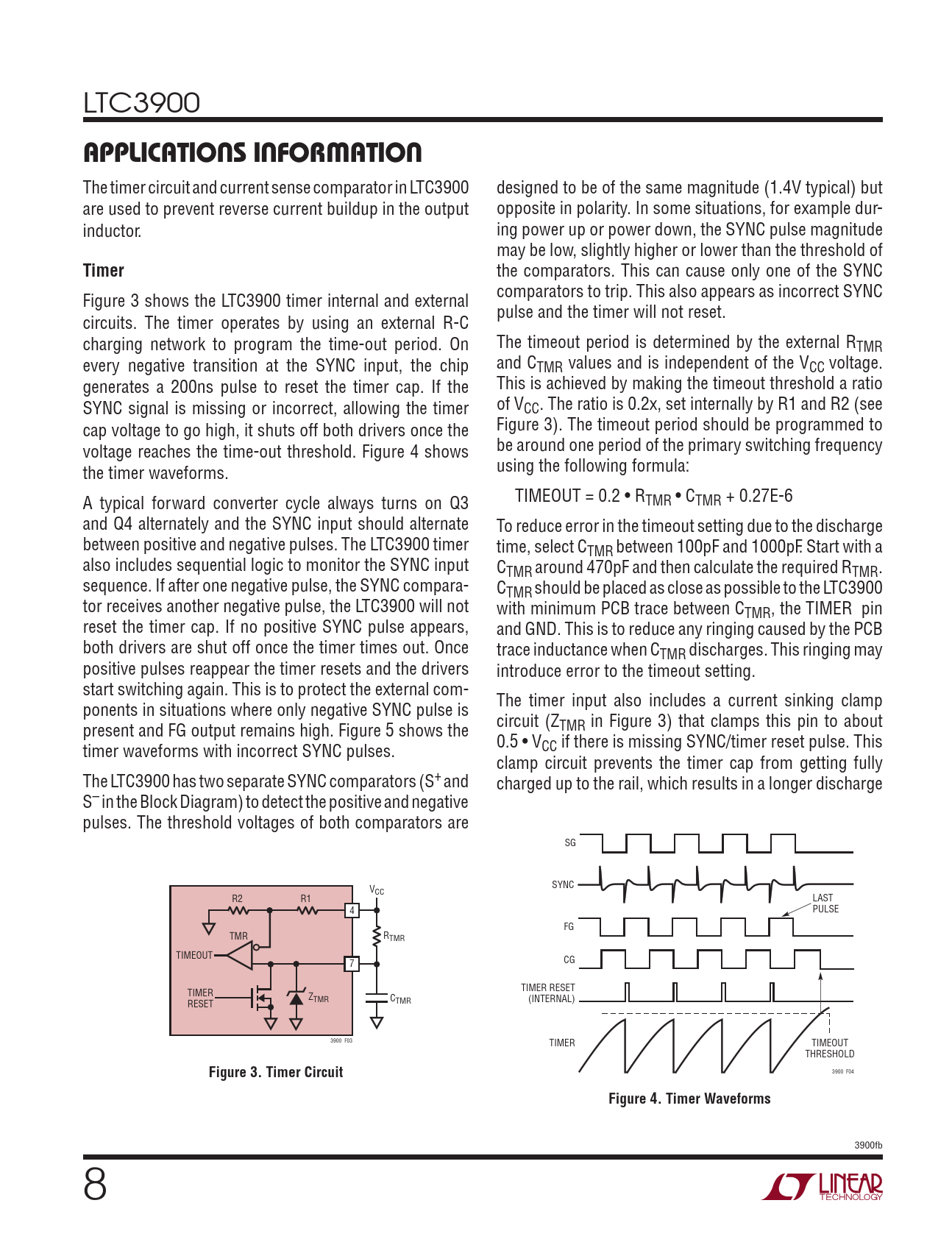 LTC3900 applicaTions inForMaTion The timer circuit and current sense comparator in LTC3900 designed to be of the same magnitude (1.4V typical) but are used to prevent reverse current buildup in the output opposite in polarity. In some situations, for example dur- inductor. ing power up or power down, the SYNC pulse magnitude may be low, slightly higher or lower than the threshold of Timer the comparators. This can cause only one of the SYNC Figure 3 shows the LTC3900 timer internal and external comparators to trip. This also appears as incorrect SYNC circuits. The timer operates by using an external R-C pulse and the timer will not reset. charging network to program the time-out period. On The timeout period is determined by the external RTMR every negative transition at the SYNC input, the chip and CTMR values and is independent of the VCC voltage. generates a 200ns pulse to reset the timer cap. If the This is achieved by making the timeout threshold a ratio SYNC signal is missing or incorrect, allowing the timer of VCC. The ratio is 0.2x, set internally by R1 and R2 (see cap voltage to go high, it shuts off both drivers once the Figure 3). The timeout period should be programmed to voltage reaches the time-out threshold. Figure 4 shows be around one period of the primary switching frequency the timer waveforms. using the following formula: A typical forward converter cycle always turns on Q3 TIMEOUT = 0.2 • RTMR • CTMR + 0.27E-6 and Q4 alternately and the SYNC input should alternate To reduce error in the timeout setting due to the discharge between positive and negative pulses. The LTC3900 timer time, select CTMR between 100pF and 1000pF. Start with a also includes sequential logic to monitor the SYNC input CTMR around 470pF and then calculate the required RTMR. sequence. If after one negative pulse, the SYNC compara- CTMR should be placed as close as possible to the LTC3900 tor receives another negative pulse, the LTC3900 will not with minimum PCB trace between CTMR, the TIMER pin reset the timer cap. If no positive SYNC pulse appears, and GND. This is to reduce any ringing caused by the PCB both drivers are shut off once the timer times out. Once trace inductance when CTMR discharges. This ringing may positive pulses reappear the timer resets and the drivers introduce error to the timeout setting. start switching again. This is to protect the external com- ponents in situations where only negative SYNC pulse is The timer input also includes a current sinking clamp present and FG output remains high. Figure 5 shows the circuit (ZTMR in Figure 3) that clamps this pin to about timer waveforms with incorrect SYNC pulses. 0.5 • VCC if there is missing SYNC/timer reset pulse. This clamp circuit prevents the timer cap from getting fully The LTC3900 has two separate SYNC comparators (S+ and charged up to the rail, which results in a longer discharge S– in the Block Diagram) to detect the positive and negative pulses. The threshold voltages of both comparators are SG V SYNC CC R2 R1 LAST 4 PULSE FG TMR RTMR TIMEOUT 7 CG TIMER TIMER RESET ZTMR CTMR RESET (INTERNAL) 3900 F03 TIMER TIMEOUT THRESHOLD Figure 3. Timer Circuit 3900 F04 Figure 4. Timer Waveforms 3900fb 8 Document Outline Features Description Applications Typical Application Absolute Maximum Ratings Pin Configuration Order Information Electrical Characteristics Typical Performance Characteristics Pin Functions Block Diagram Applications Information Typical Applications Package Description Revision History Typical Application Related Parts