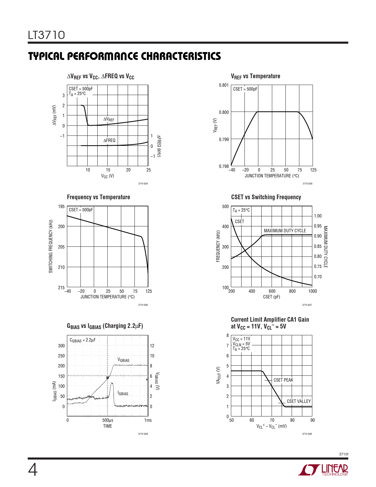 0.801 CSET = 500pF CSET = 500pF 3 TA = 25°C 2 (mV) 0.800 1 REF ∆VREF ∆V (V) 0 REF ∆ V –1 1 FREQ (kHz) ∆FREQ 0.799 0 –1 0.798 10 15 20 25 –40 –20 0 25 50 75 125 VCC (V) JUNCTION TEMPERATURE (°C) 3710 G04 3710 G05