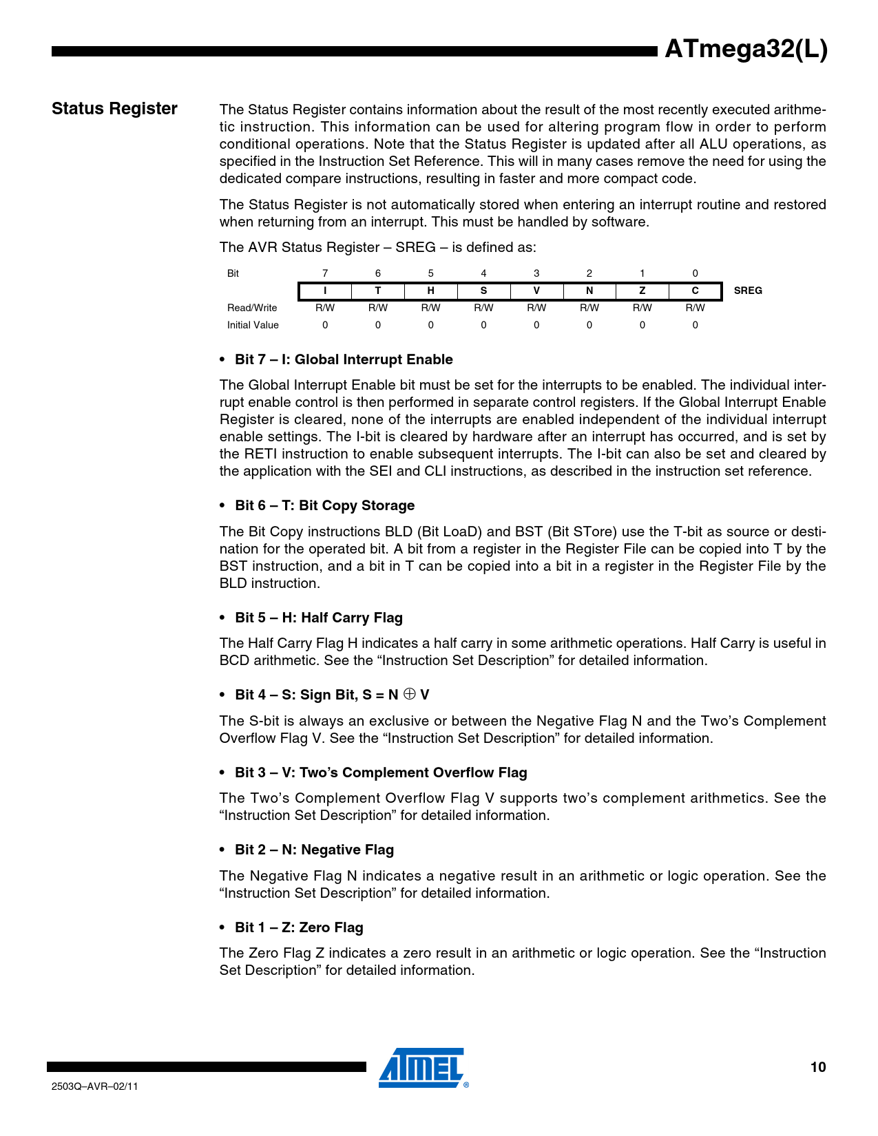 ATmega32(L). Status Register. SREG. • Bit 7 – I: Global Interrupt Enable. • Bit 6 – T: Bit Copy Storage