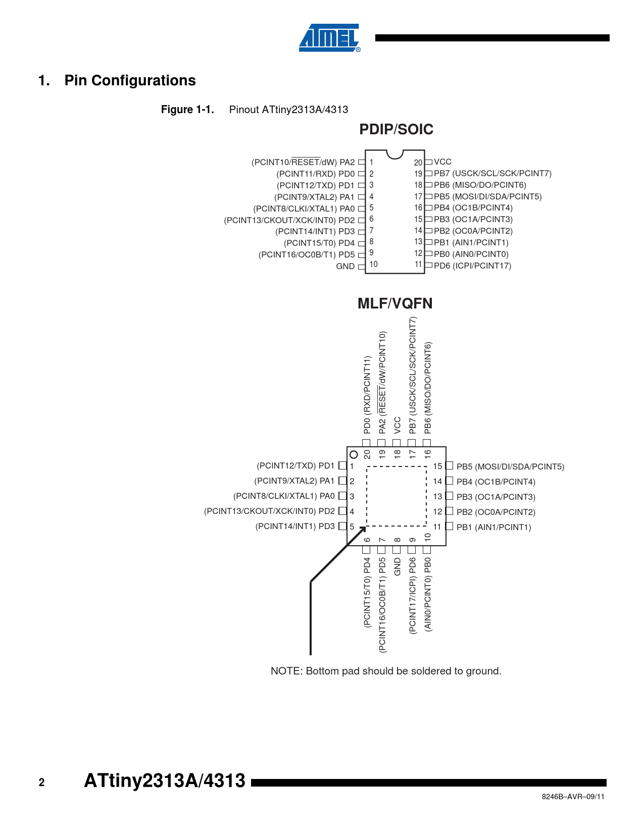 Pin Configurations. Figure 1-1. PDIP/SOIC. MLF/VQFN. ATtiny2313A/4313
