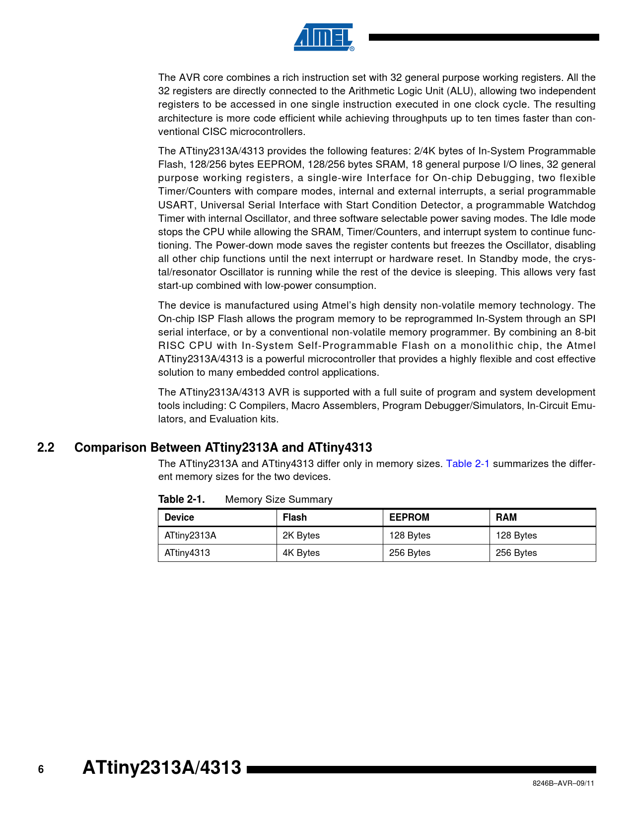 The ATtiny2313A and ATtiny4313 differ only in memory sizes. Table 2-1 summarizes the differ- ent memory sizes for the two devices.