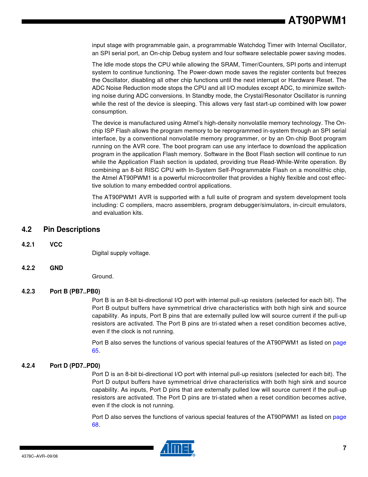 link to page 65 link to page 65 link to page 68 link to page 68 AT90PWM1 input stage with programmable gain, a programmable Watchdog Timer with Internal Oscillator, an SPI serial port, an On-chip Debug system and four software selectable power saving modes. The Idle mode stops the CPU while allowing the SRAM, Timer/Counters, SPI ports and interrupt system to continue functioning. The Power-down mode saves the register contents but freezes the Oscillator, disabling all other chip functions until the next interrupt or Hardware Reset. The ADC Noise Reduction mode stops the CPU and all I/O modules except ADC, to minimize switch- ing noise during ADC conversions. In Standby mode, the Crystal/Resonator Oscillator is running while the rest of the device is sleeping. This allows very fast start-up combined with low power consumption. The device is manufactured using Atmel’s high-density nonvolatile memory technology. The On- chip ISP Flash allows the program memory to be reprogrammed in-system through an SPI serial interface, by a conventional nonvolatile memory programmer, or by an On-chip Boot program running on the AVR core. The boot program can use any interface to download the application program in the application Flash memory. Software in the Boot Flash section will continue to run while the Application Flash section is updated, providing true Read-While-Write operation. By combining an 8-bit RISC CPU with In-System Self-Programmable Flash on a monolithic chip, the Atmel AT90PWM1 is a powerful microcontroller that provides a highly flexible and cost effec- tive solution to many embedded control applications. The AT90PWM1 AVR is supported with a full suite of program and system development tools including: C compilers, macro assemblers, program debugger/simulators, in-circuit emulators, and evaluation kits. 4.2Pin Descriptions4.2.1VCC Digital supply voltage. 4.2.2GND Ground. 4.2.3Port B (PB7..PB0) Port B is an 8-bit bi-directional I/O port with internal pull-up resistors (selected for each bit). The Port B output buffers have symmetrical drive characteristics with both high sink and source capability. As inputs, Port B pins that are externally pulled low will source current if the pull-up resistors are activated. The Port B pins are tri-stated when a reset condition becomes active, even if the clock is not running. Port B also serves the functions of various special features of the AT90PWM1 as listed on page 65. 4.2.4Port D (PD7..PD0) Port D is an 8-bit bi-directional I/O port with internal pull-up resistors (selected for each bit). The Port D output buffers have symmetrical drive characteristics with both high sink and source capability. As inputs, Port D pins that are externally pulled low will source current if the pull-up resistors are activated. The Port D pins are tri-stated when a reset condition becomes active, even if the clock is not running. Port D also serves the functions of various special features of the AT90PWM1 as listed on page 68. 7 4378C–AVR–09/08 Document Outline Features 1. History 2. Disclaimer 3. Pin Configurations 3.1 Pin Descriptions 4. Overview 4.1 Block Diagram 4.2 Pin Descriptions 4.2.1 VCC 4.2.2 GND 4.2.3 Port B (PB7..PB0) 4.2.4 Port D (PD7..PD0) 4.2.5 Port E (PE2..0) RESET/ XTAL1/ XTAL2 4.2.6 AVCC 4.2.7 AREF 4.3 About Code Examples 5. AVR CPU Core 5.1 Introduction 5.2 Architectural Overview 5.3 ALU - Arithmetic Logic Unit 5.4 Status Register 5.5 General Purpose Register File 5.5.1 The X-register, Y-register, and Z-register 5.6 Stack Pointer 5.7 Instruction Execution Timing 5.8 Reset and Interrupt Handling 5.8.1 Interrupt Behavior 5.8.2 Interrupt Response Time 6. Memories 6.1 In-System Reprogrammable Flash Program Memory 6.2 SRAM Data Memory 6.2.1 SRAM Data Access Times 6.3 EEPROM Data Memory 6.3.1 EEPROM Read/Write Access 6.3.2 The EEPROM Address Registers - EEARH and EEARL 6.3.3 The EEPROM Data Register - EEDR 6.3.4 The EEPROM Control Register - EECR 6.3.5 Preventing EEPROM Corruption 6.4 I/O Memory 6.5 General Purpose I/O Registers 6.5.1 General Purpose I/O Register 0 - GPIOR0 6.5.2 General Purpose I/O Register 1 - GPIOR1 6.5.3 General Purpose I/O Register 2 - GPIOR2 6.5.4 General Purpose I/O Register 3- GPIOR3 7. System Clock 7.1 Clock Systems and their Distribution 7.1.1 CPU Clock - clkCPU 7.1.2 I/O Clock - clkI/O 7.1.3 Flash Clock - clkFLASH 7.1.4 PLL Clock - clkPLL 7.1.5 ADC Clock - clkADC 7.2 Clock Sources 7.3 Default Clock Source 7.4 Low Power Crystal Oscillator 7.5 Calibrated Internal RC Oscillator 7.6 PLL 7.6.1 Internal PLL for PSC 7.6.2 PLL Control and Status Register - PLLCSR 7.7 128 kHz Internal Oscillator 7.8 External Clock 7.9 Clock Output Buffer 7.10 System Clock Prescaler 7.10.1 Clock Prescaler Register - CLKPR 8. Power Management and Sleep Modes 8.0.1 Sleep Mode Control Register - SMCR 8.1 Idle Mode 8.2 ADC Noise Reduction Mode 8.3 Power-down Mode 8.4 Standby Mode 8.5 Power Reduction Register 8.5.1 Power Reduction Register - PRR 8.6 Minimizing Power Consumption 8.6.1 Analog to Digital Converter 8.6.2 Analog Comparator 8.6.3 Brown-out Detector 8.6.4 Internal Voltage Reference 8.6.5 Watchdog Timer 8.6.6 Port Pins 8.6.7 On-chip Debug System 9. System Control and Reset 9.0.1 Resetting the AVR 9.0.2 Reset Sources 9.0.3 Power-on Reset 9.0.4 External Reset 9.0.5 Brown-out Detection 9.0.6 Watchdog Reset 9.0.7 MCU Status Register - MCUSR 9.1 Internal Voltage Reference 9.1.1 Voltage Reference Enable Signals and Start-up Time 9.1.2 Voltage Reference Characteristics 9.2 Watchdog Timer 9.2.1 Watchdog Timer Control Register - WDTCSR 10. Interrupts 10.1 Interrupt Vectors in AT90PWM1 10.1.1 Moving Interrupts Between Application and Boot Space 10.1.2 MCU Control Register - MCUCR 11. I/O-Ports 11.1 Introduction 11.2 Ports as General Digital I/O 11.2.1 Configuring the Pin 11.2.2 Toggling the Pin 11.2.3 Switching Between Input and Output 11.2.4 Reading the Pin Value 11.2.5 Digital Input Enable and Sleep Modes 11.3 Alternate Port Functions 11.3.1 MCU Contr