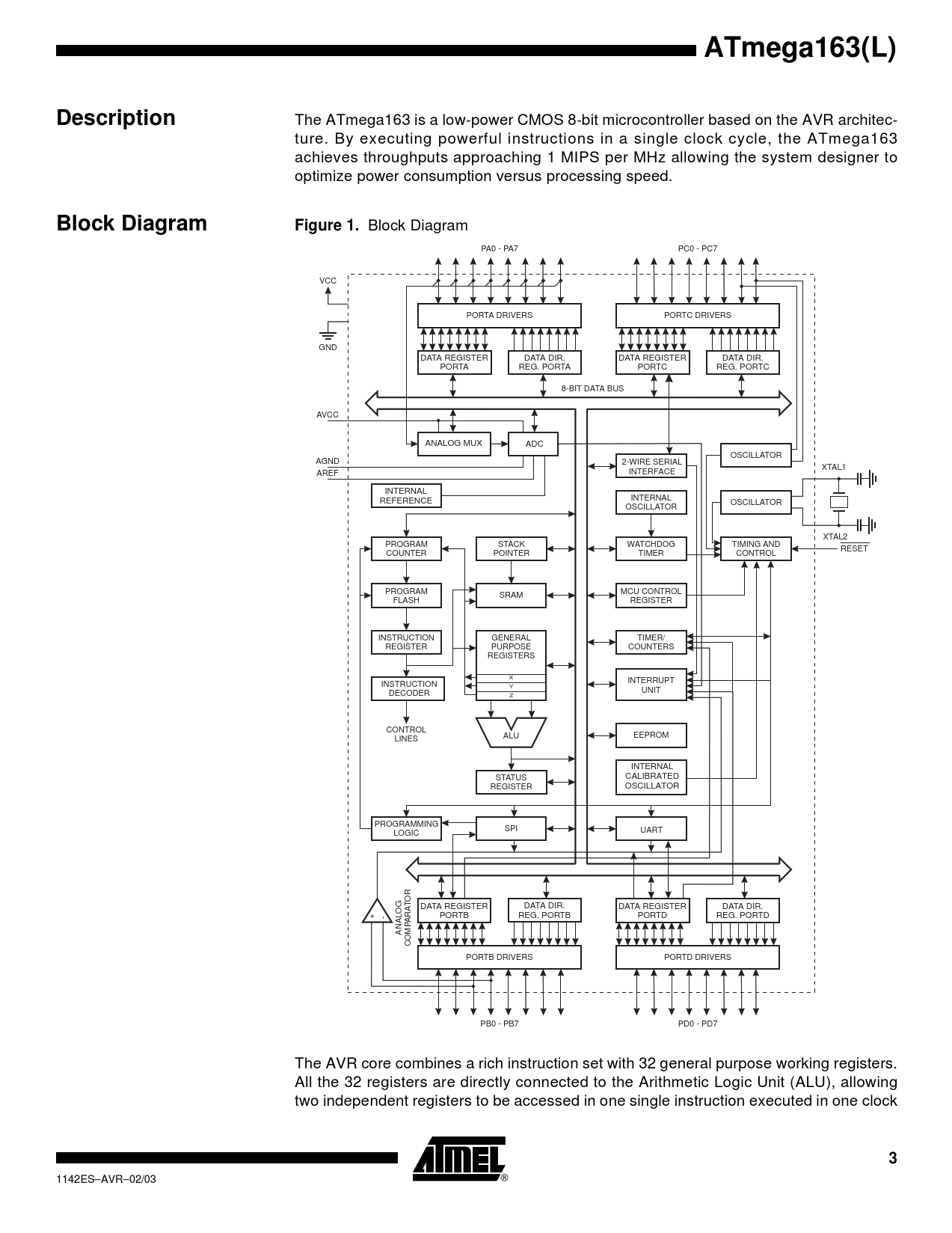 ATmega163(L)Description The ATmega163 is a low-power CMOS 8-bit microcontroller based on the AVR architec- ture. By executing powerful instructions in a single clock cycle, the ATmega163 achieves throughputs approaching 1 MIPS per MHz allowing the system designer to optimize power consumption versus processing speed. Block DiagramFigure 1. Block Diagram PA0 - PA7 PC0 - PC7 VCC PORTA DRIVERS PORTC DRIVERS GND DATA REGISTER DATA DIR. DATA REGISTER DATA DIR. PORTA REG. PORTA PORTC REG. PORTC 8-BIT DATA BUS AVCC ANALOG MUX ADC OSCILLATOR AGND 2-WIRE SERIAL XTAL1 AREF INTERFACE INTERNAL INTERNAL REFERENCE OSCILLATOR OSCILLATOR XTAL2 PROGRAM STACK WATCHDOG TIMING AND RESET COUNTER POINTER TIMER CONTROL PROGRAM MCU CONTROL SRAM FLASH REGISTER INSTRUCTION GENERAL TIMER/ REGISTER PURPOSE COUNTERS REGISTERS X INSTRUCTION INTERRUPT Y DECODER UNIT Z CONTROL ALU EEPROM LINES INTERNAL STATUS CALIBRATED REGISTER OSCILLATOR PROGRAMMING SPI LOGIC UART TOR DATA REGISTER DATA DIR. DATA REGISTER DATA DIR. + - PORTB REG. PORTB PORTD REG. PORTD ARA ANALOG COMP PORTB DRIVERS PORTD DRIVERS PB0 - PB7 PD0 - PD7 The AVR core combines a rich instruction set with 32 general purpose working registers. All the 32 registers are directly connected to the Arithmetic Logic Unit (ALU), allowing two independent registers to be accessed in one single instruction executed in one clock 3 1142ES–AVR–02/03 Document Outline Features Pin Configurations Description Block Diagram Pin Descriptions VCC GND Port A (PA7..PA0) Port B (PB7..PB0) Port C (PC7..PC0) Port D (PD7..PD0) RESET XTAL1 XTAL2 AVCC AREF AGND Register Summary Instruction Set Summary Ordering Information Packaging Information 44A 40P6 Erratas ATmega163(L) Errata Rev. F ChangeLog Changes from Rev. 1142C-09/01 to Rev. 1142D-09/02 Changes from Rev. 1142D-09/09 to Rev. 1142E-02/03