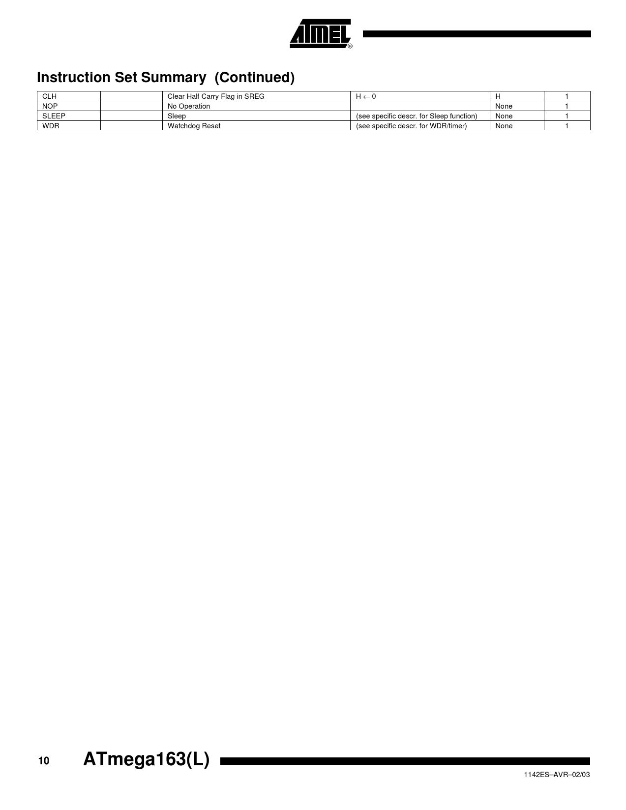 Páginas / Página18 / 10 — Instruction Set Summary (Continued). ATmega163(L)