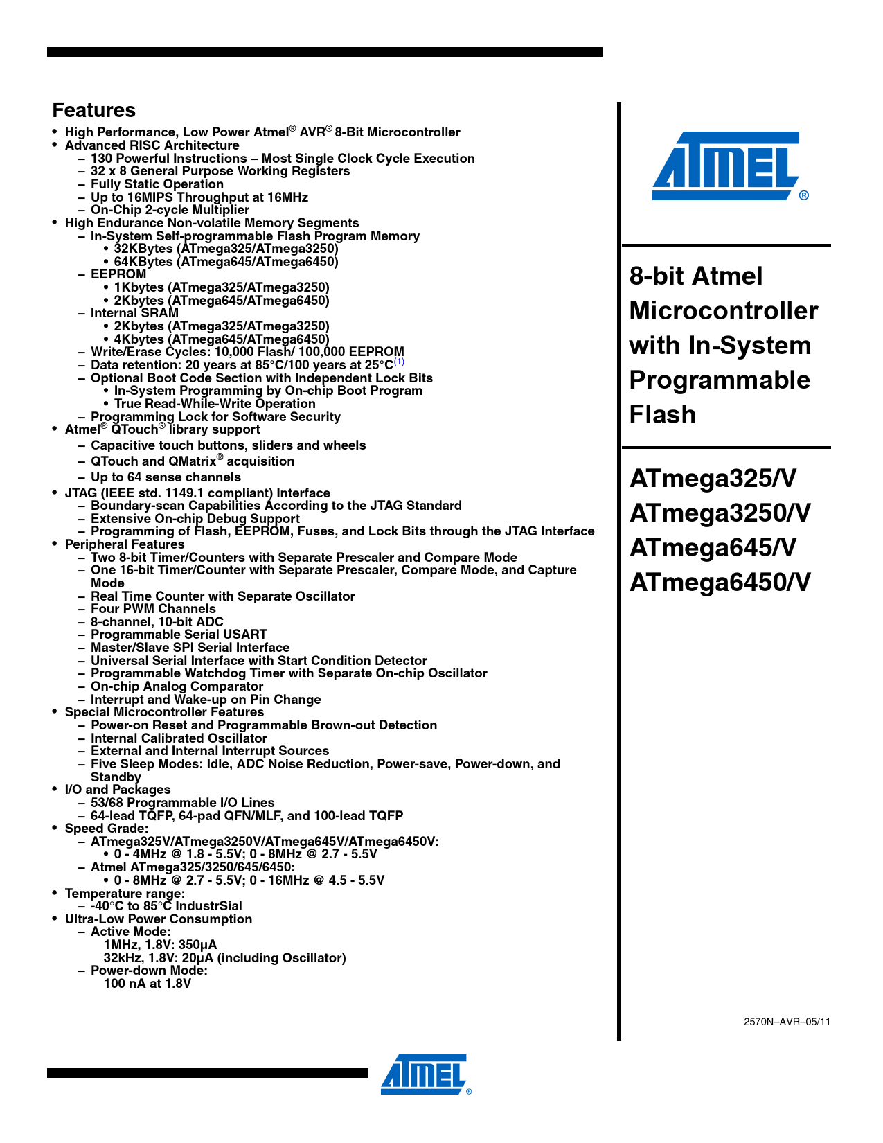link to page 9 Features • High Performance, Low Power Atmel ® AVR ® 8-Bit Microcontroller • Advanced RISC Architecture– 130 Powerful Instructions – Most Single Clock Cycle Execution – 32 x 8 General Purpose Working Registers – Fully Static Operation – Up to 16MIPS Throughput at 16MHz – On-Chip 2-cycle Multiplier • High Endurance Non-volatile Memory Segments– In-System Self-programmable Flash Program Memory• 32KBytes (ATmega325/ATmega3250) • 64KBytes (ATmega645/ATmega6450)– EEPROM8-bit Atmel• 1Kbytes (ATmega325/ATmega3250) • 2Kbytes (ATmega645/ATmega6450)– Internal SRAMMicrocontroller• 2Kbytes (ATmega325/ATmega3250) • 4Kbytes (ATmega645/ATmega6450)with In-System– Write/Erase Cycles: 10,000 Flash/ 100,000 EEPROM – Data retention: 20 years at 85°C/100 years at 25°C (1) – Optional Boot Code Section with Independent Lock BitsProgrammable• In-System Programming by On-chip Boot Program • True Read-While-Write Operation– Programming Lock for Software SecurityFlash • Atmel ® QTouch ® library support– Capacitive touch buttons, sliders and wheels – QTouch and QMatrix ® acquisition – Up to 64 sense channelsATmega325/V • JTAG (IEEE std. 1149.1 compliant) Interface– Boundary-scan Capabilities According to the JTAG Standard – Extensive On-chip Debug SupportATmega3250/V– Programming of Flash, EEPROM, Fuses, and Lock Bits through the JTAG Interface • Peripheral FeaturesATmega645/V– Two 8-bit Timer/Counters with Separate Prescaler and Compare Mode – One 16-bit Timer/Counter with Separate Prescaler, Compare Mode, and CaptureModeATmega6450/V– Real Time Counter with Separate Oscillator – Four PWM Channels – 8-channel, 10-bit ADC – Programmable Serial USART – Master/Slave SPI Serial Interface – Universal Serial Interface with Start Condition Detector – Programmable Watchdog Timer with Separate On-chip Oscillator – On-chip Analog Comparator – Interrupt and Wake-up on Pin Change • Special Microcontroller Features– Power-on Reset and Programmable Brown-out Detection – Internal Calibrated Oscillator – External and Internal Interrupt Sources – Five Sleep Modes: Idle, ADC Noise Reduction, Power-save, Power-down, andStandby • I/O and Packages– 53/68 Programmable I/O Lines – 64-lead TQFP, 64-pad QFN/MLF, and 100-lead TQFP • Speed Grade:– ATmega325V/ATmega3250V/ATmega645V/ATmega6450V:• 0 - 4MHz @ 1.8 - 5.5V; 0 - 8MHz @ 2.7 - 5.5V– Atmel ATmega325/3250/645/6450:• 0 - 8MHz @ 2.7 - 5.5V; 0 - 16MHz @ 4.5 - 5.5V • Temperature range:– -40 ° C to 85 ° C IndustrSial • Ultra-Low Power Consumption– Active Mode:1MHz, 1.8V: 350µA 32kHz, 1.8V: 20µA (including Oscillator)– Power-down Mode:100 nA at 1.8V 2570N–AVR–05/11 Document Outline Features 1. Pin Configurations 2. Overview 2.1 Block Diagram 2.2 Comparison between ATmega325, ATmega3250, ATmega645 and ATmega6450 2.3 Pin Descriptions 2.3.1 VCC 2.3.2 GND 2.3.3 Port A (PA7..PA0) 2.3.4 Port B (PB7..PB0) 2.3.5 Port C (PC7..PC0) 2.3.6 Port D (PD7..PD0) 2.3.7 Port E (PE7..PE0) 2.3.8 Port F (PF7..PF0) 2.3.9 Port G (PG5..PG0) 2.3.10 Port H (PH7..PH0) 2.3.11 Port J (PJ6..PJ0) 2.3.12 RESET 2.3.13 XTAL1 2.3.14 XTAL2 2.3.15 AVCC 2.3.16 AREF 3. Resources 4. Data Retention 5. About Code Examples 6. Capacitive touch sensing 7. AVR CPU Core 7.1 Overview 7.2 Architectural Overview 7.3 ALU – Arithmetic Logic Unit 7.4 Status Register 7.4.1 SREG – AVR Status Register 7.5 General Purpose Register File 7.5.1 The X-register, Y-register, and Z-register 7.6 Stack Pointer 7.7 Instruction Execution Timing 7.8 Reset and Interrupt Handling 7.8.1 Interrupt Response Time 8. AVR Memories 8.1 In-System Reprogrammable Flash Program Memory 8.2 SRAM Data Memory 8.2.1 Data Memory Access Times 8.3 EEPROM Data Memory 8.3.1 EEPROM Read/Write Access 8.3.2 EEPROM Write During Power-down Sleep Mode 8.3.3 Preventing EEPROM Corruption 8.4 I/O Memory 8.4.1 General Purpose I/O Registers 8.5 Register Description 8.5.1 EEARH and EEARL – The EEPROM Address Register 8.5.2 EEDR – The EEPROM Data Register 8.5.3 EECR – The EEPROM Control Register 8.5.4 GPIOR2 – General Purpose I/O Register 2 8.5.5 GPIOR1 – General Purpose I/O Register 1 8.5.6 GPIOR0 – General Purpose I/O Register 0 9. System Clock and Clock Options 9.1 Clock Systems and their Distribution 9.1.1 CPU Clock – clkCPU 9.1.2 I/O Clock – clkI/O 9.1.3 Flash Clock – clkFLASH 9.1.4 Asynchronous Timer Clock – clkASY 9.1.5 ADC Clock – clkADC 9.2 Clock Sources 9.2.1 Default Clock Source 9.3 Crystal Oscillator 9.4 Low-frequency Crystal Oscillator 9.5 Calibrated Internal RC Oscillator 9.6 External Clock 9.7 Clock Output Buffer 9.8 Timer/Counter Oscillator 9.9 System Clock Prescaler 9.9.1 Switching Time 9.10 Register Description 9.10.1 OSCCAL – Oscillator Calibration Register 9.10.2 CLKPR – Clock Prescale Register 10. Power Management and Sleep Modes 10.1 Sleep Modes 10.2 Idle Mode 10.3 ADC Noise Reduction Mode 10.4 Power-down Mode 10.5 Power-save Mode 10.6 Standby Mode 10.7 Power Reduction Register 10.8 Minimizing Power Consumption 10.8.1 Analog to Digital Converter 10.8.2 Analog Comparator 10.8.3 Brown-out Detector 10.8.4 Internal Voltage Reference 10.8.5 Watchdog Timer 10.8.6 Port Pins 10.8.7 JTAG Interface and On-chip Debug System 10.9 Register Description 10.9.1 SMCR – Sleep Mode Control Register 10.9.2 PRR – Power Reduction Register 11. System Control and Reset 11.1 Resetting the AVR 11.2 Reset Sources 11.3 Power-on Reset 11.4 External Reset 11.5 Brown-out Detection 11.6 Watchdog Reset 11.7 Internal Voltage Reference 11.7.1 Voltage Reference Enable Signals and Start-up Time 11.8 Watchdog Timer 11.9 Timed Sequences for Changing the Configuration of the Watchdog Timer 11.9.1 Safety Level 1 11.9.2 Safety Level 2 11.10 Register Description 11.10.1 MCUSR – MCU Status Register 11.10.2 WDTCR – Watchdog Timer Control Register 12. Interrupts 12.1 Interrupt Vectors in Atmel ATmega325/3250/645/6450 12.2 Moving In