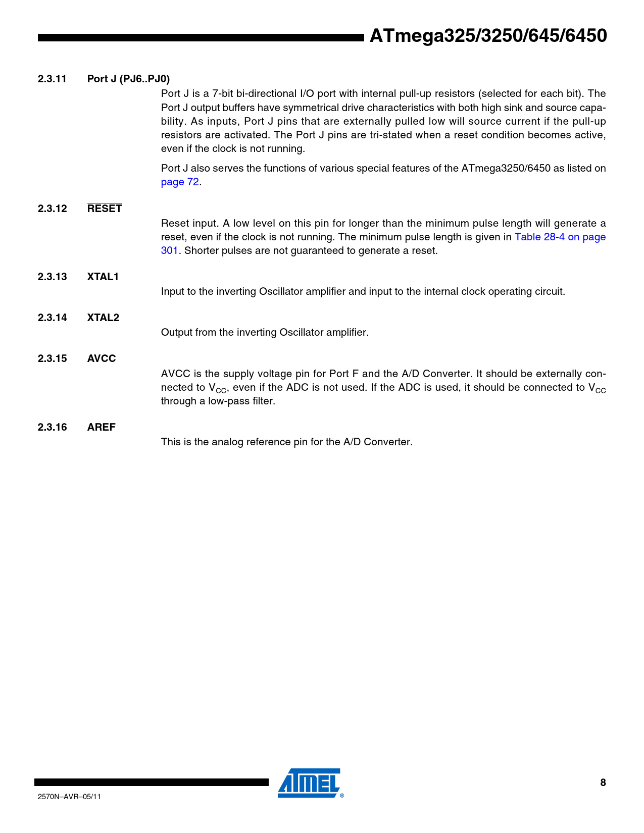 link to page 301 link to page 301 link to page 72 ATmega325/3250/645/64502.3.11Port J (PJ6..PJ0) Port J is a 7-bit bi-directional I/O port with internal pull-up resistors (selected for each bit). The Port J output buffers have symmetrical drive characteristics with both high sink and source capa- bility. As inputs, Port J pins that are externally pulled low will source current if the pull-up resistors are activated. The Port J pins are tri-stated when a reset condition becomes active, even if the clock is not running. Port J also serves the functions of various special features of the ATmega3250/6450 as listed on page 72. 2.3.12RESET Reset input. A low level on this pin for longer than the minimum pulse length will generate a reset, even if the clock is not running. The minimum pulse length is given in Table 28-4 on page 301. Shorter pulses are not guaranteed to generate a reset. 2.3.13XTAL1 Input to the inverting Oscillator amplifier and input to the internal clock operating circuit. 2.3.14XTAL2 Output from the inverting Oscillator amplifier. 2.3.15AVCC AVCC is the supply voltage pin for Port F and the A/D Converter. It should be externally con- nected to V , even if the ADC is not used. If the ADC is used, it should be connected to V CC CC through a low-pass filter. 2.3.16AREF This is the analog reference pin for the A/D Converter. 8 2570N–AVR–05/11 Document Outline Features 1. Pin Configurations 2. Overview 2.1 Block Diagram 2.2 Comparison between ATmega325, ATmega3250, ATmega645 and ATmega6450 2.3 Pin Descriptions 2.3.1 VCC 2.3.2 GND 2.3.3 Port A (PA7..PA0) 2.3.4 Port B (PB7..PB0) 2.3.5 Port C (PC7..PC0) 2.3.6 Port D (PD7..PD0) 2.3.7 Port E (PE7..PE0) 2.3.8 Port F (PF7..PF0) 2.3.9 Port G (PG5..PG0) 2.3.10 Port H (PH7..PH0) 2.3.11 Port J (PJ6..PJ0) 2.3.12 RESET 2.3.13 XTAL1 2.3.14 XTAL2 2.3.15 AVCC 2.3.16 AREF 3. Resources 4. Data Retention 5. About Code Examples 6. Capacitive touch sensing 7. AVR CPU Core 7.1 Overview 7.2 Architectural Overview 7.3 ALU – Arithmetic Logic Unit 7.4 Status Register 7.4.1 SREG – AVR Status Register 7.5 General Purpose Register File 7.5.1 The X-register, Y-register, and Z-register 7.6 Stack Pointer 7.7 Instruction Execution Timing 7.8 Reset and Interrupt Handling 7.8.1 Interrupt Response Time 8. AVR Memories 8.1 In-System Reprogrammable Flash Program Memory 8.2 SRAM Data Memory 8.2.1 Data Memory Access Times 8.3 EEPROM Data Memory 8.3.1 EEPROM Read/Write Access 8.3.2 EEPROM Write During Power-down Sleep Mode 8.3.3 Preventing EEPROM Corruption 8.4 I/O Memory 8.4.1 General Purpose I/O Registers 8.5 Register Description 8.5.1 EEARH and EEARL – The EEPROM Address Register 8.5.2 EEDR – The EEPROM Data Register 8.5.3 EECR – The EEPROM Control Register 8.5.4 GPIOR2 – General Purpose I/O Register 2 8.5.5 GPIOR1 – General Purpose I/O Register 1 8.5.6 GPIOR0 – General Purpose I/O Register 0 9. System Clock and Clock Options 9.1 Clock Systems and their Distribution 9.1.1 CPU Clock – clkCPU 9.1.2 I/O Clock – clkI/O 9.1.3 Flash Clock – clkFLASH 9.1.4 Asynchronous Timer Clock – clkASY 9.1.5 ADC Clock – clkADC 9.2 Clock Sources 9.2.1 Default Clock Source 9.3 Crystal Oscillator 9.4 Low-frequency Crystal Oscillator 9.5 Calibrated Internal RC Oscillator 9.6 External Clock 9.7 Clock Output Buffer 9.8 Timer/Counter Oscillator 9.9 System Clock Prescaler 9.9.1 Switching Time 9.10 Register Description 9.10.1 OSCCAL – Oscillator Calibration Register 9.10.2 CLKPR – Clock Prescale Register 10. Power Management and Sleep Modes 10.1 Sleep Modes 10.2 Idle Mode 10.3 ADC Noise Reduction Mode 10.4 Power-down Mode 10.5 Power-save Mode 10.6 Standby Mode 10.7 Power Reduction Register 10.8 Minimizing Power Consumption 10.8.1 Analog to Digital Converter 10.8.2 Analog Comparator 10.8.3 Brown-out Detector 10.8.4 Internal Voltage Reference 10.8.5 Watchdog Timer 10.8.6 Port Pins 10.8.7 JTAG Interface and On-chip Debug System 10.9 Register Description 10.9.1 SMCR – Sleep Mode Control Register 10.9.2 PRR – Power Reduction Register 11. System Control and Reset 11.1 Resetting the AVR 11.2 Reset Sources 11.3 Power-on Reset 11.4 External Reset 11.5 Brown-out Detection 11.6 Watchdog Reset 11.7 Internal Voltage Reference 11.7.1 Voltage Reference Enable Signals and Start-up Time 11.8 Watchdog Timer 11.9 Timed Sequences for Changing the Configuration of the Watchdog Timer 11.9.1 Safety Level 1 11.9.2 Safety Level 2 11.10 Register Description 11.10.1 MCUSR – MCU Status Register 11.10.2 WDTCR – Watchdog Timer Control Register 12. Interrupts 12.1 Interrupt Vectors in Atmel ATmega325/3250/645/6450 12.2 Moving Interrupts Between Application and Boot Space 12.3 Register Description 12.3.1 MCUCR – MCU Control Register 13. External Interrupts 13.1 Pin Change Interrupt Timing 13.2 Register Description 13.2.1 EICRA – External Interrupt Control Register A 13.2.2 EIMSK – External Interrupt Mask Register 13.2.3 EIFR – External Interrupt Flag Registe 13.2.4 PCMSK3 – Pin Change Mask Register 3(1) 13.2.5 PCMSK2 – Pin Change Mask Register 2(1) 13.2.6 PCMSK1 – Pin Change Mask Register 1 13.2.7 PCMSK0 – Pin Change Mask Register 0 14. I/O-Ports 14.1 Overview 14.2 Ports as General Digital I/O 14.2.1 Configuring the Pin 14.2.2 Toggling the Pin 14.2.3 Switching Between Input and Output 14.2.4 Reading the Pin Value 14.2.5 Digital Input Enable and Sleep Modes 14.2.6 Unconnected Pins 14.3 Alternate Port Functions 14.3.1 Alternate Functions of Port B 14.3.2 Alternate Functions of Port D 14.3.3 Alternate Functions of Port E 14.3.4 Alternate Functions of Port F 14.3.5 Alternate Functions of Port G 14.3.6 Alternate Functions of Port H 14.3.7 Alternate Functions of Port J 14.4 Register Description 14.4.1 MCUCR – MCU Control Register 14.4.2 PORTA – Port A Data Register 14.4.3 DDRA – Port A Data Direction Register 14.4.4 PINA – Port A Input Pins Address 14.4.5 PORTB – Port B Data Register 14.4.6 DDRB – Port B Data Direction Register 14.4.7 PINB – Port B Input Pins Ad