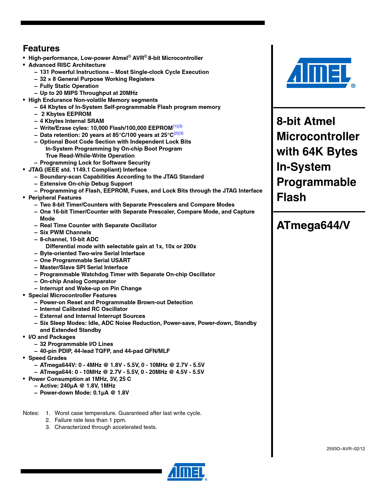 link to page 1 link to page 1 link to page 1 link to page 1 Features • High-performance, Low-power Atmel ® AVR ® 8-bit Microcontroller • Advanced RISC Architecture– 131 Powerful Instructions – Most Single-clock Cycle Execution – 32 × 8 General Purpose Working Registers – Fully Static Operation – Up to 20 MIPS Throughput at 20MHz • High Endurance Non-volatile Memory segments– 64 Kbytes of In-System Self-programmable Flash program memory – 2 Kbytes EEPROM – 4 Kbytes Internal SRAM8-bit Atmel– Write/Erase cyles: 10,000 Flash/100,000 EEPROM (1)(3) – Data retention: 20 years at 85°C/100 years at 25°C (2)(3) Microcontroller– Optional Boot Code Section with Independent Lock BitsIn-System Programming by On-chip Boot Programwith 64K BytesTrue Read-While-Write Operation– Programming Lock for Software Security • JTAG (IEEE std. 1149.1 Compliant) InterfaceIn-System– Boundary-scan Capabilities According to the JTAG Standard – Extensive On-chip Debug SupportProgrammable– Programming of Flash, EEPROM, Fuses, and Lock Bits through the JTAG Interface • Peripheral FeaturesFlash– Two 8-bit Timer/Counters with Separate Prescalers and Compare Modes – One 16-bit Timer/Counter with Separate Prescaler, Compare Mode, and CaptureMode– Real Time Counter with Separate OscillatorATmega644/V– Six PWM Channels – 8-channel, 10-bit ADCDifferential mode with selectable gain at 1x, 10x or 200x– Byte-oriented Two-wire Serial Interface – One Programmable Serial USART – Master/Slave SPI Serial Interface – Programmable Watchdog Timer with Separate On-chip Oscillator – On-chip Analog Comparator – Interrupt and Wake-up on Pin Change • Special Microcontroller Features– Power-on Reset and Programmable Brown-out Detection – Internal Calibrated RC Oscillator – External and Internal Interrupt Sources – Six Sleep Modes: Idle, ADC Noise Reduction, Power-save, Power-down, Standbyand Extended Standby • I/O and Packages– 32 Programmable I/O Lines – 40-pin PDIP, 44-lead TQFP, and 44-pad QFN/MLF • Speed Grades– ATmega644V: 0 - 4MHz @ 1.8V - 5.5V, 0 - 10MHz @ 2.7V - 5.5V – ATmega644: 0 - 10MHz @ 2.7V - 5.5V, 0 - 20MHz @ 4.5V - 5.5V • Power Consumption at 1MHz, 3V, 25 ⋅ C– Active: 240µA @ 1.8V, 1MHz – Power-down Mode: 0.1µA @ 1.8V Notes: 1. Worst case temperature. Guaranteed after last write cycle. 2. Failure rate less than 1 ppm. 3. Characterized through accelerated tests. 2593O–AVR–02/12 Document Outline Features 1. Pin Configurations 1.1 Disclaimer 2. Overview 2.1 Block Diagram 2.2 Pin Descriptions 2.2.1 VCC 2.2.2 GND 2.2.3 Port A (PA7:PA0) 2.2.4 Port B (PB7:PB0) 2.2.5 Port C (PC7:PC0) 2.2.6 Port D (PD7:PD0) 2.2.7 RESET 2.2.8 XTAL1 2.2.9 XTAL2 2.2.10 AVCC 2.2.11 AREF 3. Resources 4. About Code Examples 5. AVR CPU Core 5.1 Introduction 5.2 Architectural Overview 5.3 ALU – Arithmetic Logic Unit 5.4 Status Register 5.4.1 SREG – Status Register 5.5 General Purpose Register File 5.5.1 The X-register, Y-register, and Z-register 5.6 Stack Pointer 5.7 Instruction Execution Timing 5.8 Reset and Interrupt Handling 5.8.1 Interrupt Response Time 6. AVR Memories 6.1 In-System Reprogrammable Flash Program Memory 6.2 SRAM Data Memory 6.2.1 Data Memory Access Times 6.3 EEPROM Data Memory 6.3.1 EEPROM Read/Write Access 6.3.2 Preventing EEPROM Corruption 6.4 I/O Memory 6.4.1 General Purpose I/O Registers 6.5 Register Description 6.5.1 EEARH and EEARL – The EEPROM Address Register 6.5.2 EEDR – The EEPROM Data Register 6.5.3 EECR – The EEPROM Control Register 6.5.4 GPIOR2 – General Purpose I/O Register 2 6.5.5 GPIOR1 – General Purpose I/O Register 1 6.5.6 GPIOR0 – General Purpose I/O Register 0 7. System Clock and Clock Options 7.1 Clock Systems and their Distribution 7.1.1 CPU Clock – clkCPU 7.1.2 I/O Clock – clkI/O 7.1.3 Flash Clock – clkFLASH 7.1.4 Asynchronous Timer Clock – clkASY 7.1.5 ADC Clock – clkADC 7.2 Clock Sources 7.2.1 Default Clock Source 7.2.2 Clock Startup Sequence 7.2.3 Clock Source Connections 7.3 Low Power Crystal Oscillator 7.4 Full Swing Crystal Oscillator 7.5 Low Frequency Crystal Oscillator 7.6 Calibrated Internal RC Oscillator 7.7 128 kHz Internal Oscillator 7.8 External Clock 7.9 Clock Output Buffer 7.10 Timer/Counter Oscillator 7.11 System Clock Prescaler 7.12 Register Description 7.12.1 OSCCAL – Oscillator Calibration Register 7.12.2 CLKPR – Clock Prescale Register 8. Power Management and Sleep Modes 8.1 Overview 8.2 Sleep Modes 8.3 Idle Mode 8.4 ADC Noise Reduction Mode 8.5 Power-down Mode 8.6 Power-save Mode 8.7 Standby Mode 8.8 Extended Standby Mode 8.9 Power Reduction Register 8.10 Minimizing Power Consumption 8.10.1 Analog to Digital Converter 8.10.2 Analog Comparator 8.10.3 Brown-out Detector 8.10.4 Internal Voltage Reference 8.10.5 Watchdog Timer 8.10.6 Port Pins 8.10.7 On-chip Debug System 8.11 Register Description 8.11.1 SMCR – Sleep Mode Control Register 8.11.2 PRR – Power Reduction Register 9. System Control and Reset 9.1 Resetting the AVR 9.2 Reset Sources 9.2.1 Power-on Reset 9.2.2 External Reset 9.2.3 Brown-out Detection 9.2.4 Watchdog Reset 9.3 Internal Voltage Reference 9.3.1 Voltage Reference Enable Signals and Start-up Time 9.4 Watchdog Timer 9.5 Register Description 9.5.1 MCUSR – MCU Status Register 9.5.2 WDTCSR – Watchdog Timer Control Register 10. Interrupts 10.1 Interrupt Vectors in ATmega644 10.1.1 Moving Interrupts Between Application and Boot Space 10.2 Register Description 10.2.1 MCUCR – MCU Control Register 11. External Interrupts 11.1 Register Description 11.1.1 EICRA – External Interrupt Control Register A 11.1.2 EIMSK – External Interrupt Mask Register 11.1.3 EIFR – External Interrupt Flag Register 11.1.4 PCICR – Pin Change Interrupt Control Register 11.1.5 PCIFR – Pin Change Interrupt Flag Register 11.1.6 PCMSK3 – Pin Change Mask Register 3 11.1.7 PCMSK2 – Pin Change Mask Register 2 11.1.8 PCMSK1 – Pin Change Mask Register 1 11.1.9 PCMSK0 – Pi