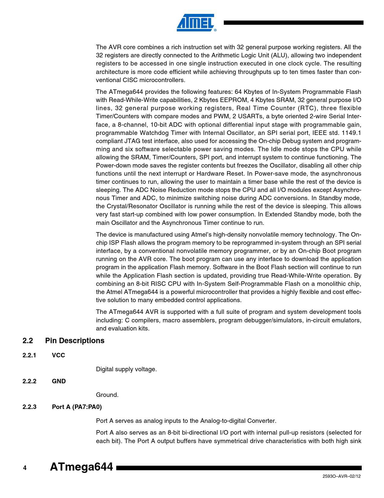 2.2 Pin Descriptions 2.2.1 VCC 2.2.2 GND 2.2.3 Port A (PA7:PA0) ATmega644