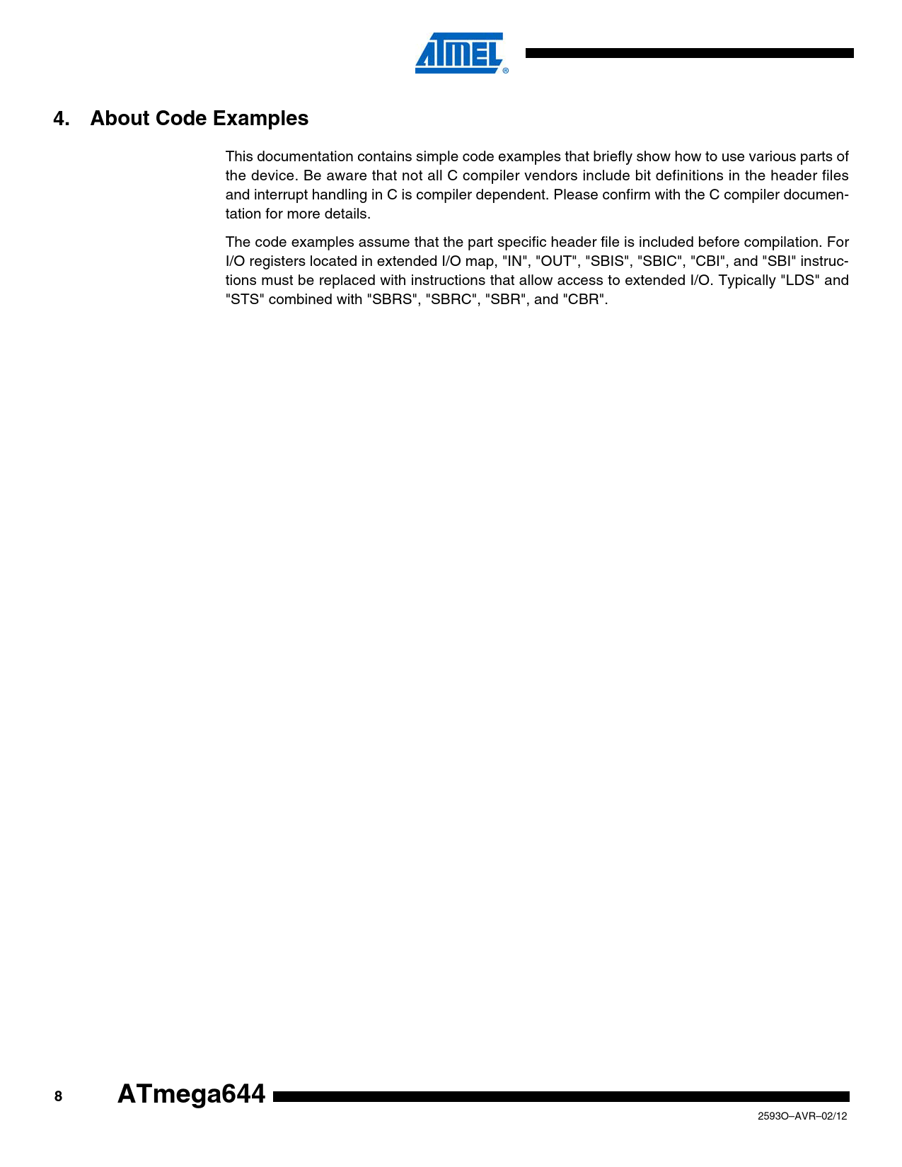 4.About Code Examples This documentation contains simple code examples that briefly show how to use various parts of the device. Be aware that not all C compiler vendors include bit definitions in the header files and interrupt handling in C is compiler dependent. Please confirm with the C compiler documen- tation for more details. The code examples assume that the part specific header file is included before compilation. For I/O registers located in extended I/O map, "IN", "OUT", "SBIS", "SBIC", "CBI", and "SBI" instruc- tions must be replaced with instructions that allow access to extended I/O. Typically "LDS" and "STS" combined with "SBRS", "SBRC", "SBR", and "CBR". 8ATmega644 2593O–AVR–02/12 Document Outline Features 1. Pin Configurations 1.1 Disclaimer 2. Overview 2.1 Block Diagram 2.2 Pin Descriptions 2.2.1 VCC 2.2.2 GND 2.2.3 Port A (PA7:PA0) 2.2.4 Port B (PB7:PB0) 2.2.5 Port C (PC7:PC0) 2.2.6 Port D (PD7:PD0) 2.2.7 RESET 2.2.8 XTAL1 2.2.9 XTAL2 2.2.10 AVCC 2.2.11 AREF 3. Resources 4. About Code Examples 5. AVR CPU Core 5.1 Introduction 5.2 Architectural Overview 5.3 ALU – Arithmetic Logic Unit 5.4 Status Register 5.4.1 SREG – Status Register 5.5 General Purpose Register File 5.5.1 The X-register, Y-register, and Z-register 5.6 Stack Pointer 5.7 Instruction Execution Timing 5.8 Reset and Interrupt Handling 5.8.1 Interrupt Response Time 6. AVR Memories 6.1 In-System Reprogrammable Flash Program Memory 6.2 SRAM Data Memory 6.2.1 Data Memory Access Times 6.3 EEPROM Data Memory 6.3.1 EEPROM Read/Write Access 6.3.2 Preventing EEPROM Corruption 6.4 I/O Memory 6.4.1 General Purpose I/O Registers 6.5 Register Description 6.5.1 EEARH and EEARL – The EEPROM Address Register 6.5.2 EEDR – The EEPROM Data Register 6.5.3 EECR – The EEPROM Control Register 6.5.4 GPIOR2 – General Purpose I/O Register 2 6.5.5 GPIOR1 – General Purpose I/O Register 1 6.5.6 GPIOR0 – General Purpose I/O Register 0 7. System Clock and Clock Options 7.1 Clock Systems and their Distribution 7.1.1 CPU Clock – clkCPU 7.1.2 I/O Clock – clkI/O 7.1.3 Flash Clock – clkFLASH 7.1.4 Asynchronous Timer Clock – clkASY 7.1.5 ADC Clock – clkADC 7.2 Clock Sources 7.2.1 Default Clock Source 7.2.2 Clock Startup Sequence 7.2.3 Clock Source Connections 7.3 Low Power Crystal Oscillator 7.4 Full Swing Crystal Oscillator 7.5 Low Frequency Crystal Oscillator 7.6 Calibrated Internal RC Oscillator 7.7 128 kHz Internal Oscillator 7.8 External Clock 7.9 Clock Output Buffer 7.10 Timer/Counter Oscillator 7.11 System Clock Prescaler 7.12 Register Description 7.12.1 OSCCAL – Oscillator Calibration Register 7.12.2 CLKPR – Clock Prescale Register 8. Power Management and Sleep Modes 8.1 Overview 8.2 Sleep Modes 8.3 Idle Mode 8.4 ADC Noise Reduction Mode 8.5 Power-down Mode 8.6 Power-save Mode 8.7 Standby Mode 8.8 Extended Standby Mode 8.9 Power Reduction Register 8.10 Minimizing Power Consumption 8.10.1 Analog to Digital Converter 8.10.2 Analog Comparator 8.10.3 Brown-out Detector 8.10.4 Internal Voltage Reference 8.10.5 Watchdog Timer 8.10.6 Port Pins 8.10.7 On-chip Debug System 8.11 Register Description 8.11.1 SMCR – Sleep Mode Control Register 8.11.2 PRR – Power Reduction Register 9. System Control and Reset 9.1 Resetting the AVR 9.2 Reset Sources 9.2.1 Power-on Reset 9.2.2 External Reset 9.2.3 Brown-out Detection 9.2.4 Watchdog Reset 9.3 Internal Voltage Reference 9.3.1 Voltage Reference Enable Signals and Start-up Time 9.4 Watchdog Timer 9.5 Register Description 9.5.1 MCUSR – MCU Status Register 9.5.2 WDTCSR – Watchdog Timer Control Register 10. Interrupts 10.1 Interrupt Vectors in ATmega644 10.1.1 Moving Interrupts Between Application and Boot Space 10.2 Register Description 10.2.1 MCUCR – MCU Control Register 11. External Interrupts 11.1 Register Description 11.1.1 EICRA – External Interrupt Control Register A 11.1.2 EIMSK – External Interrupt Mask Register 11.1.3 EIFR – External Interrupt Flag Register 11.1.4 PCICR – Pin Change Interrupt Control Register 11.1.5 PCIFR – Pin Change Interrupt Flag Register 11.1.6 PCMSK3 – Pin Change Mask Register 3 11.1.7 PCMSK2 – Pin Change Mask Register 2 11.1.8 PCMSK1 – Pin Change Mask Register 1 11.1.9 PCMSK0 – Pin Change Mask Register 0 12. I/O-Ports 12.1 Introduction 12.2 Ports as General Digital I/O 12.2.1 Configuring the Pin 12.2.2 Toggling the Pin 12.2.3 Switching Between Input and Output 12.2.4 Reading the Pin Value 12.2.5 Digital Input Enable and Sleep Modes 12.2.6 Unconnected Pins 12.3 Alternate Port Functions 12.3.1 Alternate Functions of Port A 12.3.2 Alternate Functions of Port B 12.3.3 Alternate Functions of Port C 12.3.4 Alternate Functions of Port D Register Description 12.3.5 MCUCR – MCU Control Register 12.3.6 PORTA – Port A Data Register 12.3.7 DDRA – Port A Data Direction Register 12.3.8 PINA – Port A Input Pins Address 12.3.9 PORTB – Port B Data Register 12.3.10 DDRB – Port B Data Direction Register 12.3.11 PINB – Port B Input Pins Address 12.3.12 PORTC – Port C Data Register 12.3.13 DDRC – Port C Data Direction Register 12.3.14 PINC – Port C Input Pins Address 12.3.15 PORTD – Port D Data Register 12.3.16 DDRD – Port D Data Direction Register 12.3.17 PIND – Port D Input Pins Address 13. 8-bit Timer/Counter0 with PWM 13.1 Feature 13.2 Overview 13.2.1 Registers 13.2.2 Definitions 13.3 Timer/Counter Clock Sources 13.4 Counter Unit 13.5 Output Compare Unit 13.5.1 Force Output Compare 13.5.2 Compare Match Blocking by TCNT0 Write 13.5.3 Using the Output Compare Unit 13.6 Compare Match Output Unit 13.6.1 Compare Output Mode and Waveform Generation 13.7 Modes of Operation 13.7.1 Normal Mode 13.7.2 Clear Timer on Compare Match (CTC) Mode 13.7.3 Fast PWM Mode 13.7.4 Phase Correct PWM Mode 13.8 Timer/Counter Timing Diagrams 13.9 Register Description 13.9.1 TCCR0A – Timer/Counter Control Register A 13.9.2 TCCR0B – Timer/Counter Control Register B 13.9.3 TCNT0 – Timer/Counter Register 13.9.4 OCR0A – Output Comp