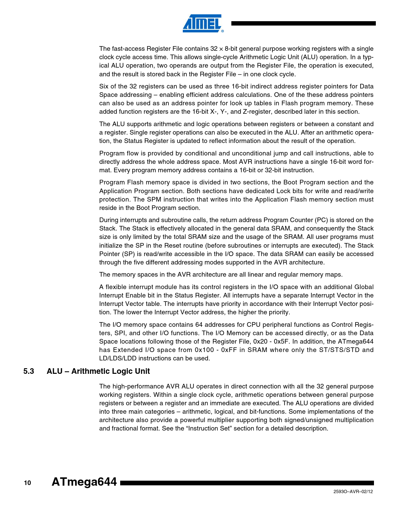 The fast-access Register File contains 32 × 8-bit general purpose working registers with a single clock cycle access time. This allows single-cycle Arithmetic Logic Unit (ALU) operation. In a typ- ical ALU operation, two operands are output from the Register File, the operation is executed, and the result is stored back in the Register File – in one clock cycle. Six of the 32 registers can be used as three 16-bit indirect address register pointers for Data Space addressing – enabling efficient address calculations. One of the these address pointers can also be used as an address pointer for look up tables in Flash program memory. These added function registers are the 16-bit X-, Y-, and Z-register, described later in this section. The ALU supports arithmetic and logic operations between registers or between a constant and a register. Single register operations can also be executed in the ALU. After an arithmetic opera- tion, the Status Register is updated to reflect information about the result of the operation. Program flow is provided by conditional and unconditional jump and call instructions, able to directly address the whole address space. Most AVR instructions have a single 16-bit word for- mat. Every program memory address contains a 16-bit or 32-bit instruction. Program Flash memory space is divided in two sections, the Boot Program section and the Application Program section. Both sections have dedicated Lock bits for write and read/write protection. The SPM instruction that writes into the Application Flash memory section must reside in the Boot Program section. During interrupts and subroutine calls, the return address Program Counter (PC) is stored on the Stack. The Stack is effectively allocated in the general data SRAM, and consequently the Stack size is only limited by the total SRAM size and the usage of the SRAM. All user programs must initialize the SP in the Reset routine (before subroutines or interrupts are executed). The Stack Pointer (SP) is read/write accessible in the I/O space. The data SRAM can easily be accessed through the five different addressing modes supported in the AVR architecture. The memory spaces in the AVR architecture are all linear and regular memory maps. A flexible interrupt module has its control registers in the I/O space with an additional Global Interrupt Enable bit in the Status Register. All interrupts have a separate Interrupt Vector in the Interrupt Vector table. The interrupts have priority in accordance with their Interrupt Vector posi- tion. The lower the Interrupt Vector address, the higher the priority. The I/O memory space contains 64 addresses for CPU peripheral functions as Control Regis- ters, SPI, and other I/O functions. The I/O Memory can be accessed directly, or as the Data Space locations following those of the Register File, 0x20 - 0x5F. In addition, the ATmega644 has Extended I/O space from 0x100 - 0xFF in SRAM where only the ST/STS/STD and LD/LDS/LDD instructions can be used. 5.3ALU – Arithmetic Logic Unit The high-performance AVR ALU operates in direct connection with all the 32 general purpose working registers. Within a single clock cycle, arithmetic operations between general purpose registers or between a register and an immediate are executed. The ALU operations are divided into three main categories – arithmetic, logical, and bit-functions. Some implementations of the architecture also provide a powerful multiplier supporting both signed/unsigned multiplication and fractional format. See the “Instruction Set” section for a detailed description. 10ATmega644 2593O–AVR–02/12 Document Outline Features 1. Pin Configurations 1.1 Disclaimer 2. Overview 2.1 Block Diagram 2.2 Pin Descriptions 2.2.1 VCC 2.2.2 GND 2.2.3 Port A (PA7:PA0) 2.2.4 Port B (PB7:PB0) 2.2.5 Port C (PC7:PC0) 2.2.6 Port D (PD7:PD0) 2.2.7 RESET 2.2.8 XTAL1 2.2.9 XTAL2 2.2.10 AVCC 2.2.11 AREF 3. Resources 4. About Code Examples 5. AVR CPU Core 5.1 Introduction 5.2 Architectural Overview 5.3 ALU – Arithmetic Logic Unit 5.4 Status Register 5.4.1 SREG – Status Register 5.5 General Purpose Register File 5.5.1 The X-register, Y-register, and Z-register 5.6 Stack Pointer 5.7 Instruction Execution Timing 5.8 Reset and Interrupt Handling 5.8.1 Interrupt Response Time 6. AVR Memories 6.1 In-System Reprogrammable Flash Program Memory 6.2 SRAM Data Memory 6.2.1 Data Memory Access Times 6.3 EEPROM Data Memory 6.3.1 EEPROM Read/Write Access 6.3.2 Preventing EEPROM Corruption 6.4 I/O Memory 6.4.1 General Purpose I/O Registers 6.5 Register Description 6.5.1 EEARH and EEARL – The EEPROM Address Register 6.5.2 EEDR – The EEPROM Data Register 6.5.3 EECR – The EEPROM Control Register 6.5.4 GPIOR2 – General Purpose I/O Register 2 6.5.5 GPIOR1 – General Purpose I/O Register 1 6.5.6 GPIOR0 – General Purpose I/O Register 0 7. System Clock and Clock Options 7.1 Clock Systems and their Distribution 7.1.1 CPU Clock – clkCPU 7.1.2 I/O Clock – clkI/O 7.1.3 Flash Clock – clkFLASH 7.1.4 Asynchronous Timer Clock – clkASY 7.1.5 ADC Clock – clkADC 7.2 Clock Sources 7.2.1 Default Clock Source 7.2.2 Clock Startup Sequence 7.2.3 Clock Source Connections 7.3 Low Power Crystal Oscillator 7.4 Full Swing Crystal Oscillator 7.5 Low Frequency Crystal Oscillator 7.6 Calibrated Internal RC Oscillator 7.7 128 kHz Internal Oscillator 7.8 External Clock 7.9 Clock Output Buffer 7.10 Timer/Counter Oscillator 7.11 System Clock Prescaler 7.12 Register Description 7.12.1 OSCCAL – Oscillator Calibration Register 7.12.2 CLKPR – Clock Prescale Register 8. Power Management and Sleep Modes 8.1 Overview 8.2 Sleep Modes 8.3 Idle Mode 8.4 ADC Noise Reduction Mode 8.5 Power-down Mode 8.6 Power-save Mode 8.7 Standby Mode 8.8 Extended Standby Mode 8.9 Power Reduction Register 8.10 Minimizing Power Consumption 8.10.1 Analog to Digital Converter 8.10.2 Analog Comparator 8.10.3 Brown-out Detector 8.10.4 Internal Voltage Reference 8.10.5 Watchdog Timer 8.10.6 Port Pins 8.