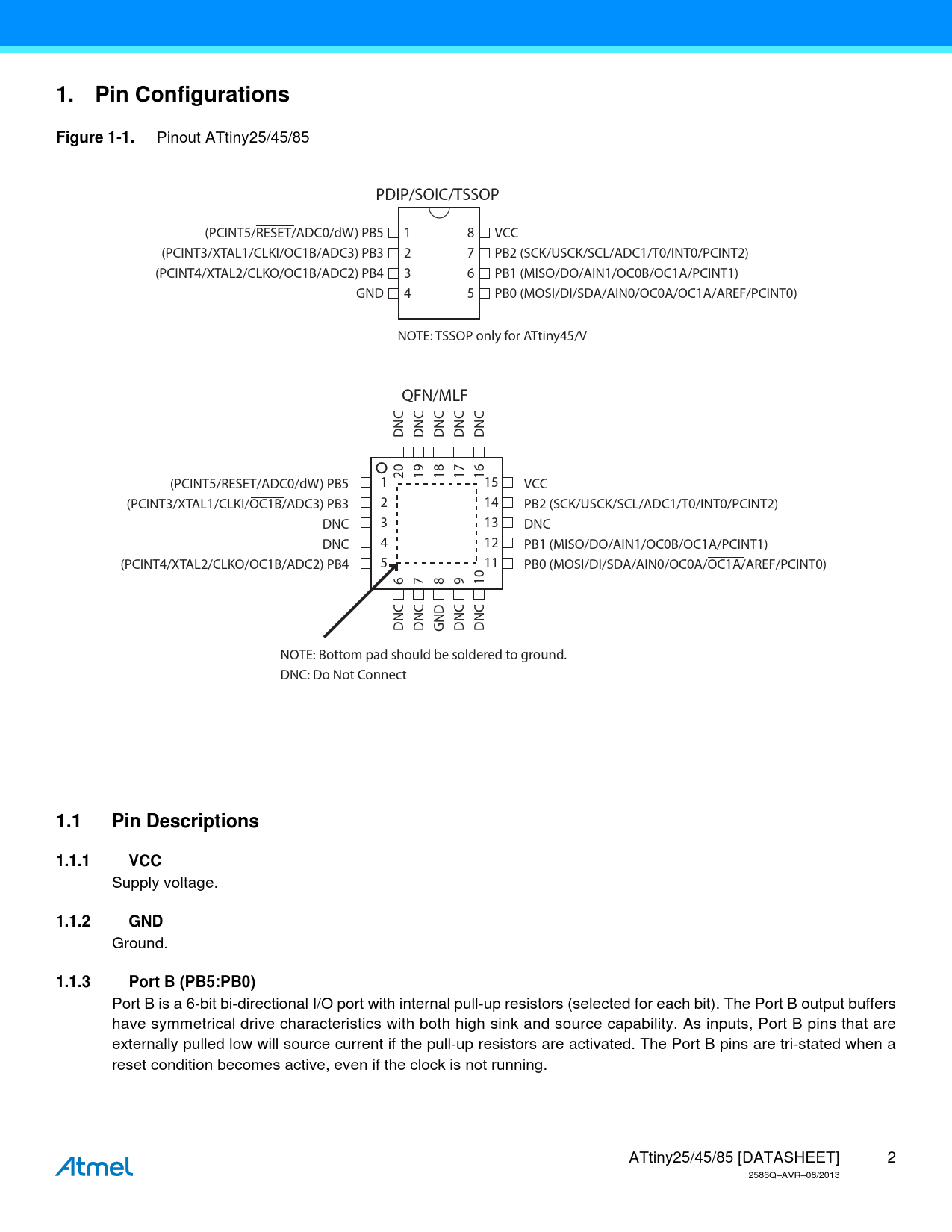 Pin Configurations. Figure 1-1. PDIP/SOIC/TSSOP. QFN/MLF. 1.1. Pin Descriptions. 1.1.1. VCC. 1.1.2. GND. 1.1.3. Port B (PB5:PB0)