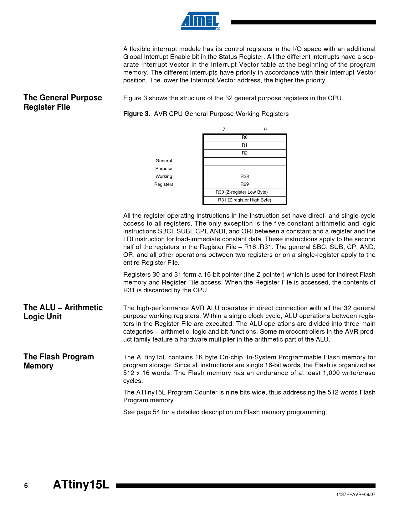 link to page 54 A flexible interrupt module has its control registers in the I/O space with an additional Global Interrupt Enable bit in the Status Register. All the different interrupts have a sep- arate Interrupt Vector in the Interrupt Vector table at the beginning of the program memory. The different interrupts have priority in accordance with their Interrupt Vector position. The lower the Interrupt Vector address, the higher the priority. The General Purpose Figure 3 shows the structure of the 32 general purpose registers in the CPU. Register FileFigure 3. AVR CPU General Purpose Working Registers 7 0 R0 R1 R2 General … Purpose … Working R28 Registers R29 R30 (Z-register Low Byte)R3 R31 (Z-register High Byte) All the register operating instructions in the instruction set have direct- and single-cycle access to all registers. The only exception is the five constant arithmetic and logic instructions SBCI, SUBI, CPI, ANDI, and ORI between a constant and a register and the LDI instruction for load-immediate constant data. These instructions apply to the second half of the registers in the Register File – R16..R31. The general SBC, SUB, CP, AND, OR, and all other operations between two registers or on a single-register apply to the entire Register File. Registers 30 and 31 form a 16-bit pointer (the Z-pointer) which is used for indirect Flash memory and Register File access. When the Register File is accessed, the contents of R31 is discarded by the CPU. The ALU – Arithmetic The high-performance AVR ALU operates in direct connection with all the 32 general Logic Unit purpose working registers. Within a single clock cycle, ALU operations between regis- ters in the Register File are executed. The ALU operations are divided into three main categories – arithmetic, logic and bit-functions. Some microcontrollers in the AVR prod- uct family feature a hardware multiplier in the arithmetic part of the ALU. The Flash Program The ATtiny15L contains 1K byte On-chip, In-System Programmable Flash memory for Memory program storage. Since all instructions are single 16-bit words, the Flash is organized as 512 x 16 words. The Flash memory has an endurance of at least 1,000 write/erase cycles. The ATtiny15L Program Counter is nine bits wide, thus addressing the 512 words Flash Program memory. See page 54 for a detailed description on Flash memory programming. 6ATtiny15L 1187H–AVR–09/07 Document Outline Features Pin Configuration Description Block Diagram Pin Descriptions VCC GND Port B (PB5..PB0) Analog Pins Internal Oscillators ATtiny15L Architectural Overview The General Purpose Register File The ALU - Arithmetic Logic Unit The Flash Program Memory The Program and Data Addressing Modes Register Direct, Single- register Rd Register Indirect Register Direct, Two Registers Rd and Rr I/O Direct Relative Program Addressing, RJMP and RCALL Constant Addressing using the LPM Instruction Subroutine and Interrupt Hardware Stack The EEPROM Data Memory Memory Access and Instruction Execution Timing I/O Memory The Status Register - SREG Reset and Interrupt Handling ATtiny15L Reset Sources Power-on Reset External Reset Brown-out Detection Watchdog Reset MCU Status Register - MCUSR Internal Voltage Reference Voltage Reference Enable Signals and Start-up Time Interrupt Handling Interrupt Response Time The General Interrupt Mask Register - GIMSK The General Interrupt Flag Register - GIFR The Timer/Counter Interrupt Mask Register - TIMSK The Timer/Counter Interrupt Flag Register - TIFR External Interrupt Pin Change Interrupt The MCU Control Register - MCUCR Sleep Modes Idle Mode ADC Noise Reduction Mode Power-down Mode Tuneable Internal RC Oscillator The System Clock Oscillator Calibration Register - OSCCAL Internal PLL for Fast Peripheral Clock Generation Timer/Counters The Timer/Counter0 Prescaler The Timer/Counter1 Prescaler The Special Function IO Register - SFIOR The 8-bit Timer/Counter0 The Timer/Counter0 Control Register - TCCR0 The Timer Counter 0 - TCNT0 The 8-bit Timer/Counter1 The Timer/Counter1 Control Register - TCCR1 The Timer/Counter1 - TCNT1 Timer/Counter1 Output Compare RegisterA - OCR1A Timer/Counter1 in PWM Mode Timer/Counter1 Output Compare RegisterB - OCR1B The Watchdog Timer The Watchdog Timer Control Register - WDTCR EEPROM Read/Write Access The EEPROM Address Register - EEAR The EEPROM Data Register - EEDR The EEPROM Control Register - EECR Preventing EEPROM Corruption The Analog Comparator The Analog Comparator Control and Status Register - ACSR The Analog-to-Digital Converter, Analog Multiplexer, and Gain Stages Features Operation Prescaling and Conversion Timing ADC Noise Canceler Function The ADC Multiplexer Selection Register - ADMUX The ADC Control and Status Register - ADCSR The ADC Data Register - ADCL and ADCH ADLAR = 0 ADLAR = 1 Scanning Multiple Channels ADC Noise-canceling Techniques ADC Characteristics I/O Port B Unconnected Pins Alternative Functions of Port B The Port B Data Register - PORTB The Port B Data Direction Register - DDRB The Port B Input Pins Address - PINB PORT B as General Digital I/O Alternate Functions of Port B Memory Programming Program and Data Memory Lock Bits Fuse Bits Signature Bytes Calibration Byte Programming the Flash High-voltage Serial Programming High-voltage Serial Programming Algorithm High-voltage Serial Programming Characteristics Low-voltage Serial Downloading Low-voltage Serial Programming Algorithm Data Polling Low-voltage Serial Programming Characteristics Electrical Characteristics Absolute Maximum Ratings DC Characteristics Typical Characteristics ATtiny15L Register Summary ATtiny15L Instruction Set Summary Ordering Information Packaging Information 8P3 8S2 Datasheet revision history Rev H - 09/07 Rev G - 06/07 Rev F - 06/05 Table of Contents